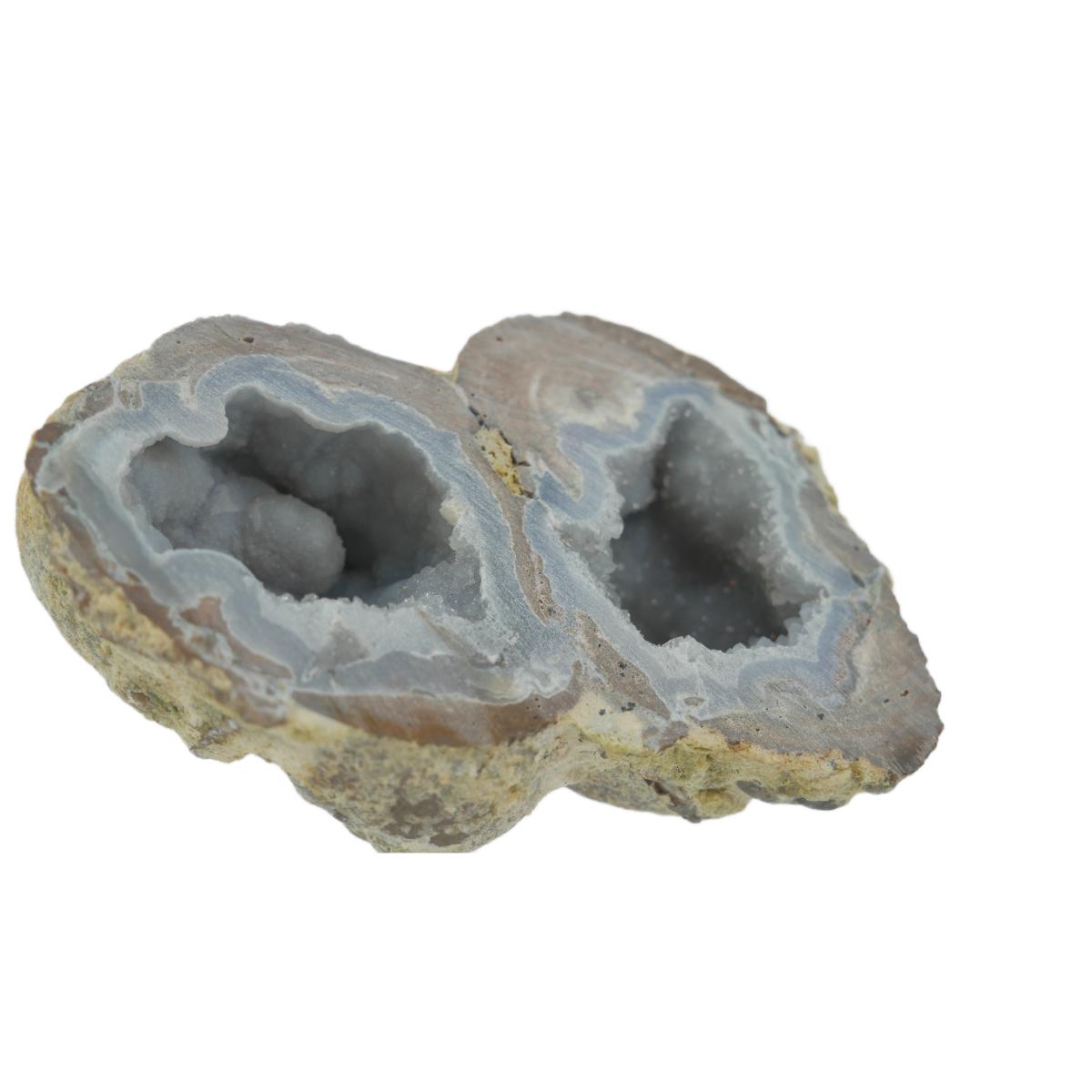 Three halved geode specimens. One is a dual geode cut with both halves and the other is one single half of a cut geode. Incredibly stunning pieces! Beautiful periwinkle blue/purple color. Superb condition! Stands not included. Largest measures L 4" x H 2" x W 2". Lot weighs 14 oz. (R14)