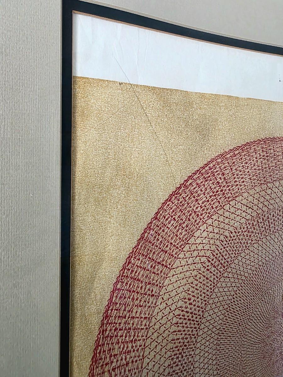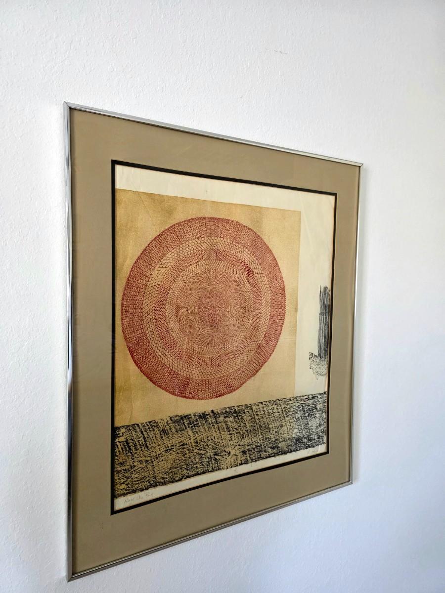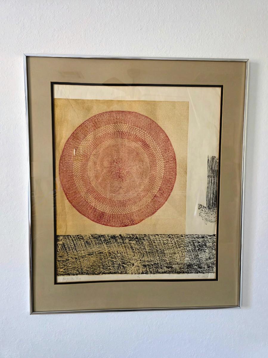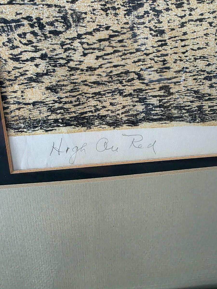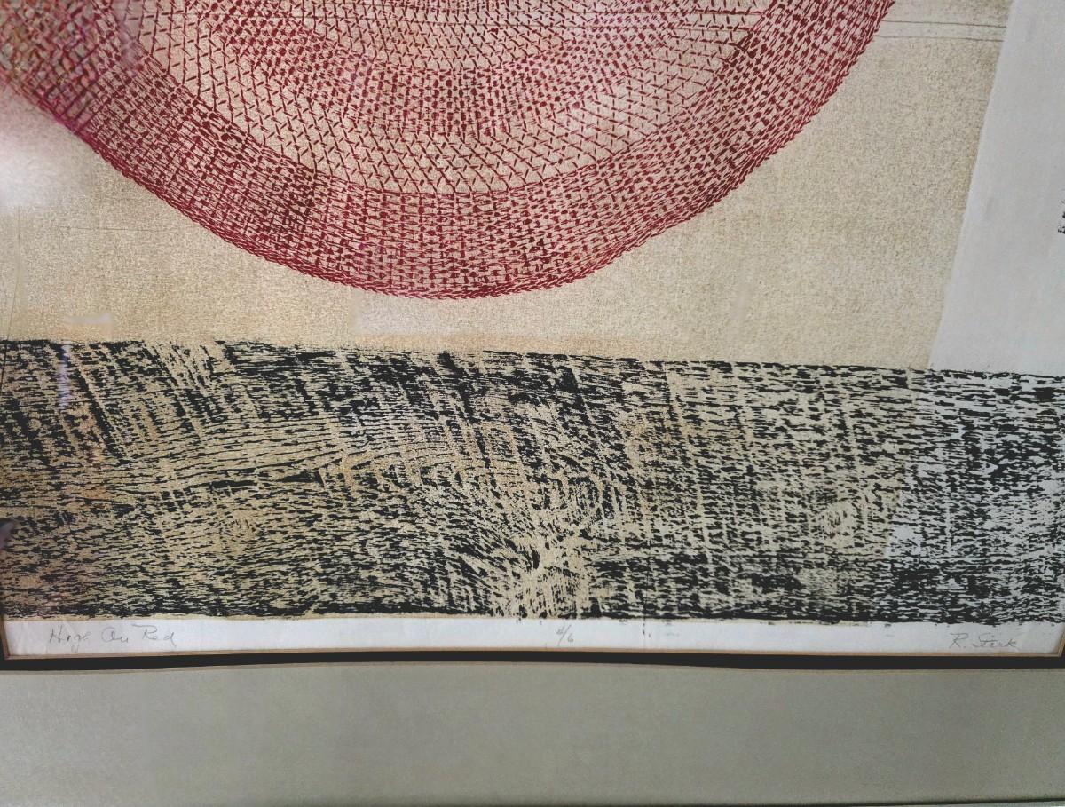 Mid-century modern geometric abstract lithograph, "High on Red" signed by R. Stark and numbered 4/6. Framed and matted.