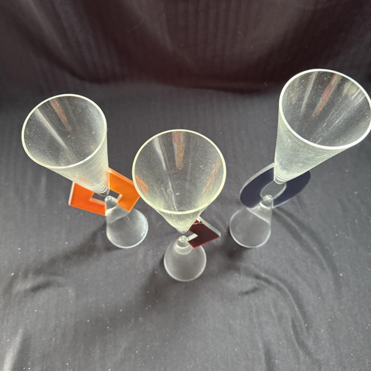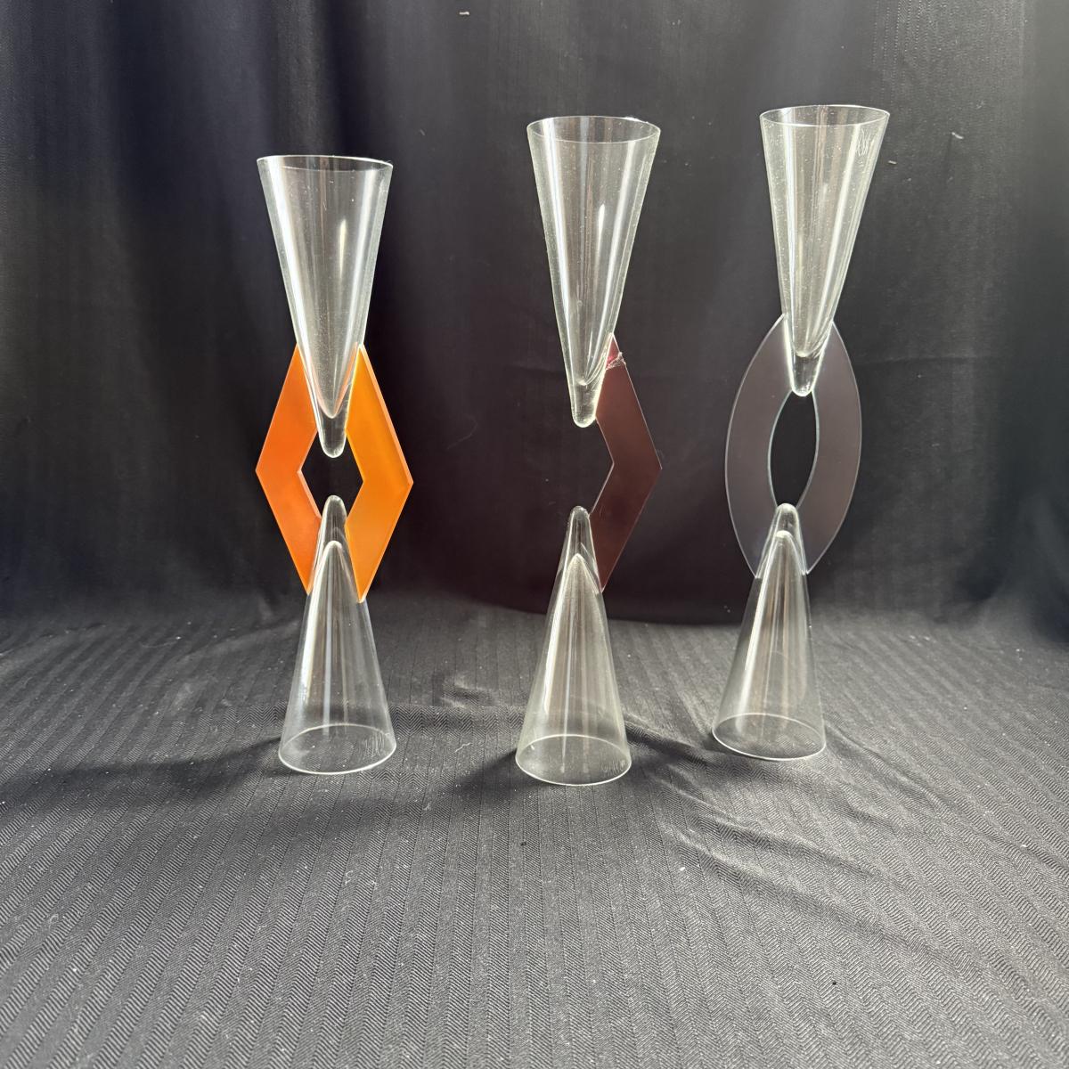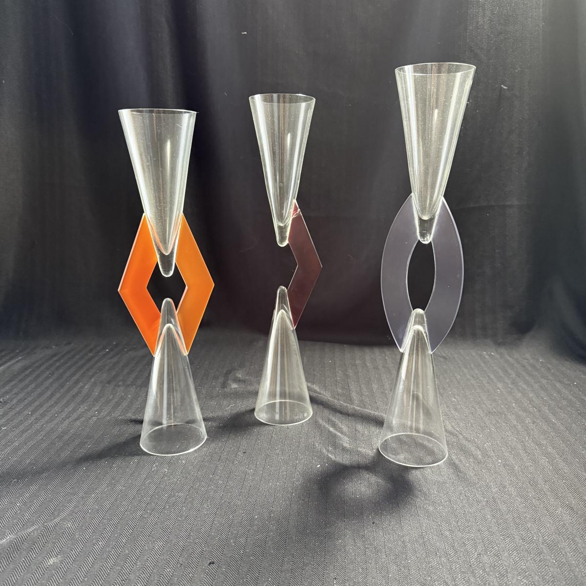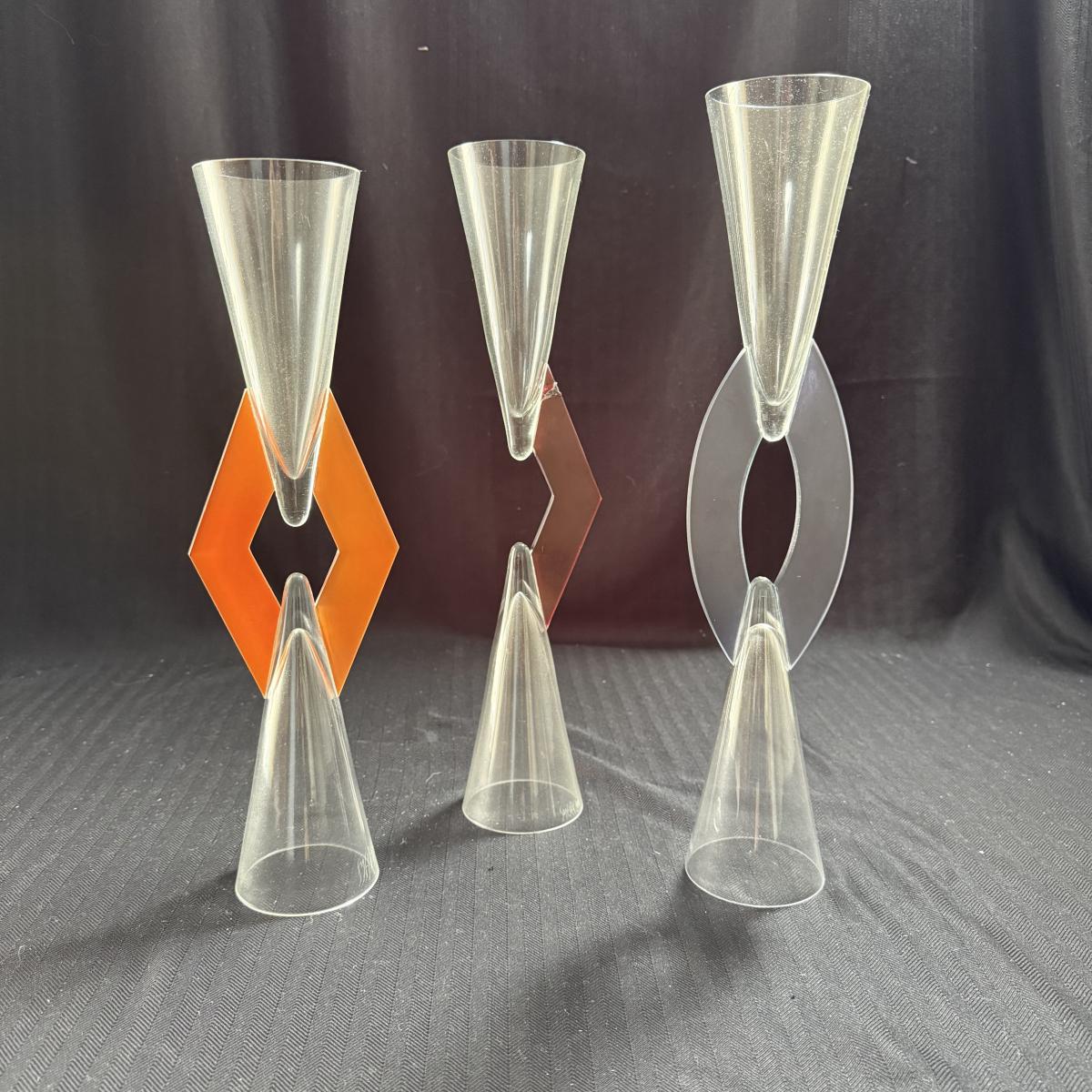 This lot contains three geometric glass art goblets. Each one has a unique handle with a different color. They are all about the same size, the orange stands 14.5”H the maroon handle stands 15”H and the lavender stands 15.5”H all of the mouths and base measure 3”D. There is a chip on the maroon handle, see pictures for details. There is an artist signature, but we were unable to discern the name. Shipping available.