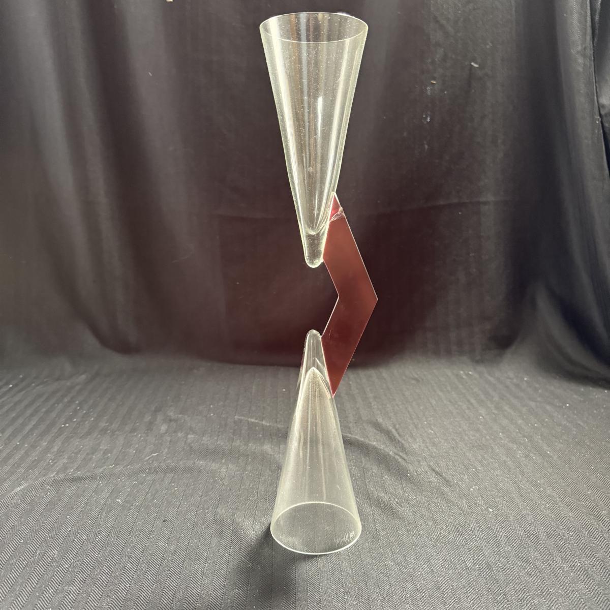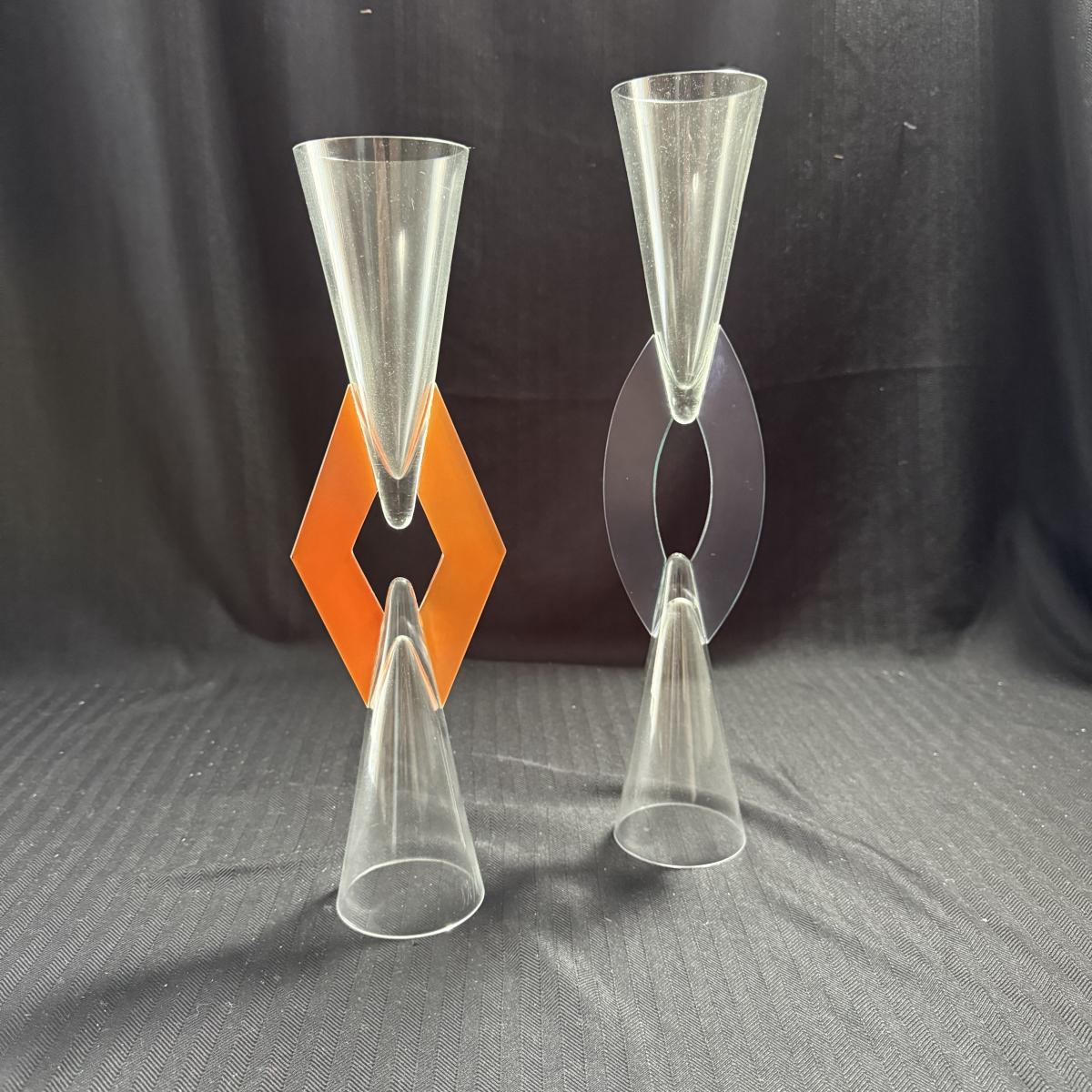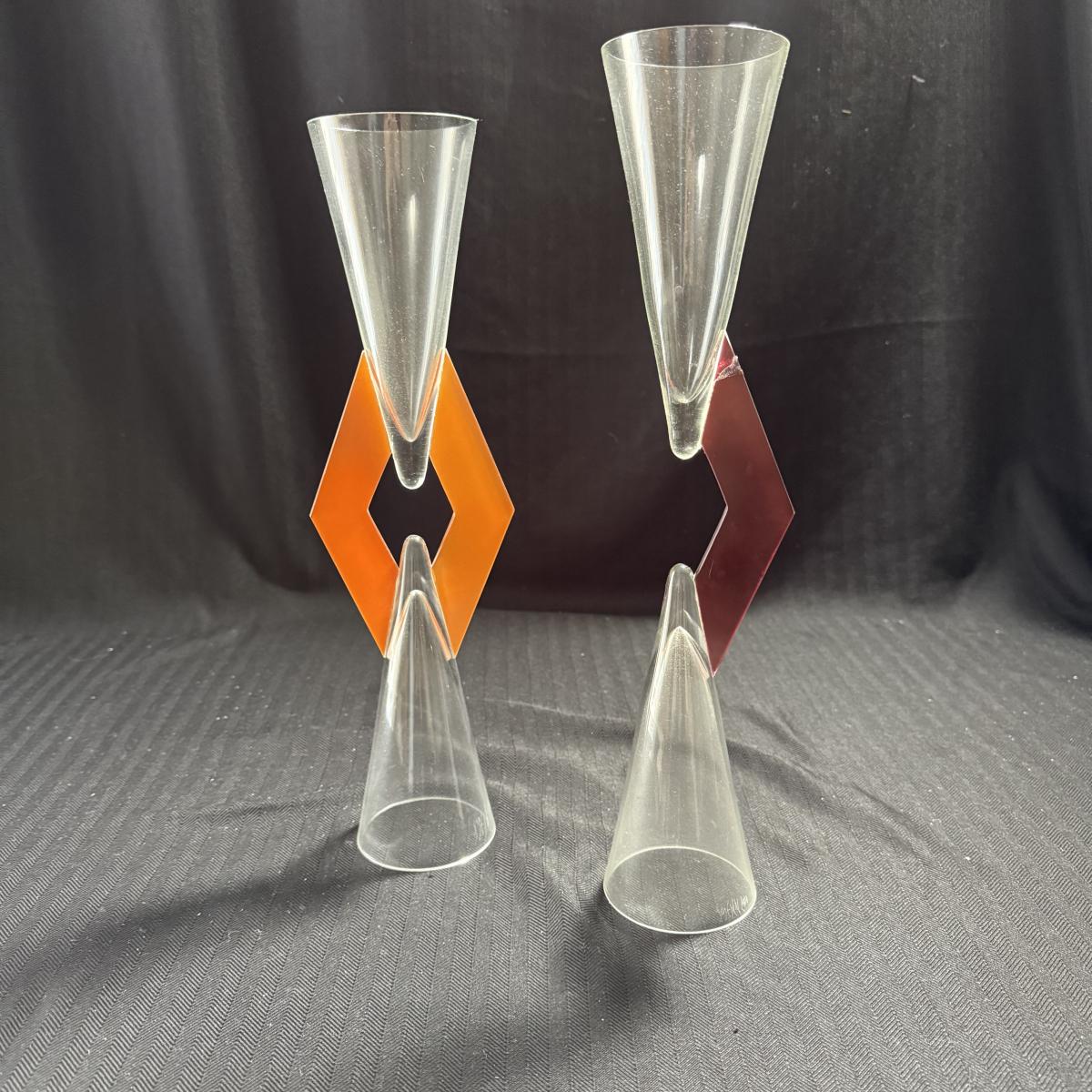 This lot contains three geometric glass art goblets. Each one has a unique handle with a different color. They are all about the same size, the orange stands 14.5”H the maroon handle stands 15”H and the lavender stands 15.5”H all of the mouths and base measure 3”D. There is a chip on the maroon handle, see pictures for details. There is an artist signature, but we were unable to discern the name. Shipping available.