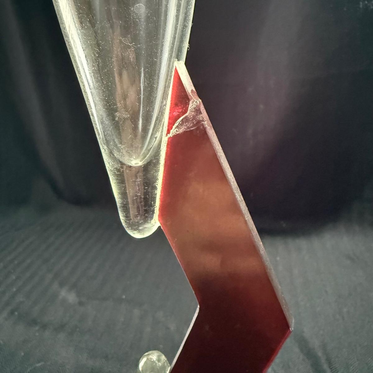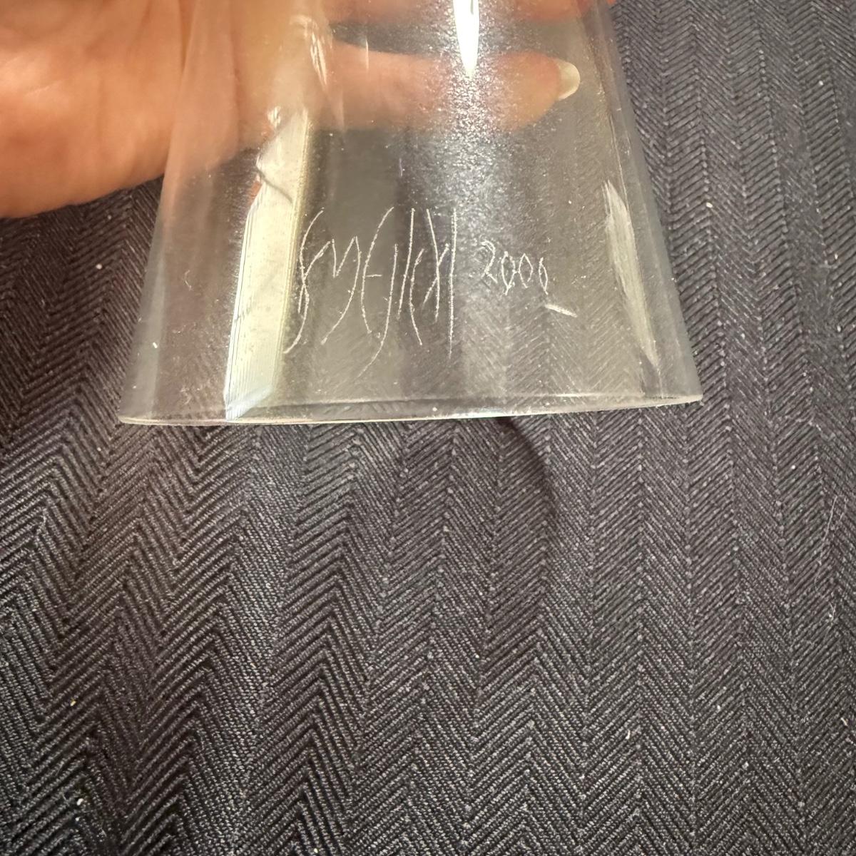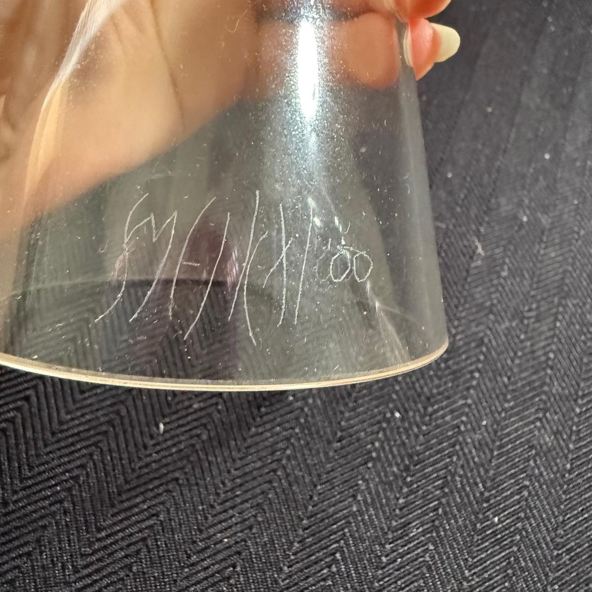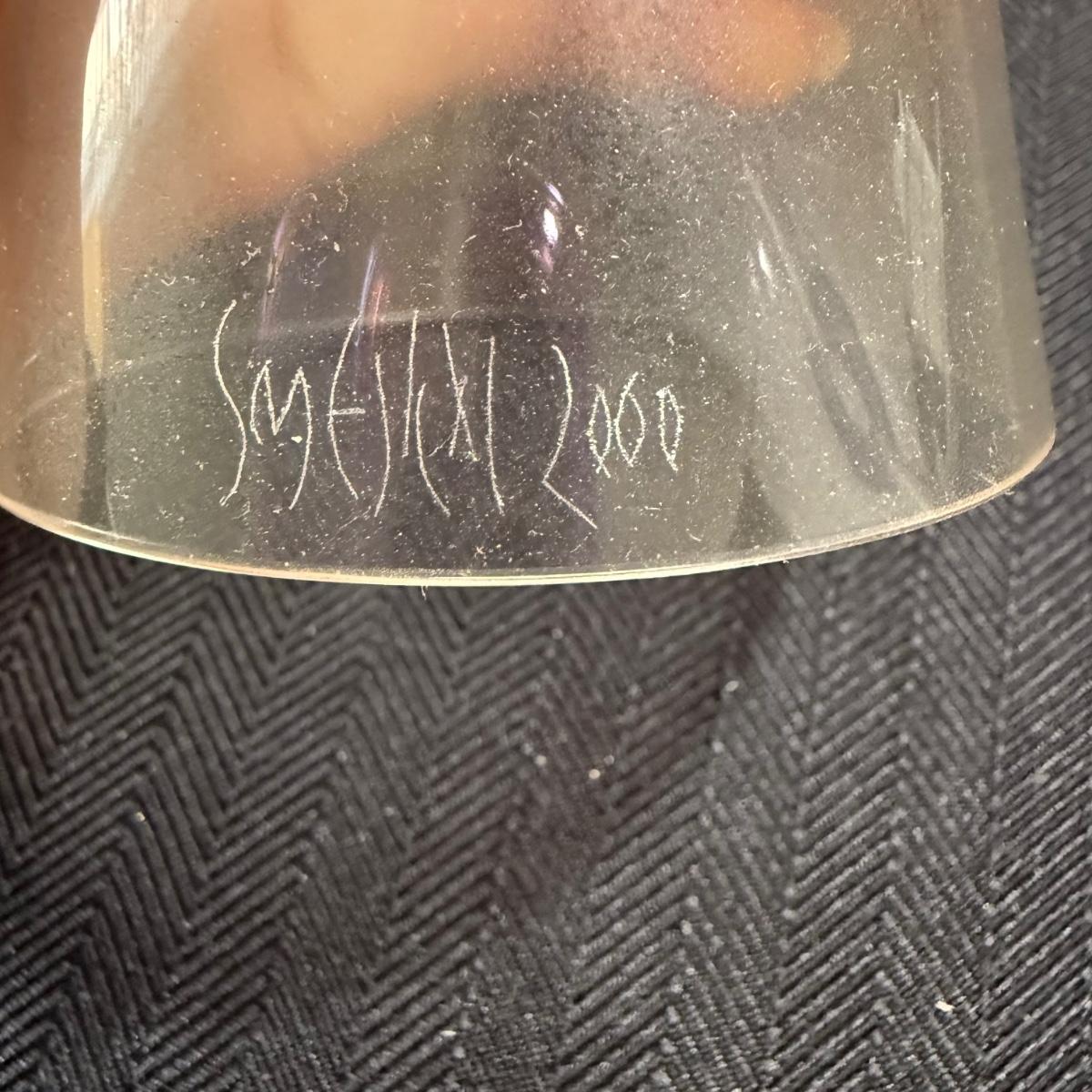 This lot contains three geometric glass art goblets. Each one has a unique handle with a different color. They are all about the same size, the orange stands 14.5”H the maroon handle stands 15”H and the lavender stands 15.5”H all of the mouths and base measure 3”D. There is a chip on the maroon handle, see pictures for details. There is an artist signature, but we were unable to discern the name. Shipping available.