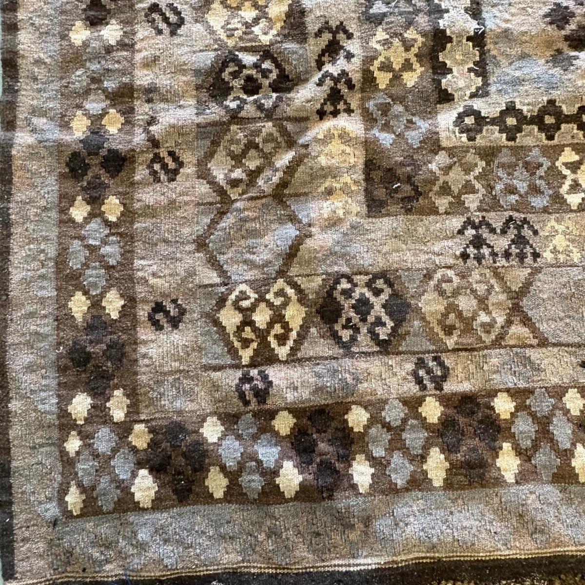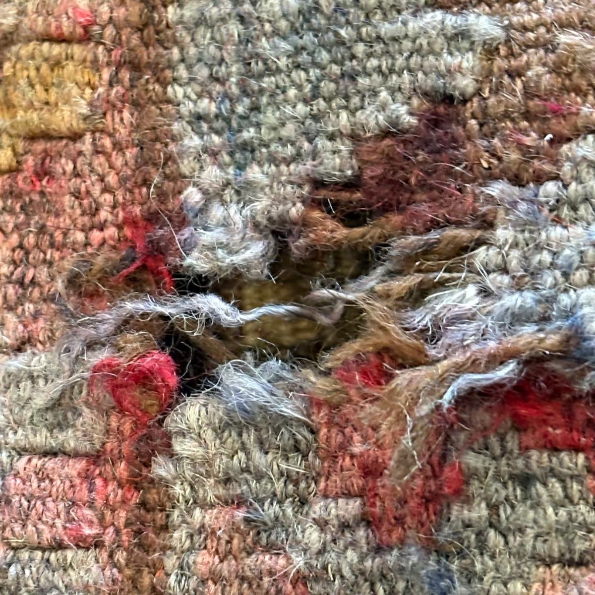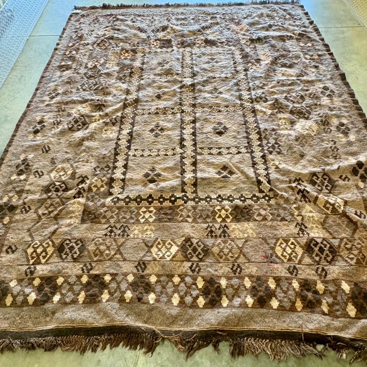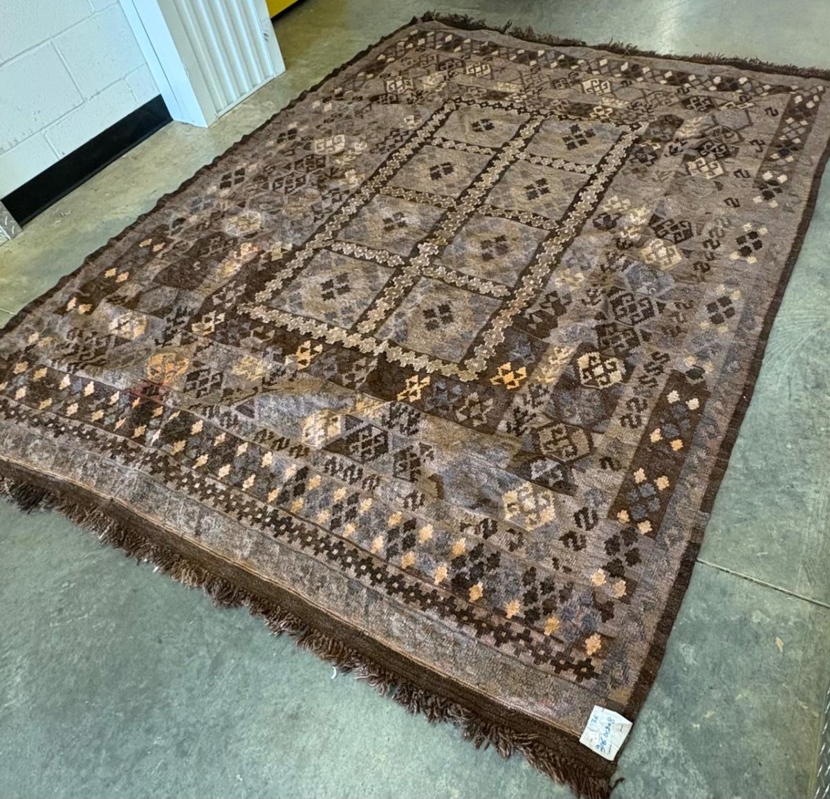 This rug appears to be wool and handmade. 6’4” x 8’9” including fringe. Slight reddish stain on one end and small holes (see pictures). No detectable odor.