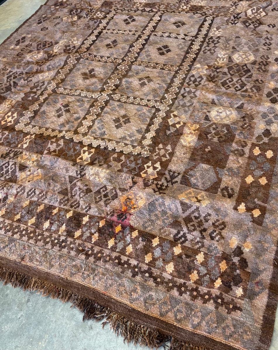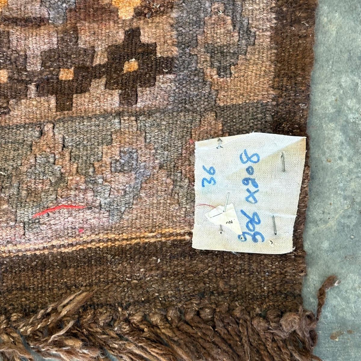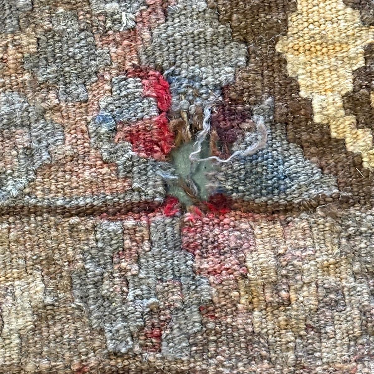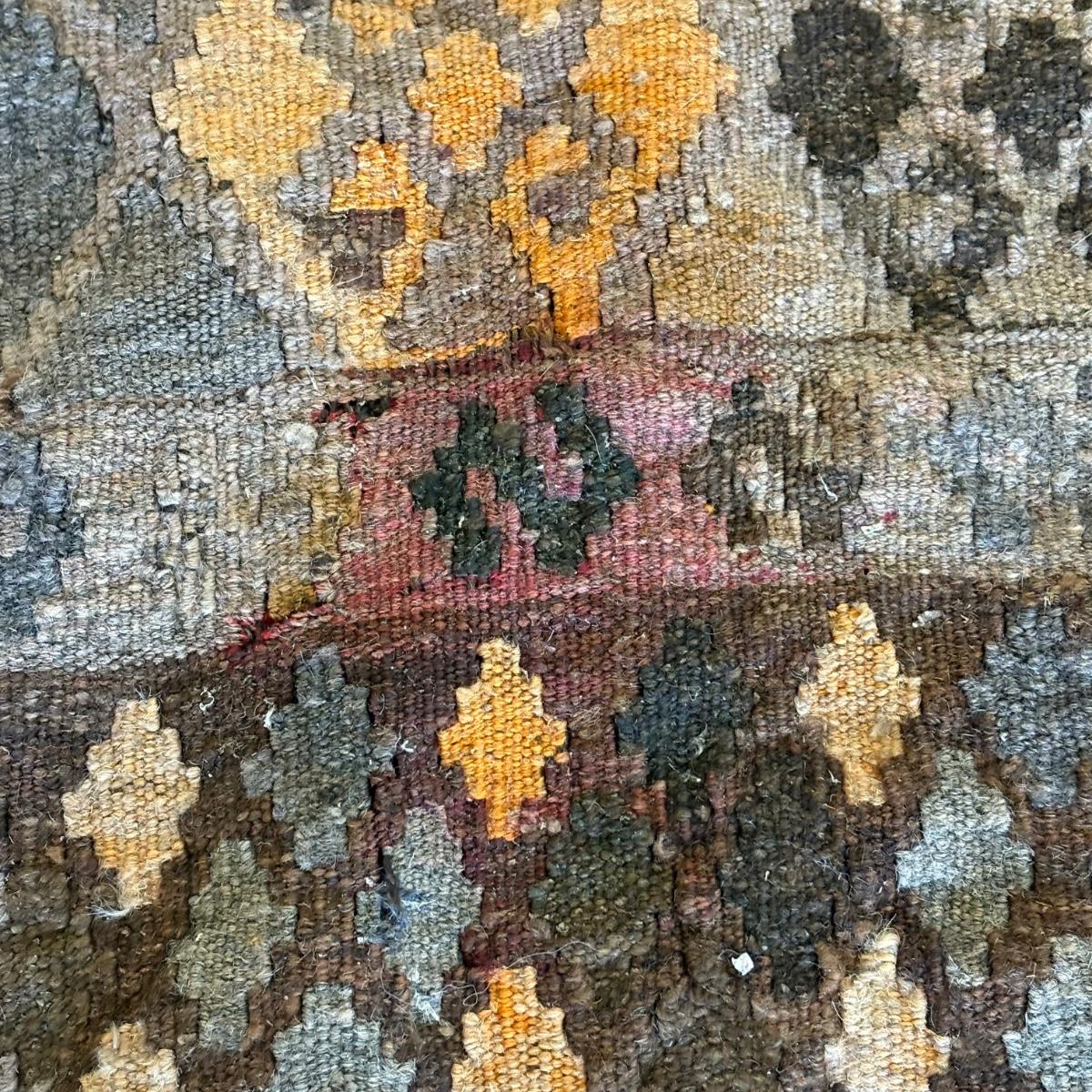 This rug appears to be wool and handmade. 6’4” x 8’9” including fringe. Slight reddish stain on one end and small holes (see pictures). No detectable odor.