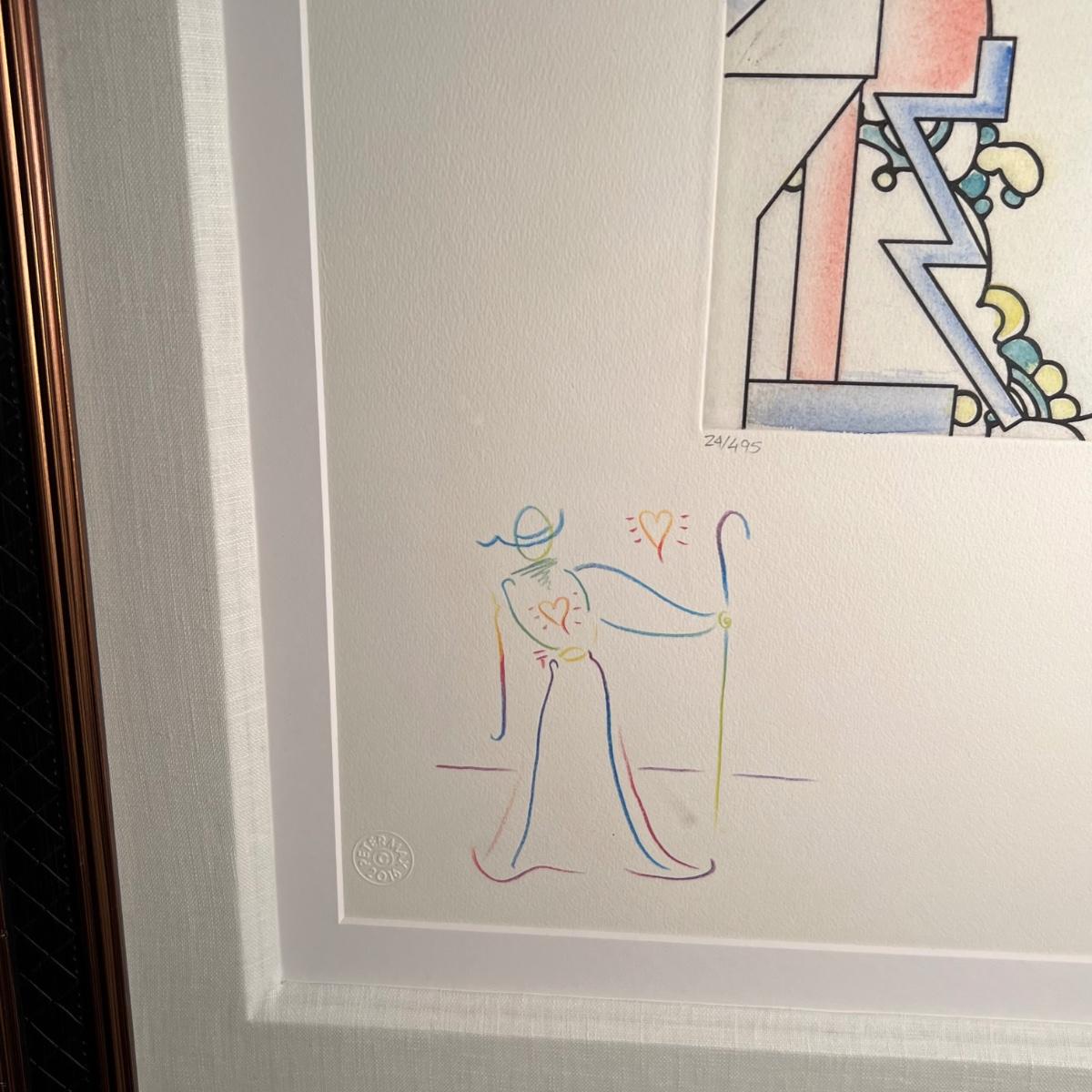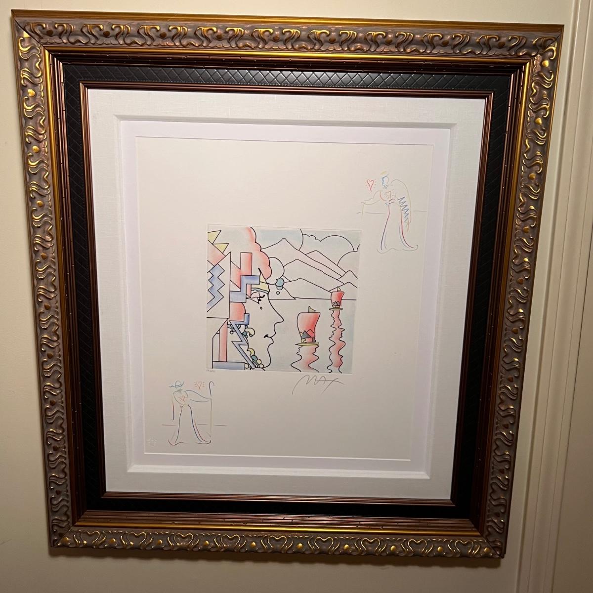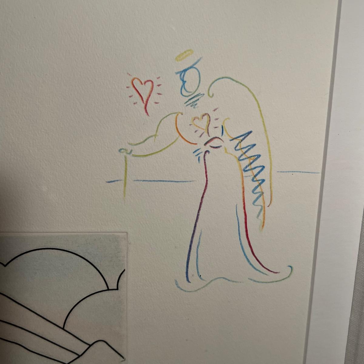 Etching with hand coloring and unique hand drawn colored pencil remarques of an angel with heart. This is one of five pieces of art by Peter Max in this sale, two more lots have matching ornate gilded frames to this one. See photo of accompanying COA for more detailed information about the art. It is matted, under glass and in an ornate gilded frame that measures 33” x 3” x 36”H.