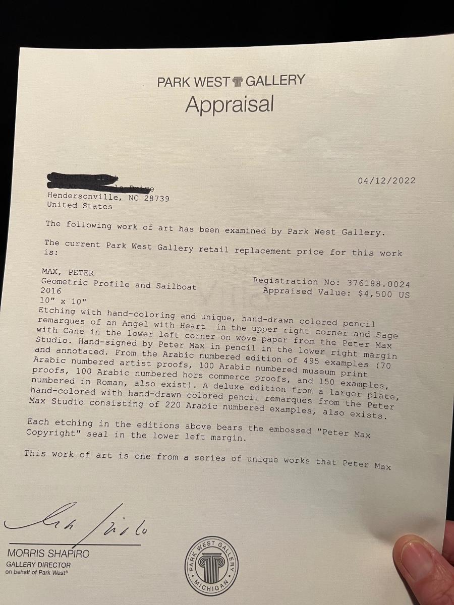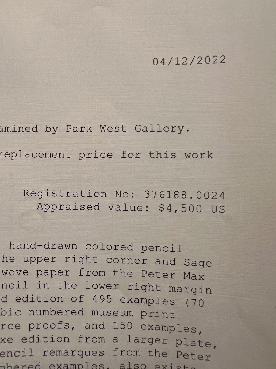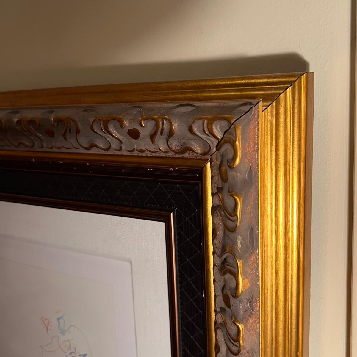 Etching with hand coloring and unique hand drawn colored pencil remarques of an angel with heart. This is one of five pieces of art by Peter Max in this sale, two more lots have matching ornate gilded frames to this one. See photo of accompanying COA for more detailed information about the art. It is matted, under glass and in an ornate gilded frame that measures 33” x 3” x 36”H.