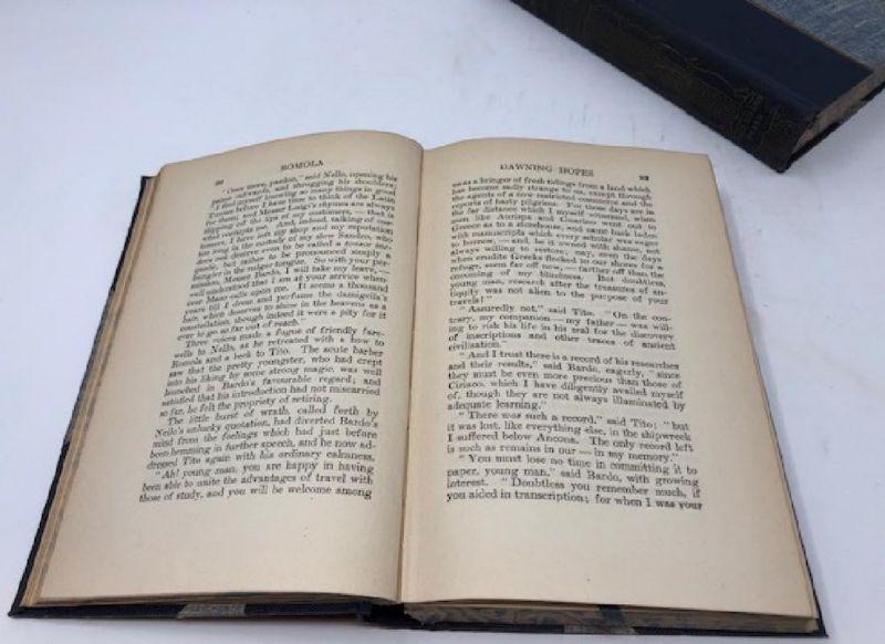 Description: Three Sirens Press, New York 1934 of George Eliot's (1819-1881), Romola, Part I & II. Mary Ann Evans, known by her pen name George Eliot, was an English novelist, poet, journalist, translator, and one of the leading writers of the Victorian era. She wrote seven novels, including Middelmarch; most of which are set in provincial England and known for their realism, psychological and political insight. Two-volume set; blue decorative marble hardcover and blue patterned outside cuts on pages. Firm bindings; slight discoloration of interior pages. Material: paper. Measurement: approximate 8.5"h x 5.5"w (INCHES). Shipping cost: $30; different rate for Alaska, California & Hawaii;. International rate applies.