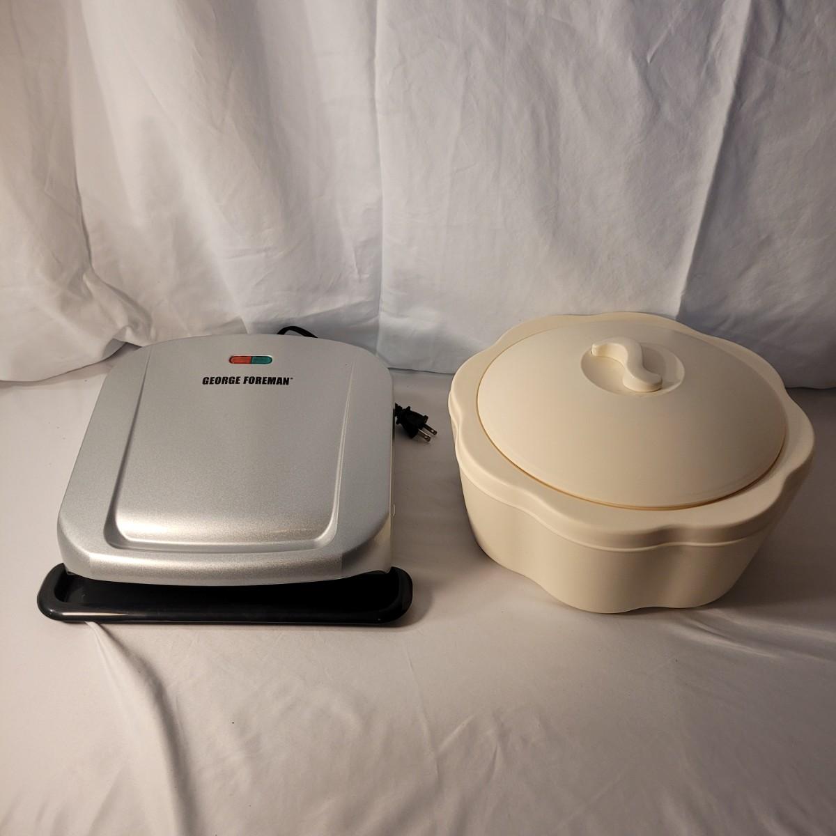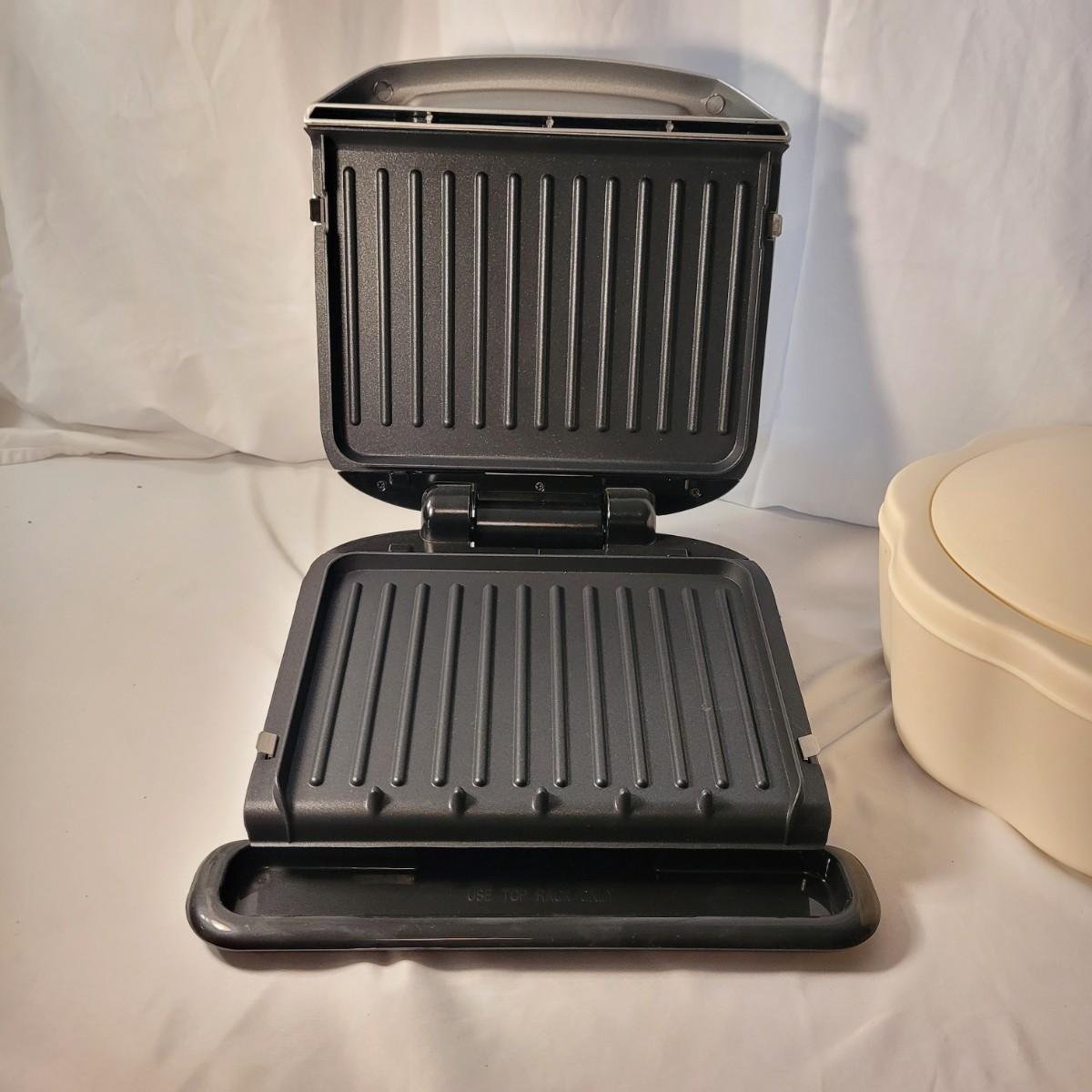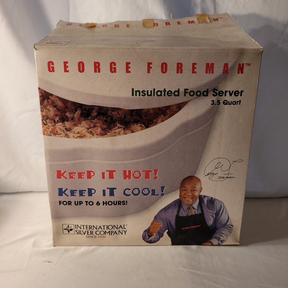 This four serving George Foreman grill and 3.5 QT insulated food server appears to be unused. Item powers on when plugged in. Shipping available.