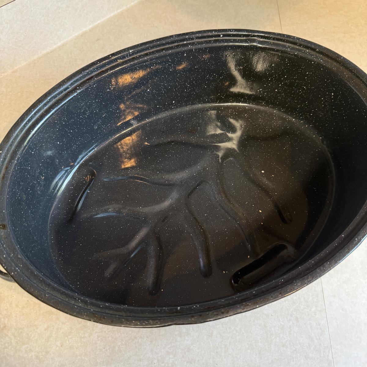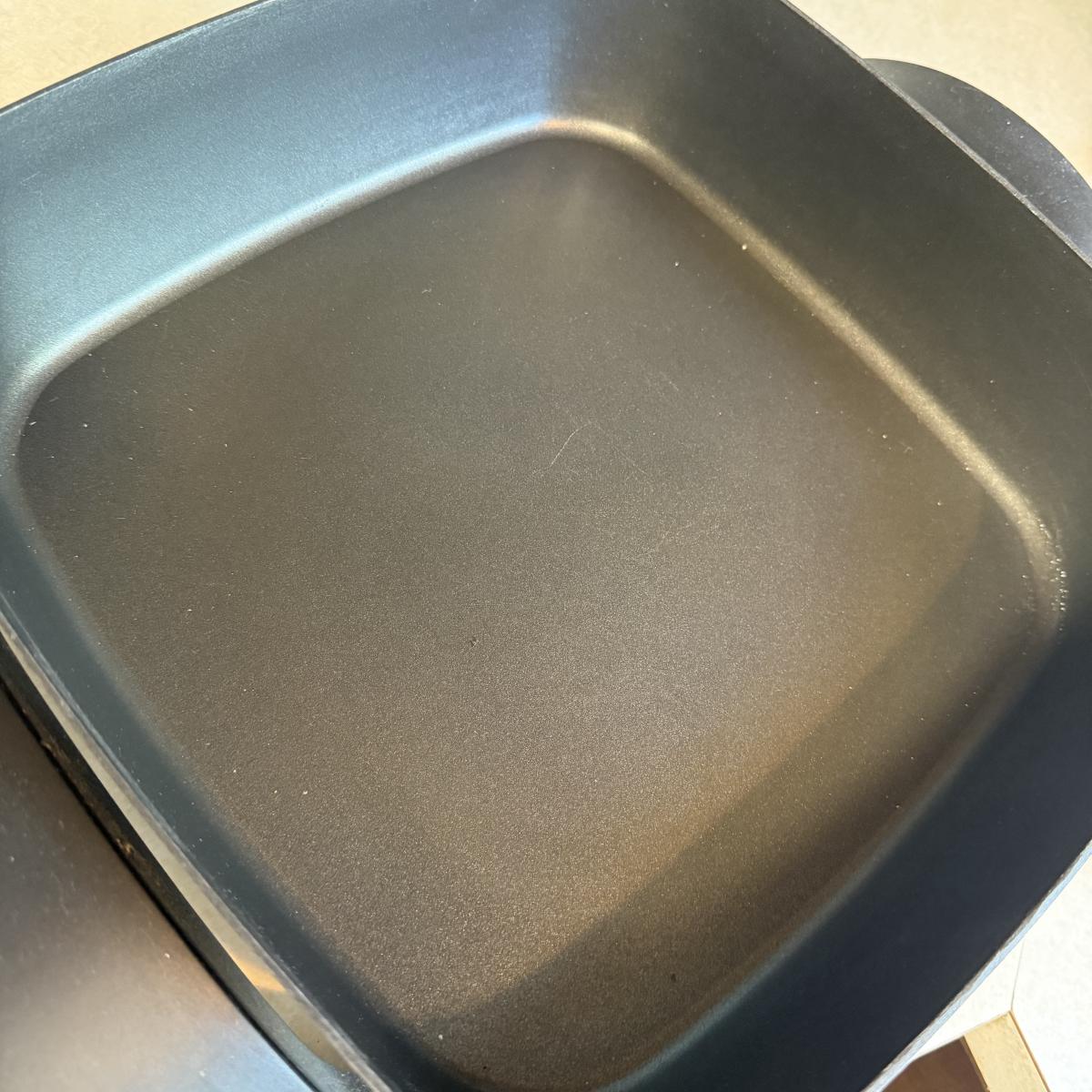 Three items in this lot include a George Foreman grilling machine, a Black & Decker 12” electric skillet, and an enameled oval roaster with a lid. Both electric items powered on when plugged in. The roaster has some chips in the exterior enamel, see photos.