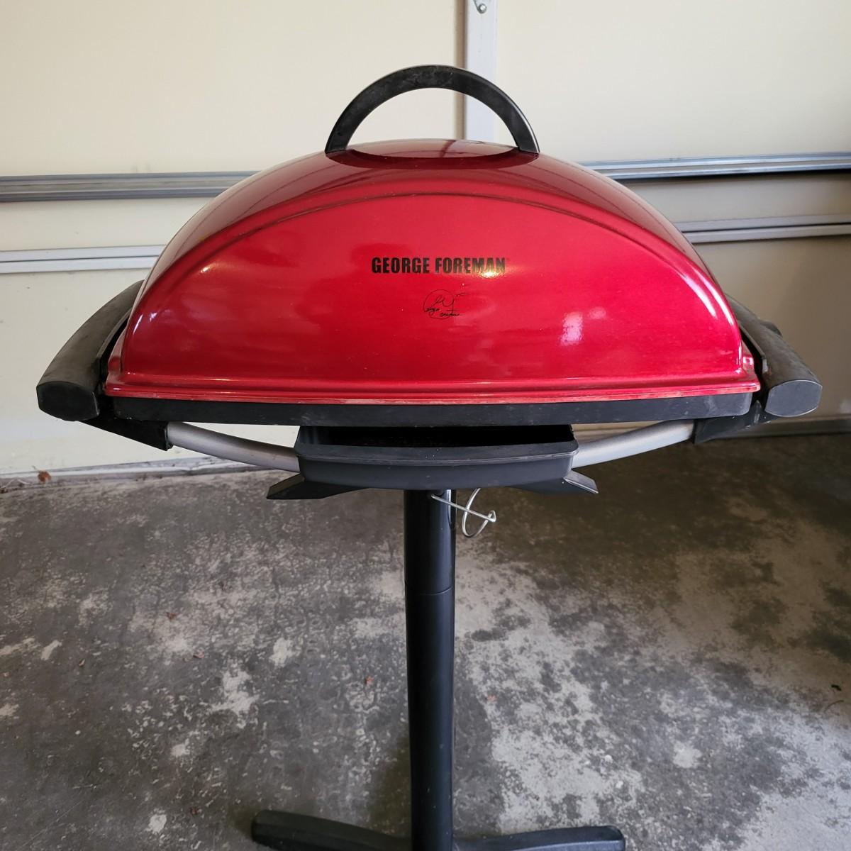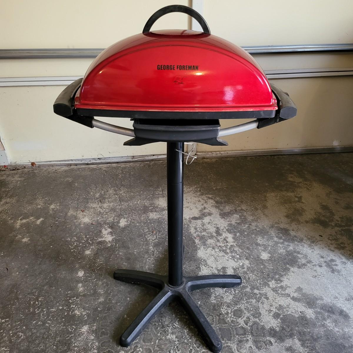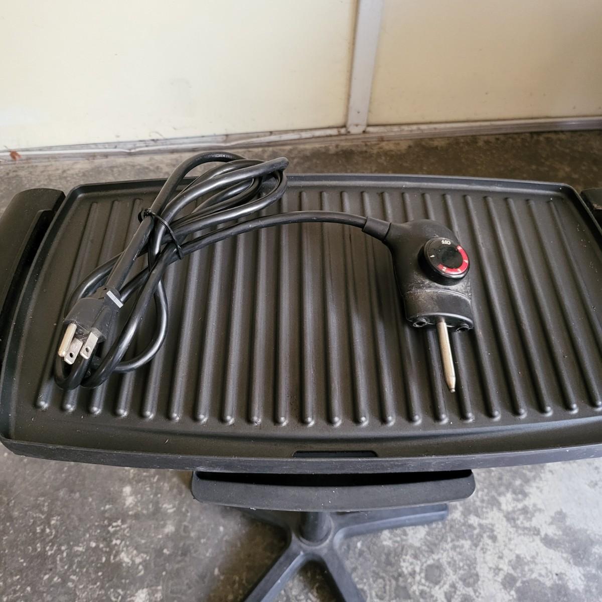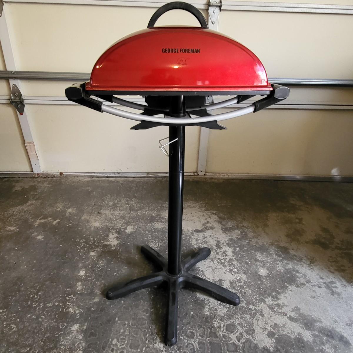 George Forman portable grill with removable stand so can be used counter top, or outdoor use. It does use an electrical cord. Measures 22" wide x 36" tall (on stand) x 10" deep.