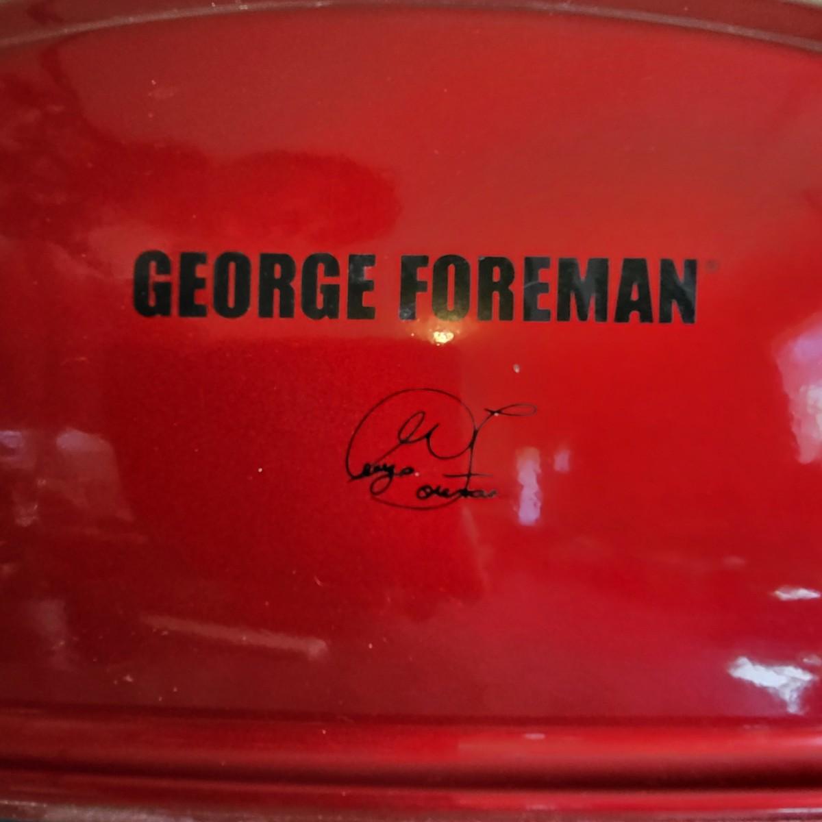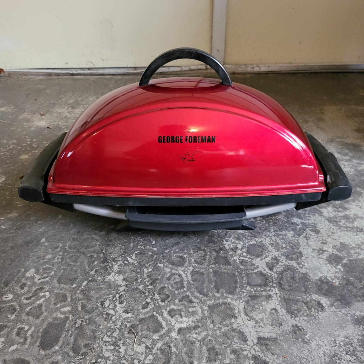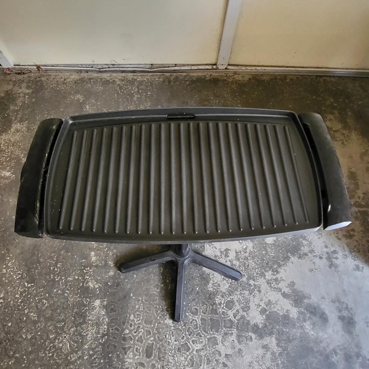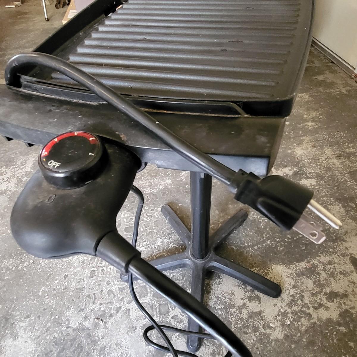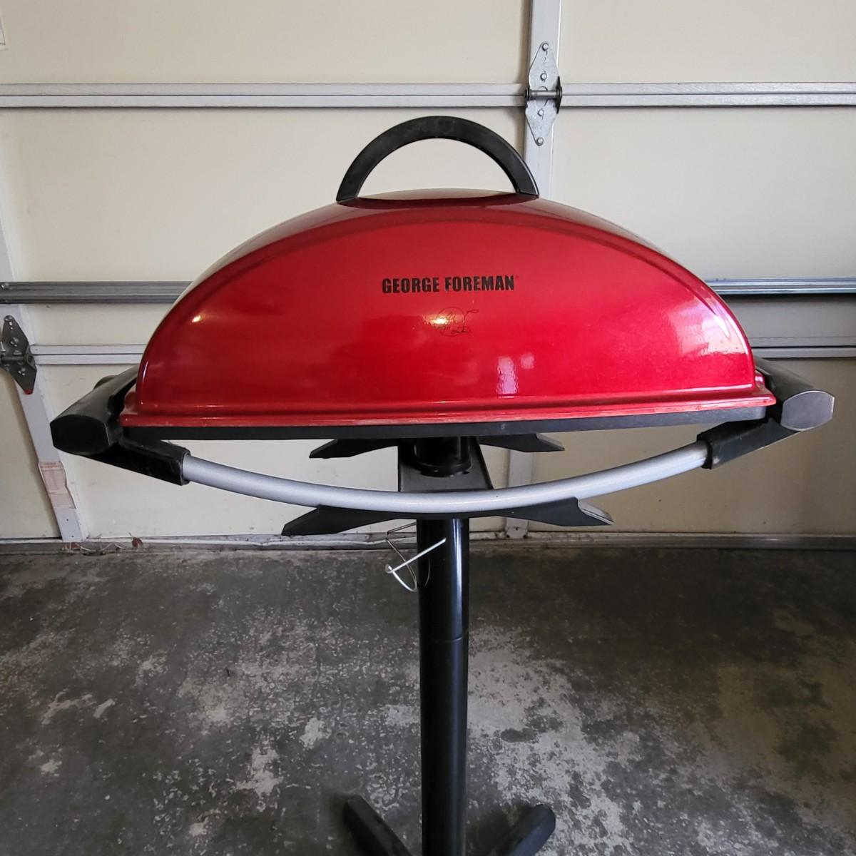 George Forman portable grill with removable stand so can be used counter top, or outdoor use. It does use an electrical cord. Measures 22" wide x 36" tall (on stand) x 10" deep.