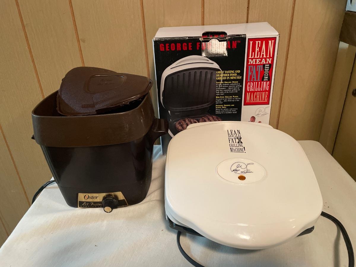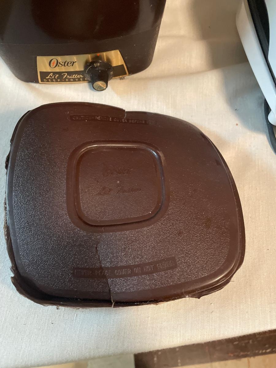 Brown plastic lid is cracked for the lil fryer and it heats up quickly. The George Forman heats up too’