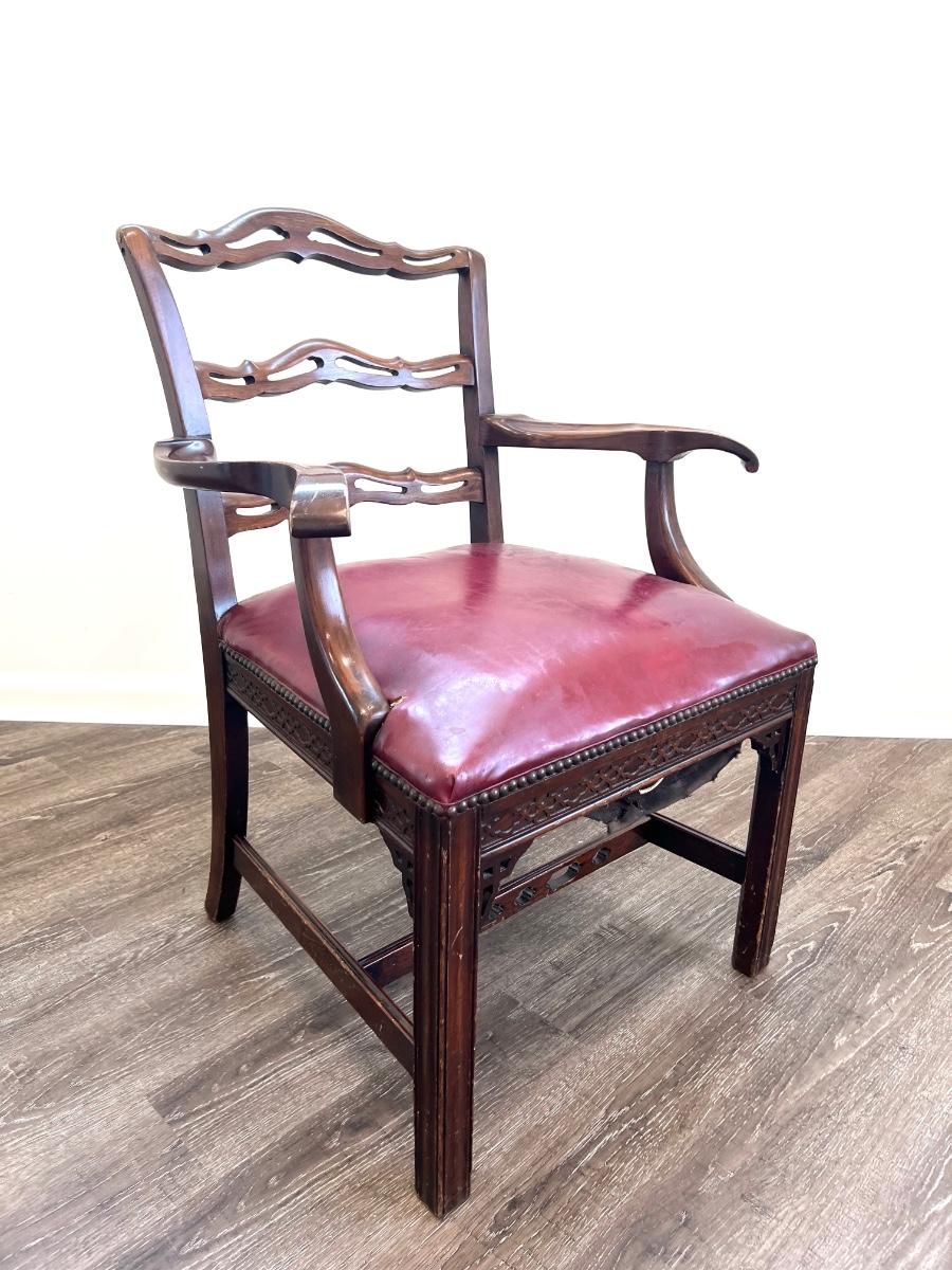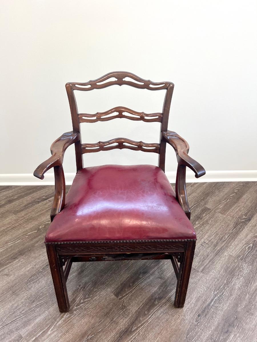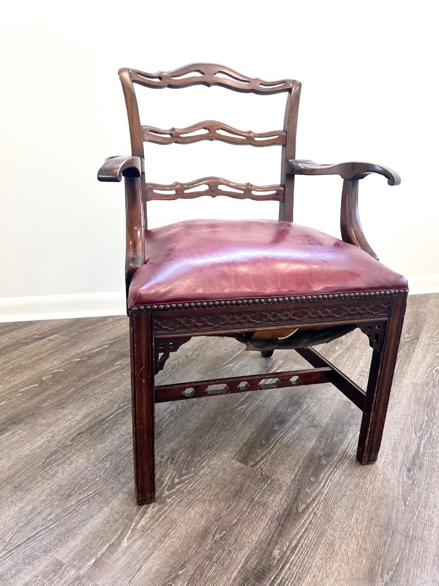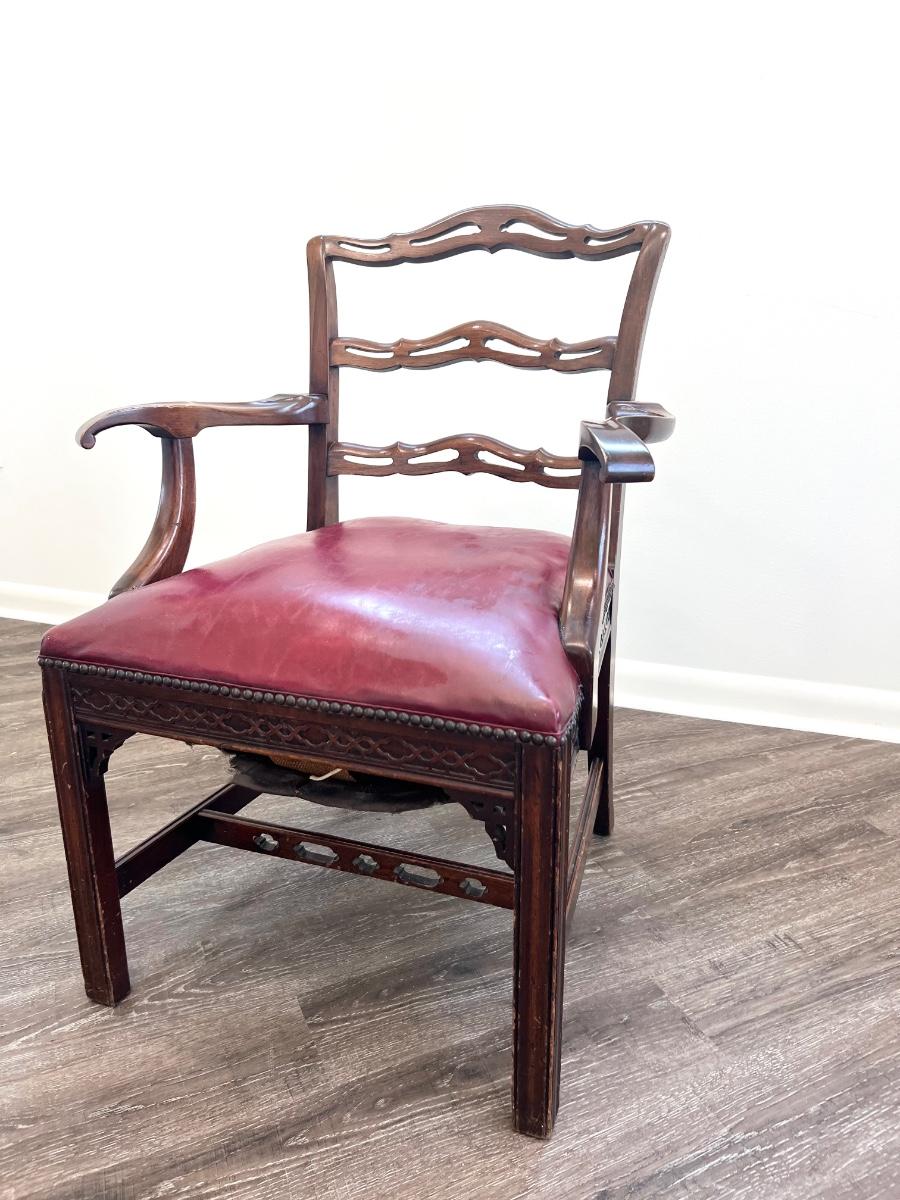 I believe this to be a George III Carved Mahogany Ladder Back Armchair. Great detail! Measures 36 inches tall, 25 inches wide and 22 inches deep, and floor to seat measures 20 inches. Bottom of the chair is coming untacked. Small Slit by the right arm chair. Please see pictures.