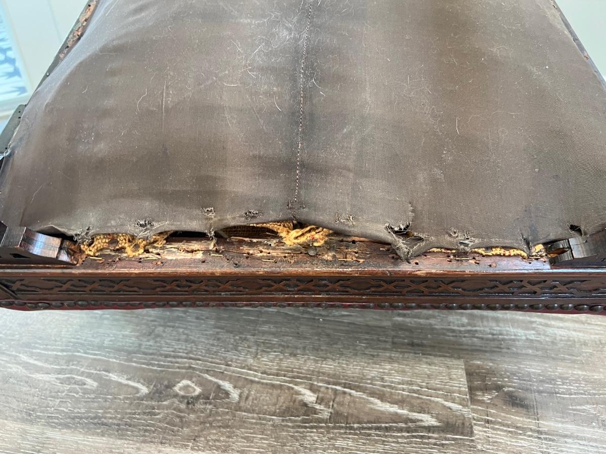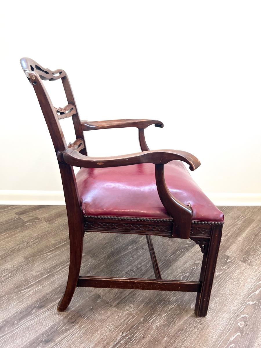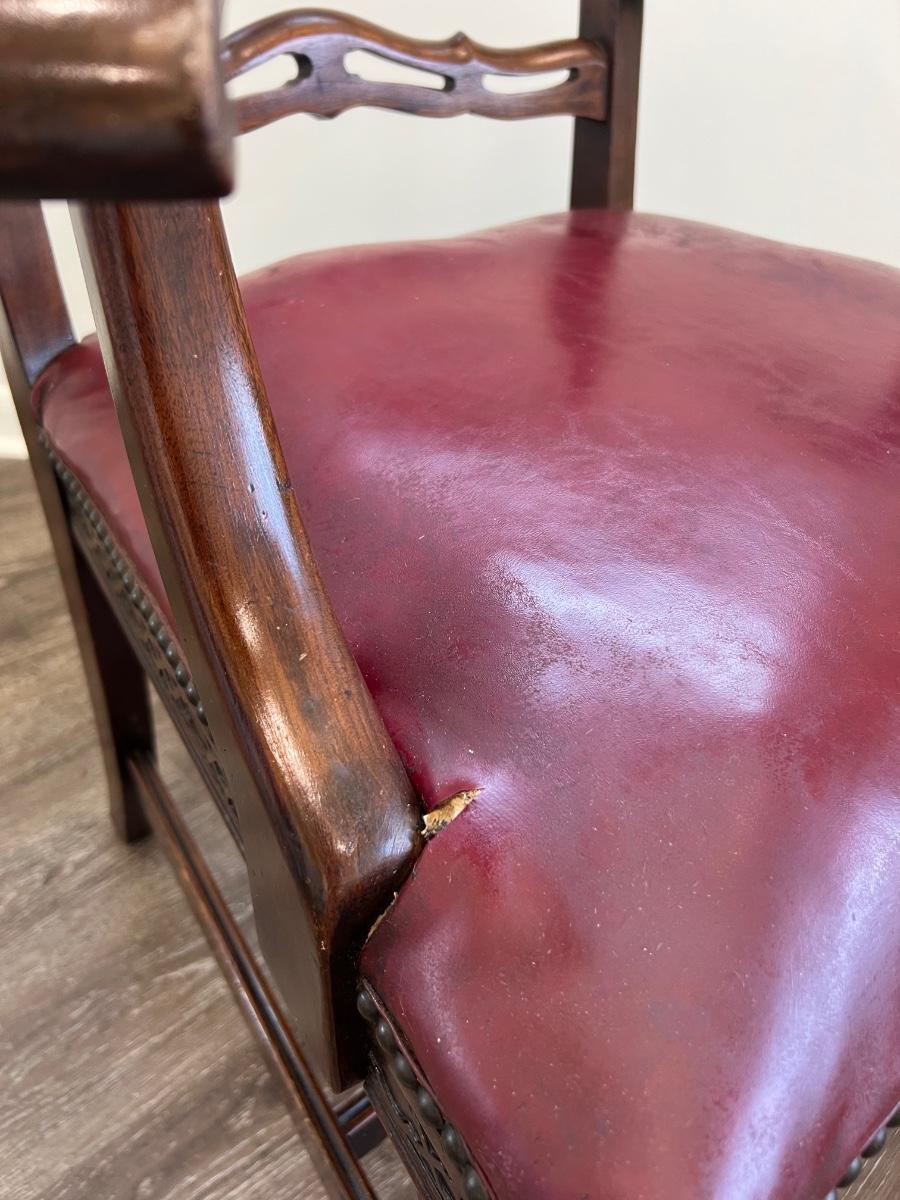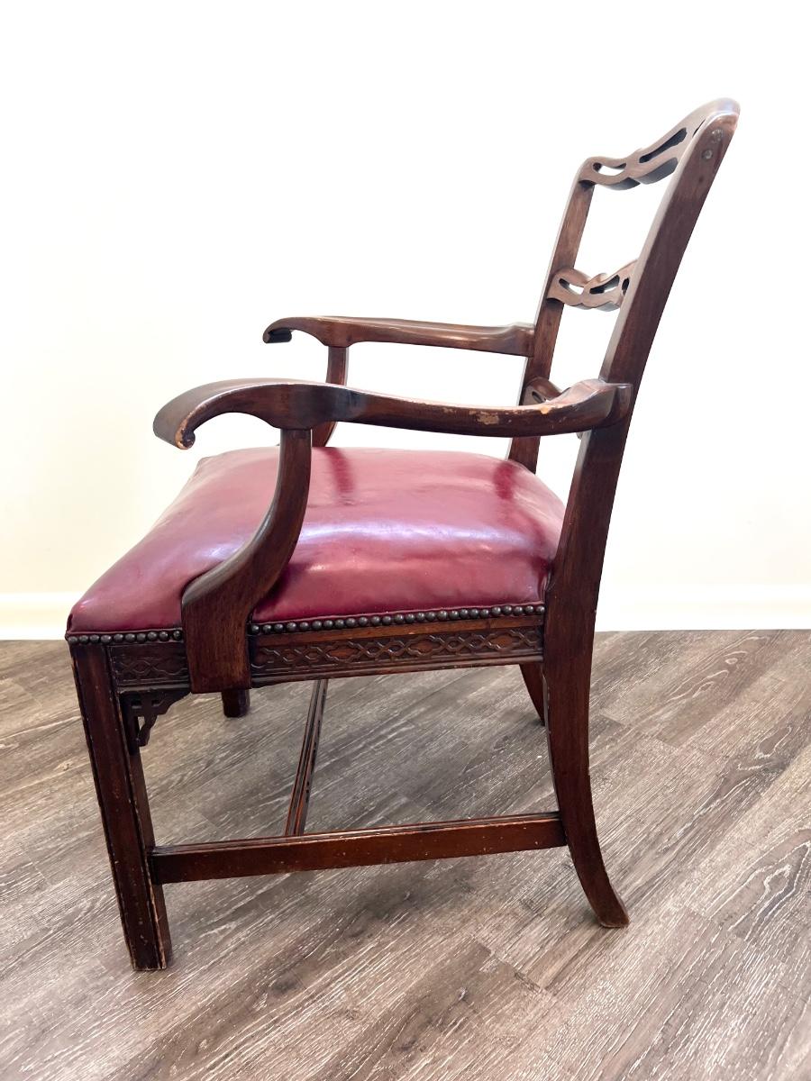 I believe this to be a George III Carved Mahogany Ladder Back Armchair. Great detail! Measures 36 inches tall, 25 inches wide and 22 inches deep, and floor to seat measures 20 inches. Bottom of the chair is coming untacked. Small Slit by the right arm chair. Please see pictures.