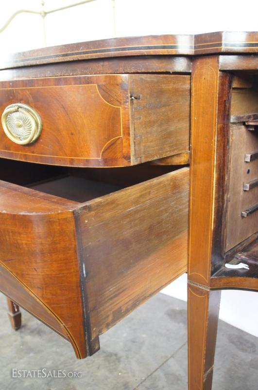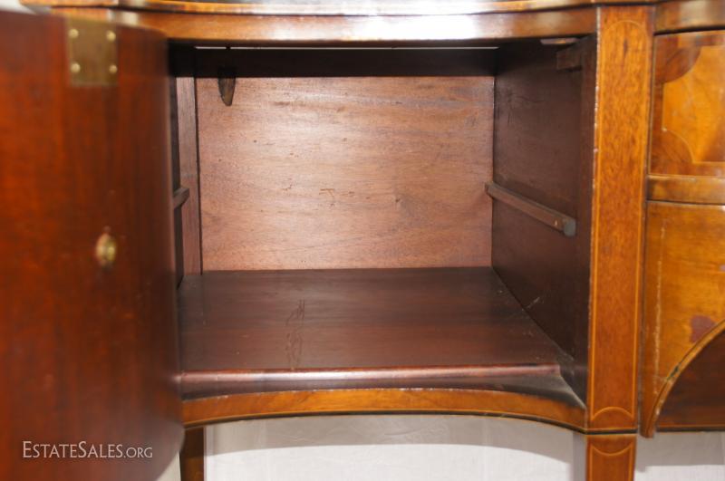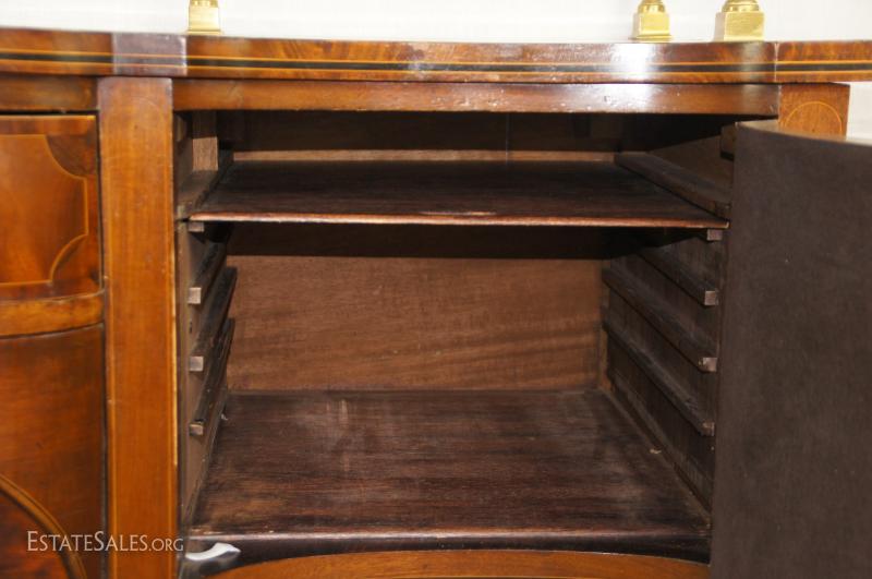 George III style brass mounted inlaid mahogany sideboard, second half 19th century, bow face, two drawers flanked by two doors, with keys