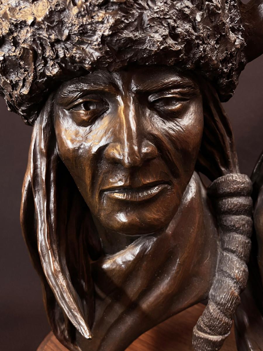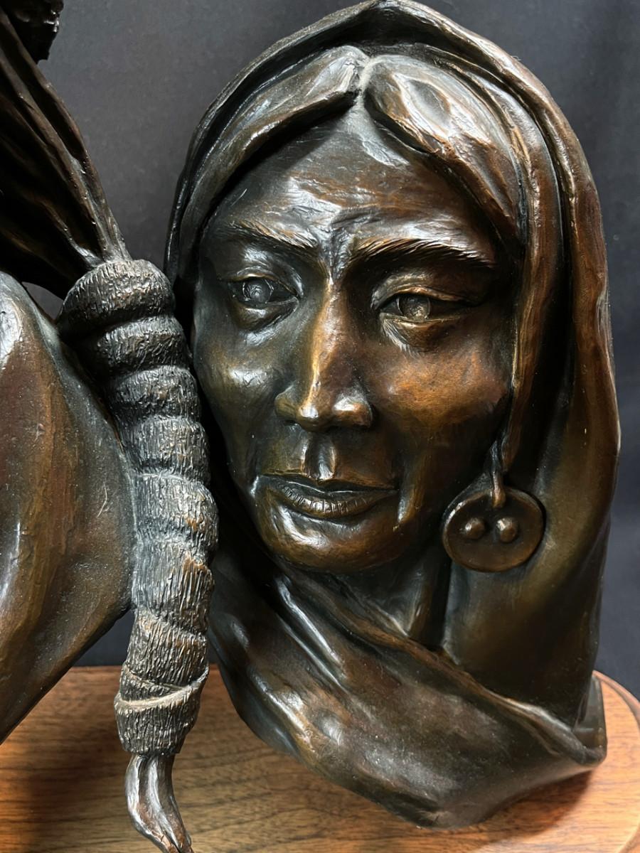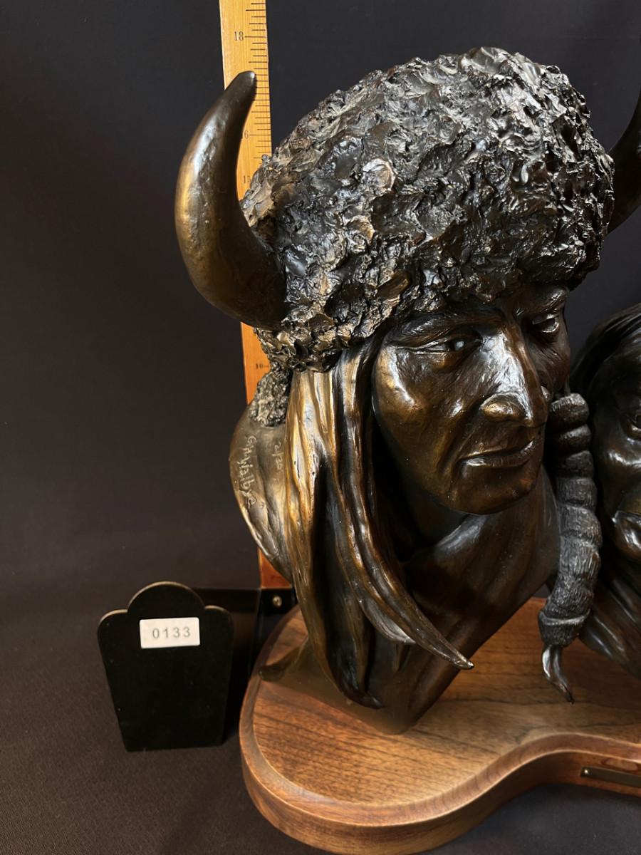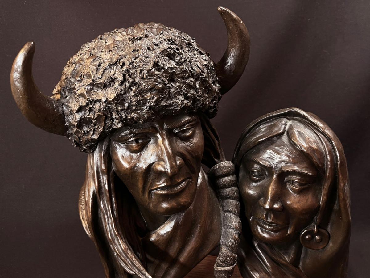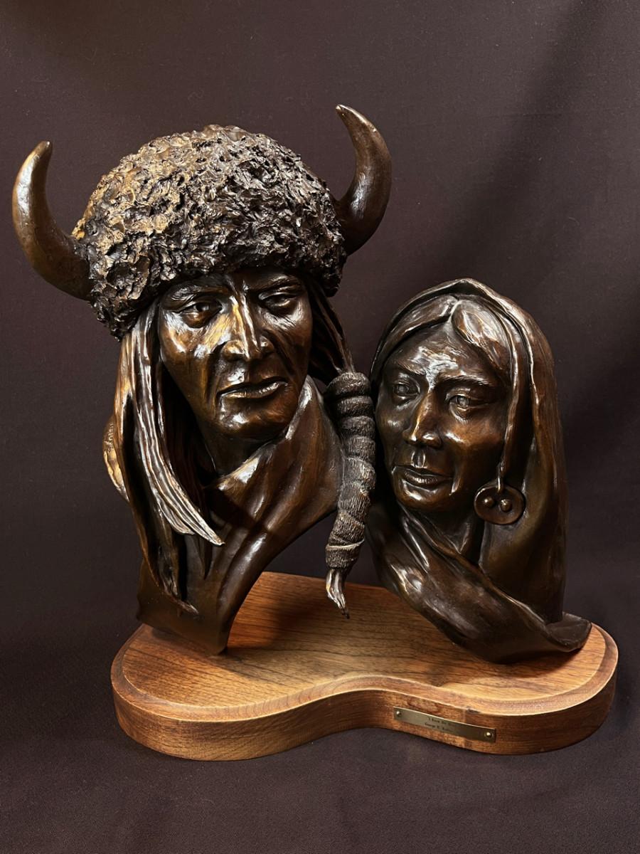 George H. Walbye posing a chest-length portrait of a mature Native American male and female in realistic fashion. “I Know His Heart” features the Medicine man wearing a traditional buffalo headdress and bound braids. The woman has her head covered with a woven shawl wrapped at the neck, and wearing a large earring. The casting has been finished with a rich brown patina.