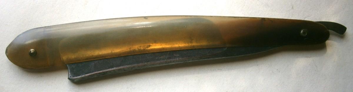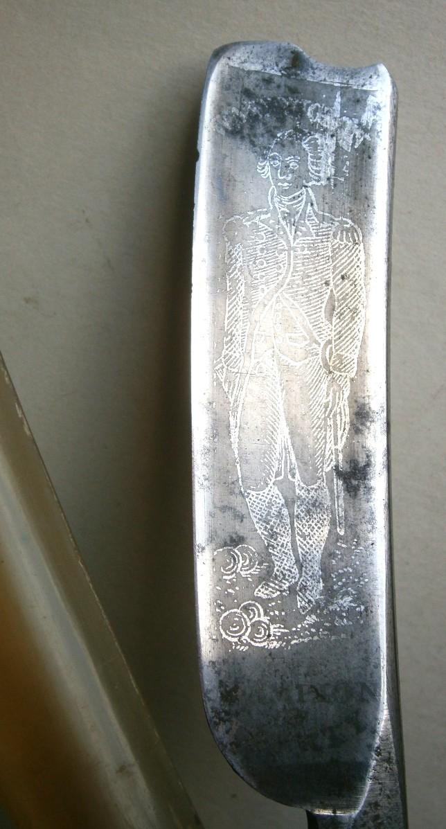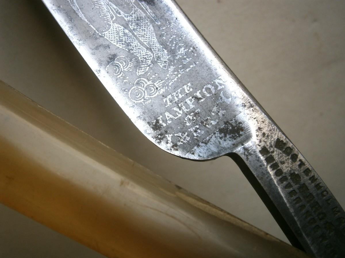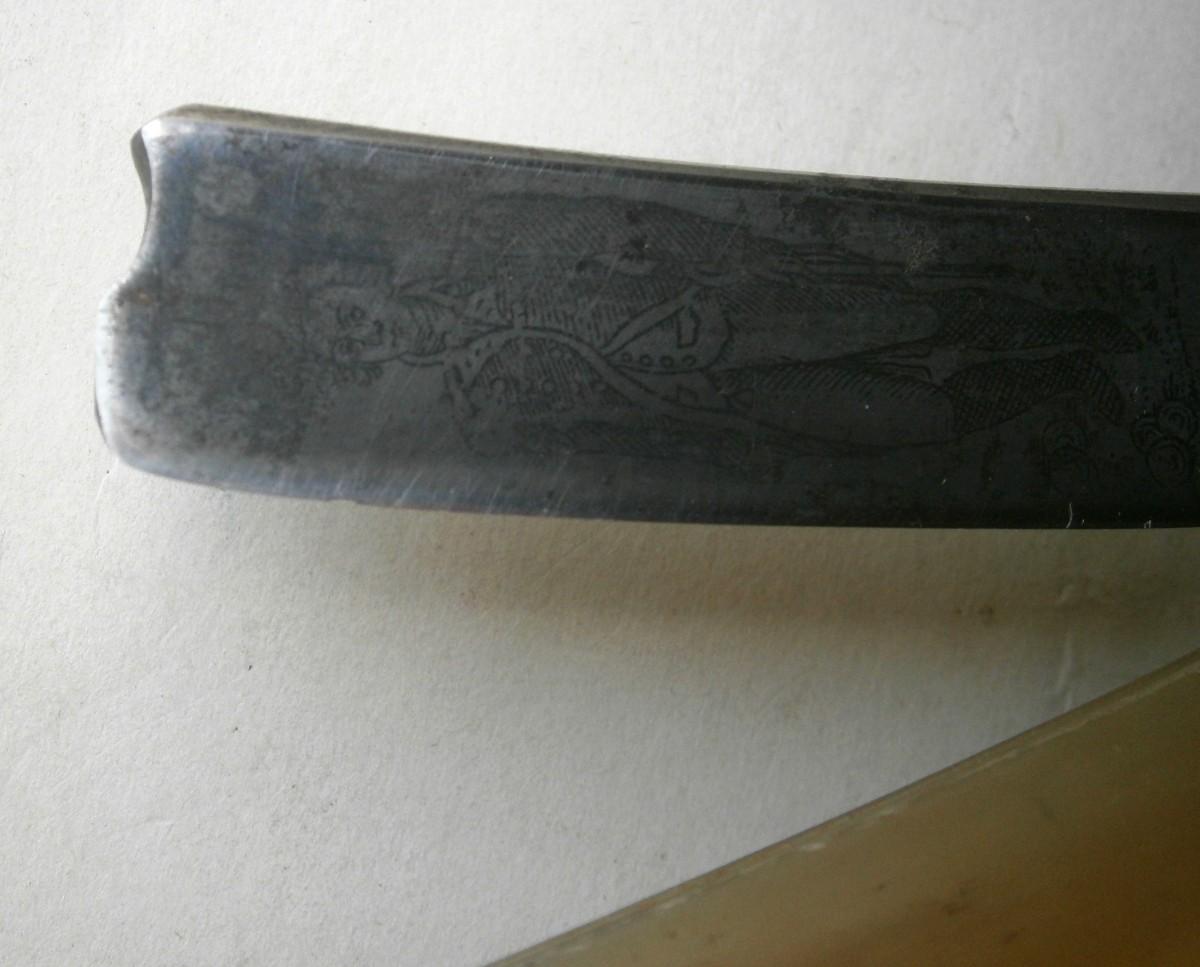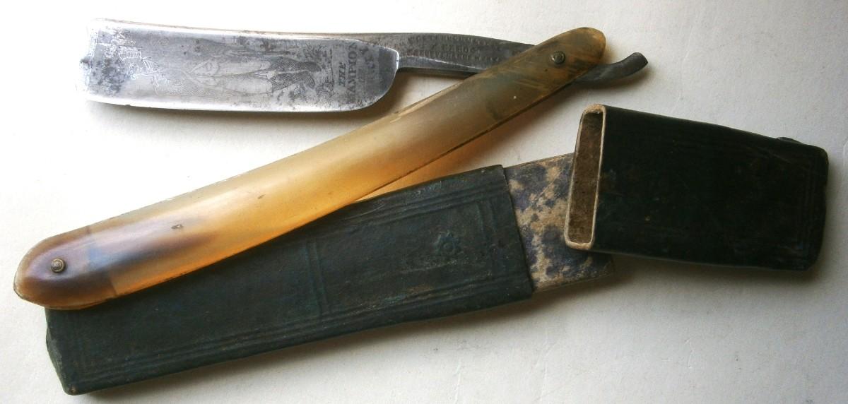 "THE CHAMPION OF LIBERTY" GEORGE WASHINGTON Straight Razor, 19th Century, horn handle, acid etched steel blade with image of George Washington, original case.