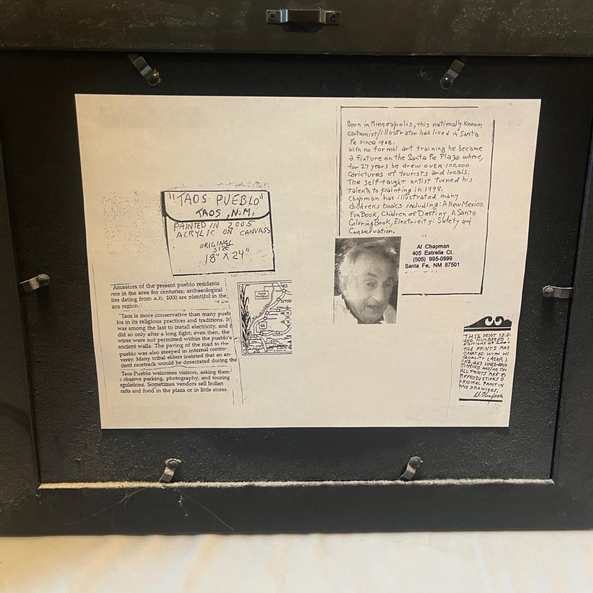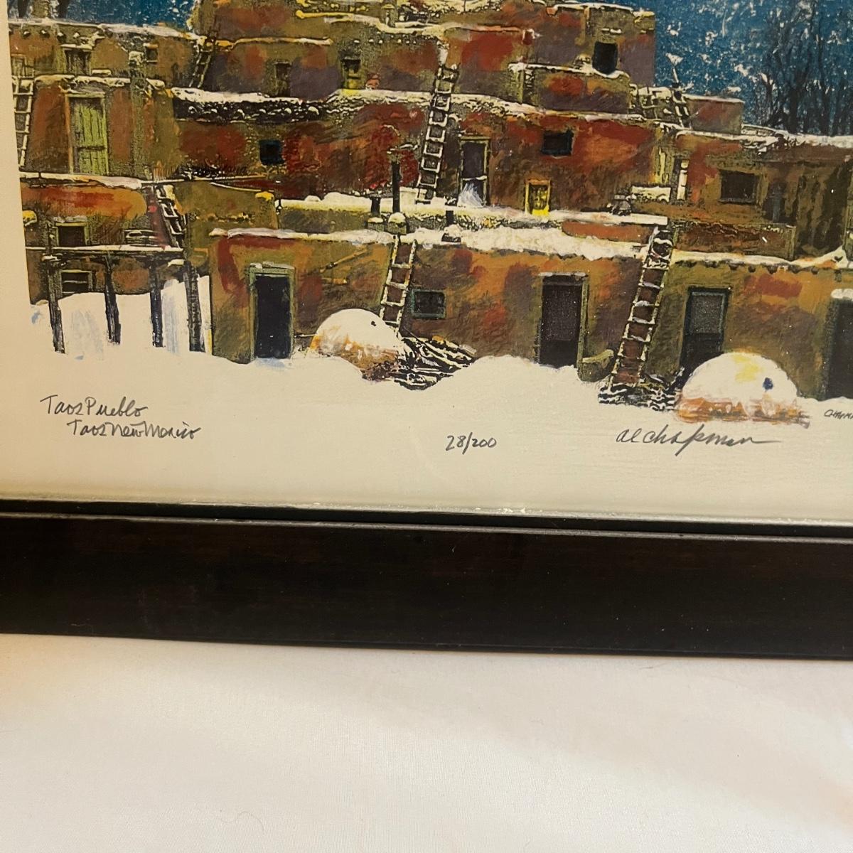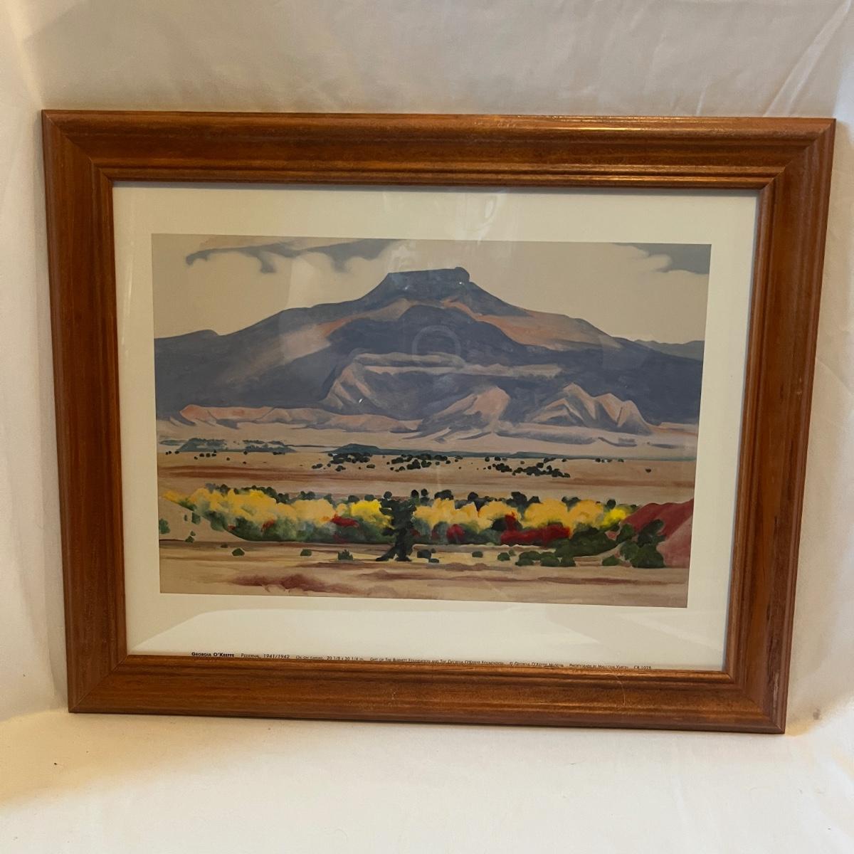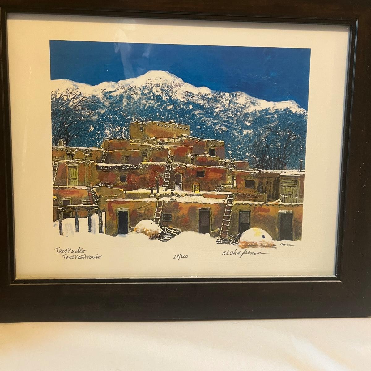 Lot includes a wooden framed print by Georgia O’Keeffe titled Pedernal and a pencil signed and numbered wooden framed print by Al Chapman titled Taos Pueblo. Largest Al Chapman frame measures 17” x 14”H.