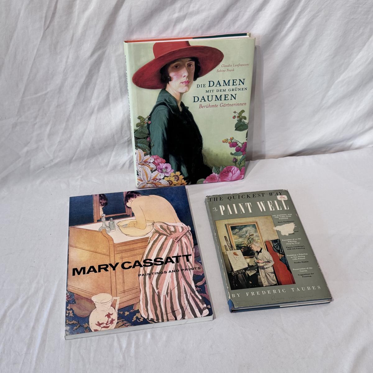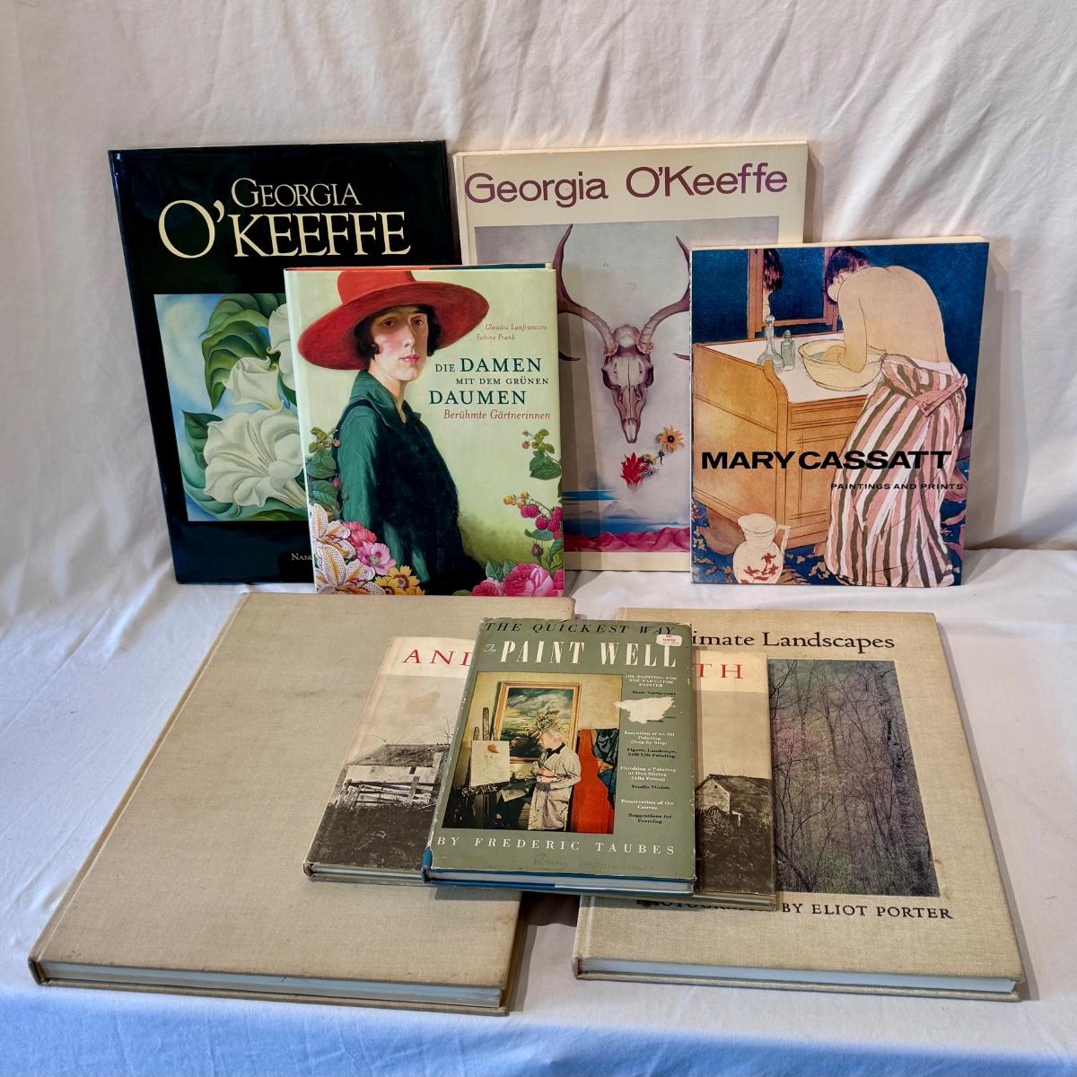 This lot includes two Georgia O’Keeffe books full of illustrations, book full of paintings and prints by Mary Cassatt, Intimate Landscapes full of photographs by Eliot Porter, and a book full of art by Andrew White. You’ll also find Die Damen Mit Dem Grünen Daumen by Berühmte Gärtnerinnen, Louis Agassiz Fuertes & the singular beauty of birds (first edition), and a book on The Quickest Way to Paint Well by Frederic Taubes. The book on Louis Agassiz Fuertes is the largest book that measures 11.25” x 14.25”H. Shipping available.