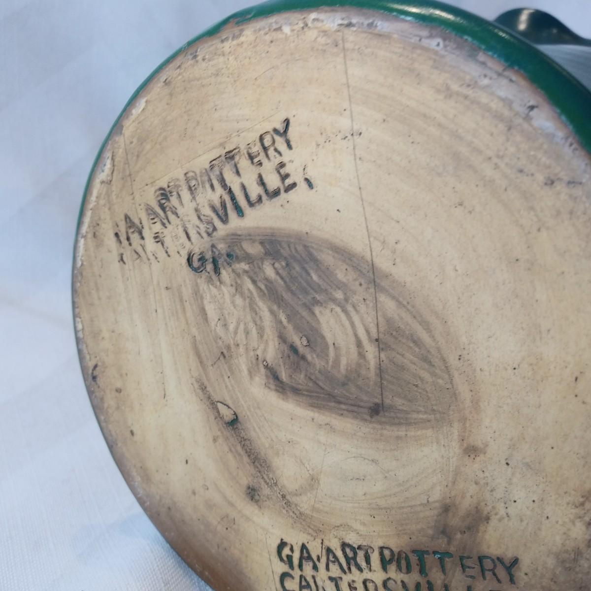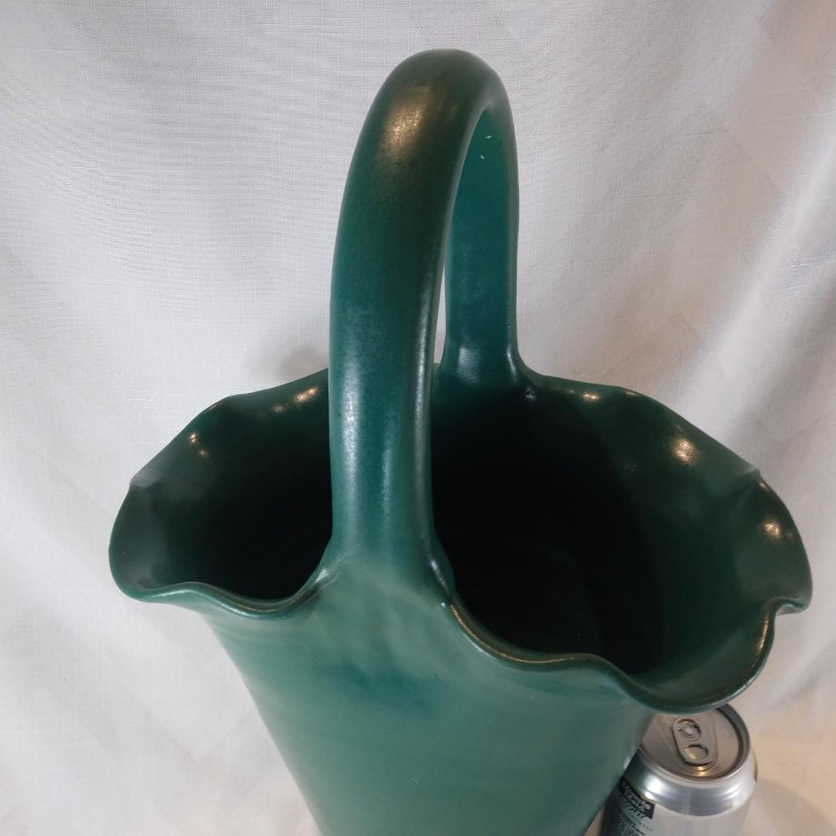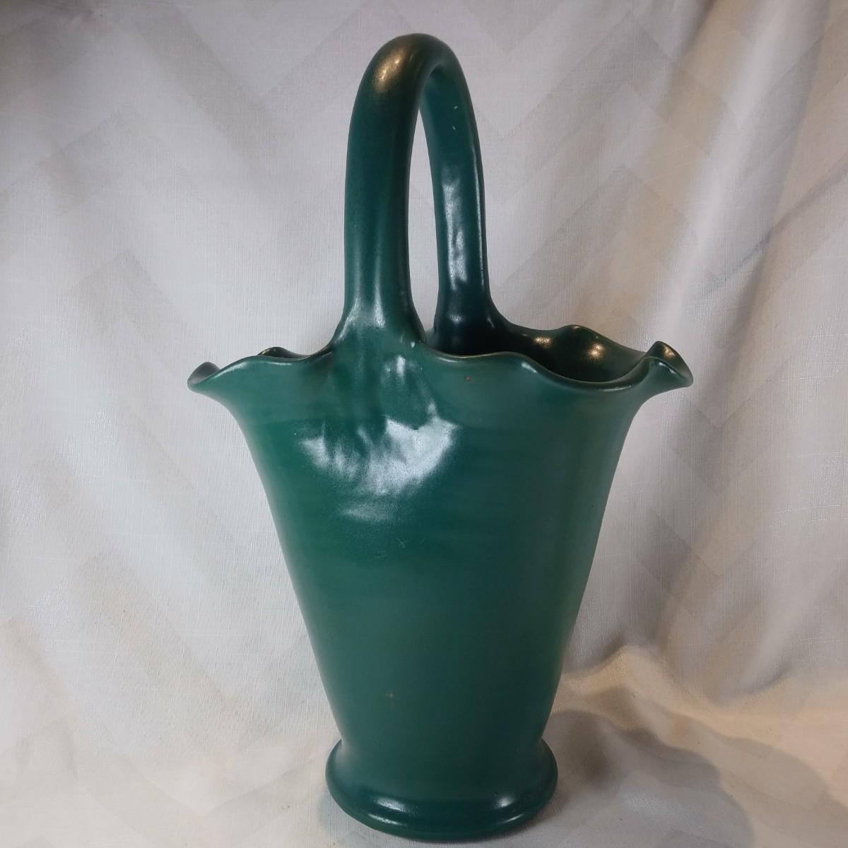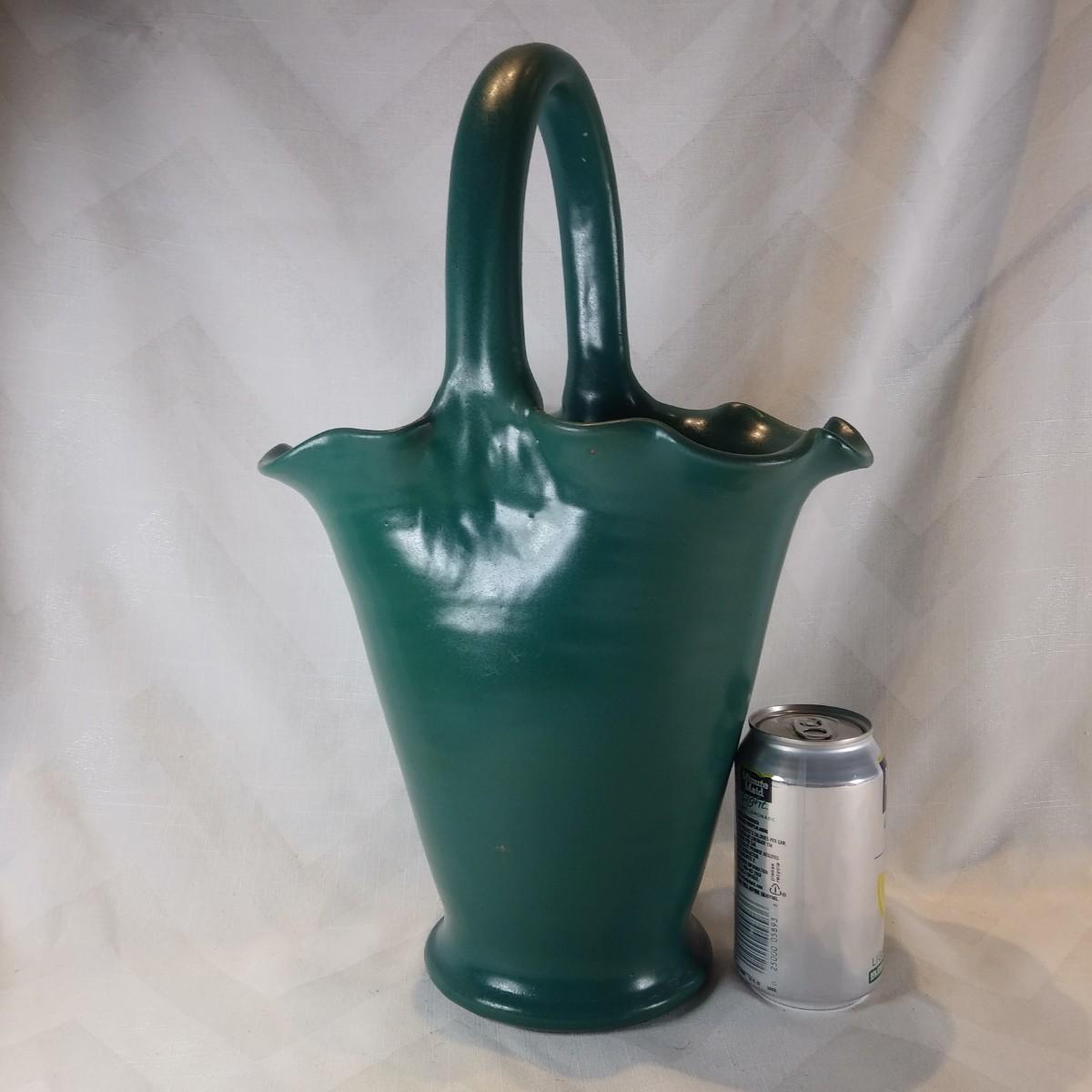 This auction lot is for a nice Georgia Art Pottery Basket. Piece is massively fun with a great coloration. This is a very large and heavy dark teal pottery basket from the Georgia Art Pottery in Cartersville, GA. It measures about 16.5-inches tall X 11-inches wide. It sports a hairline crack in the bottom. NOTE: This is large and very heavy. It will be very expensive to ship.