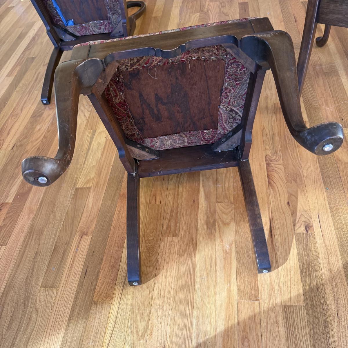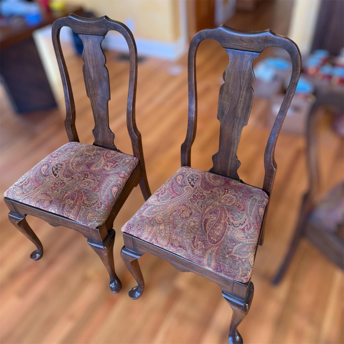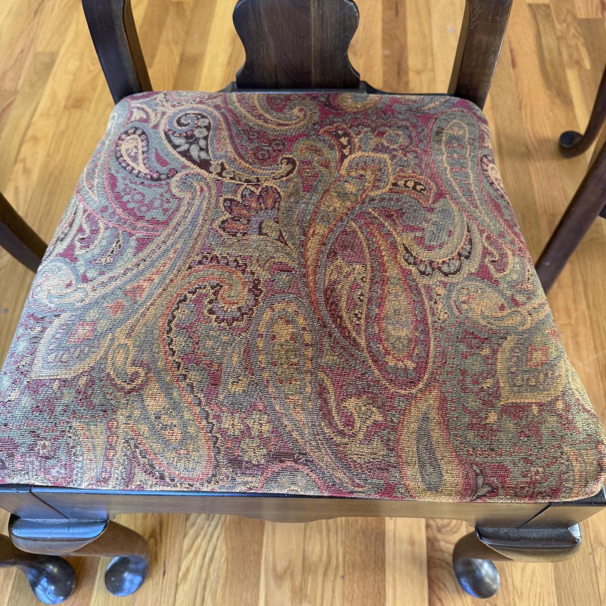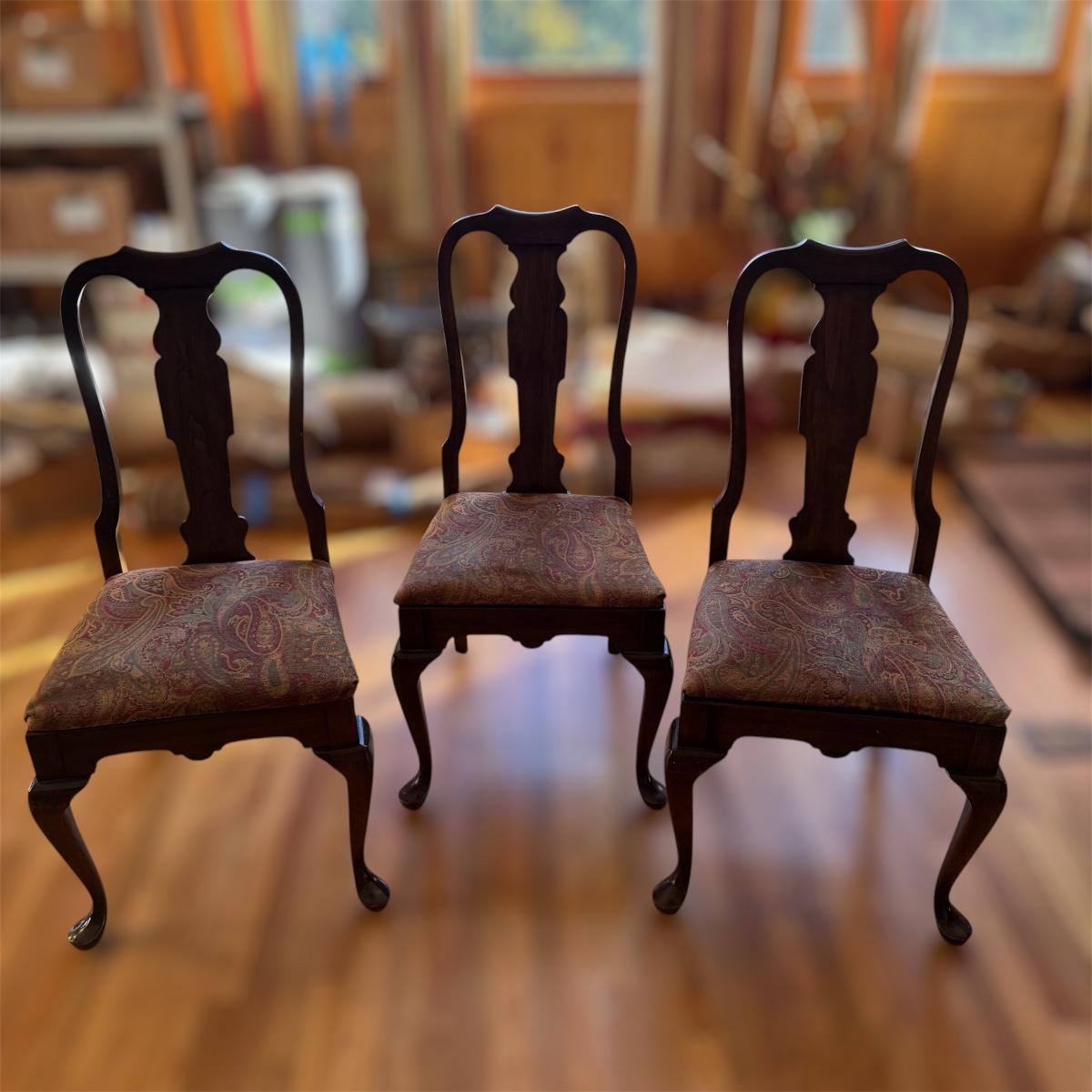 This lot contains three Georgian style Queen Anne dining room chairs. Each share a maroon paisley upholstery on their seat cushions. One chair is quite wobbly and has a loose leg. They each measure 20” x 18” x 40”H with a seat height of 17.5”H. There are some scrapes and scuffs on the legs of all three of these chairs and a couple scratches on the backseat of one, see pictures for details. Local pick up only.