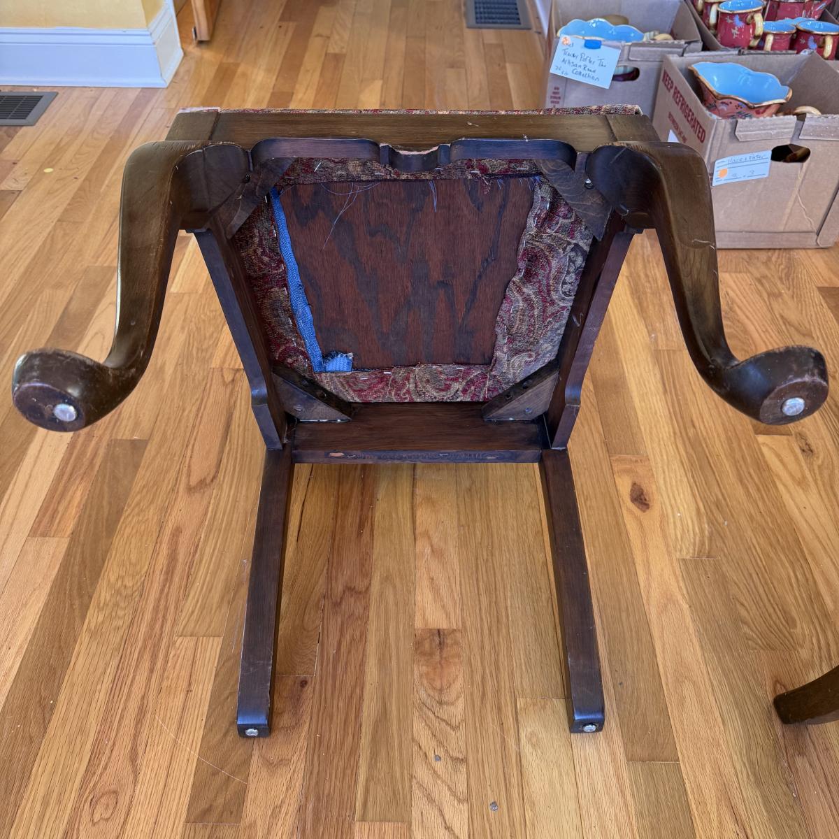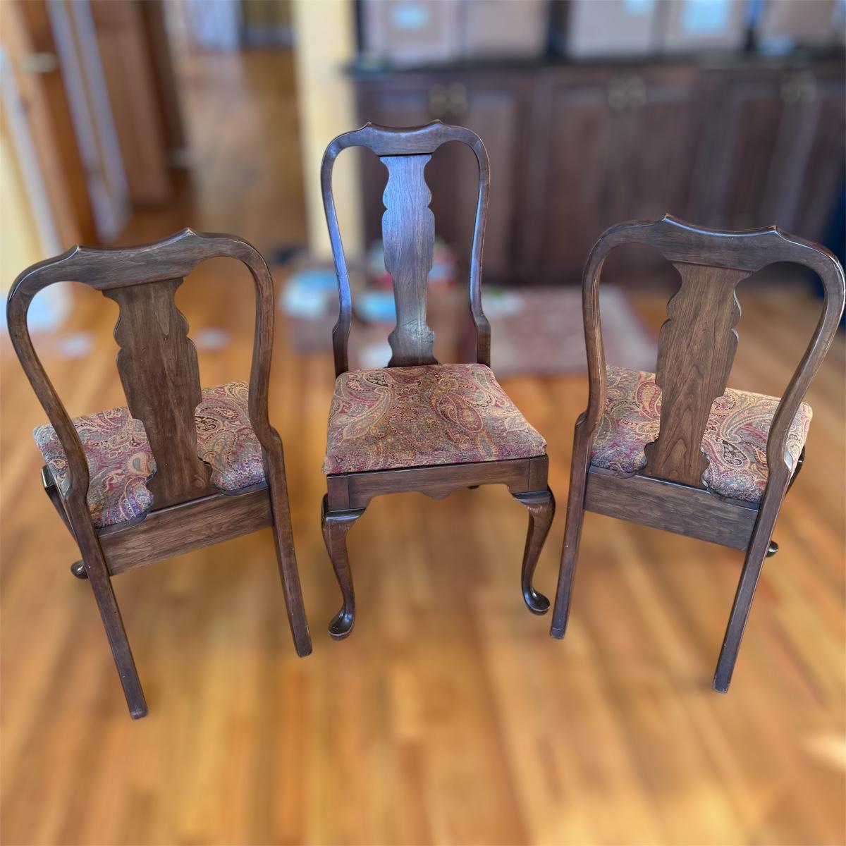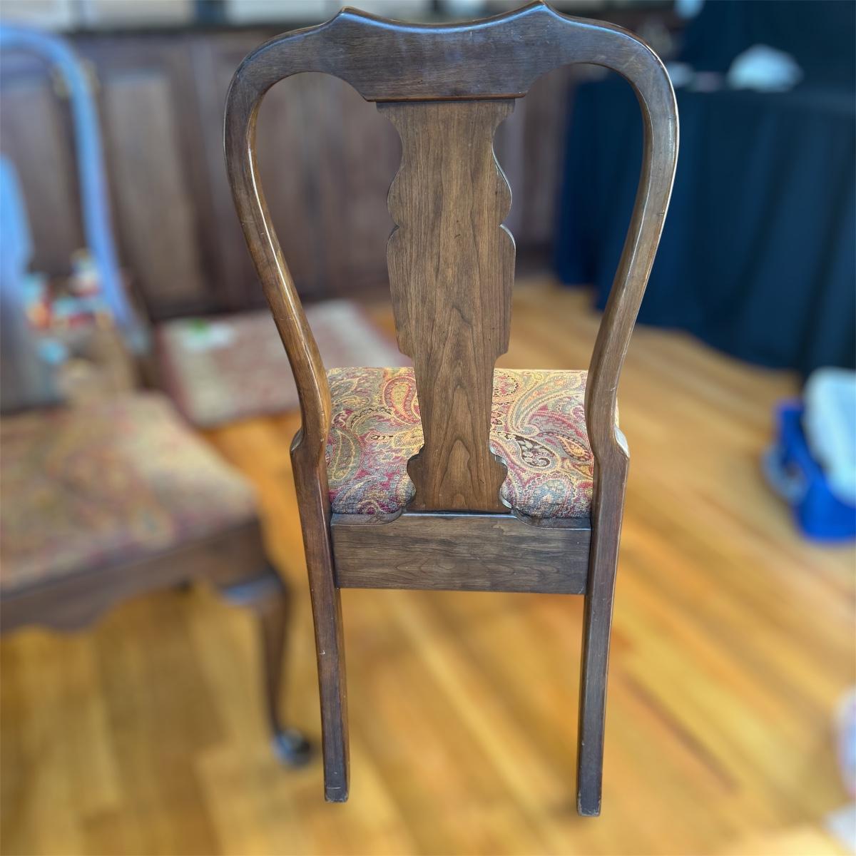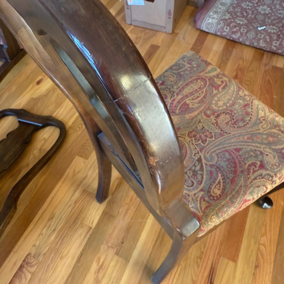 This lot contains three Georgian style Queen Anne dining room chairs. Each share a maroon paisley upholstery on their seat cushions. One chair is quite wobbly and has a loose leg. They each measure 20” x 18” x 40”H with a seat height of 17.5”H. There are some scrapes and scuffs on the legs of all three of these chairs and a couple scratches on the backseat of one, see pictures for details. Local pick up only.