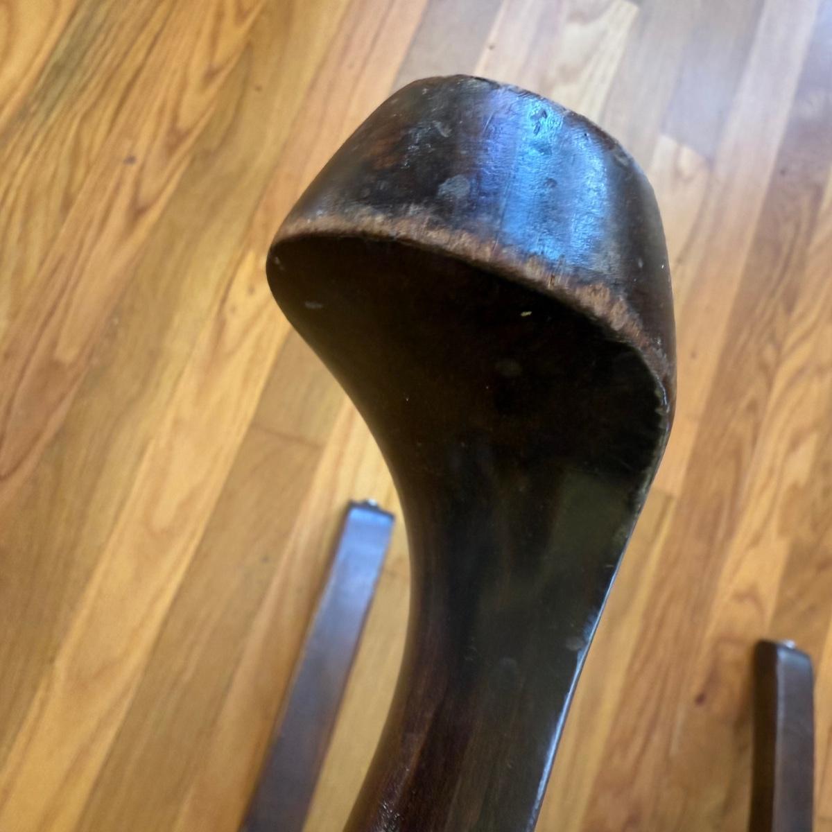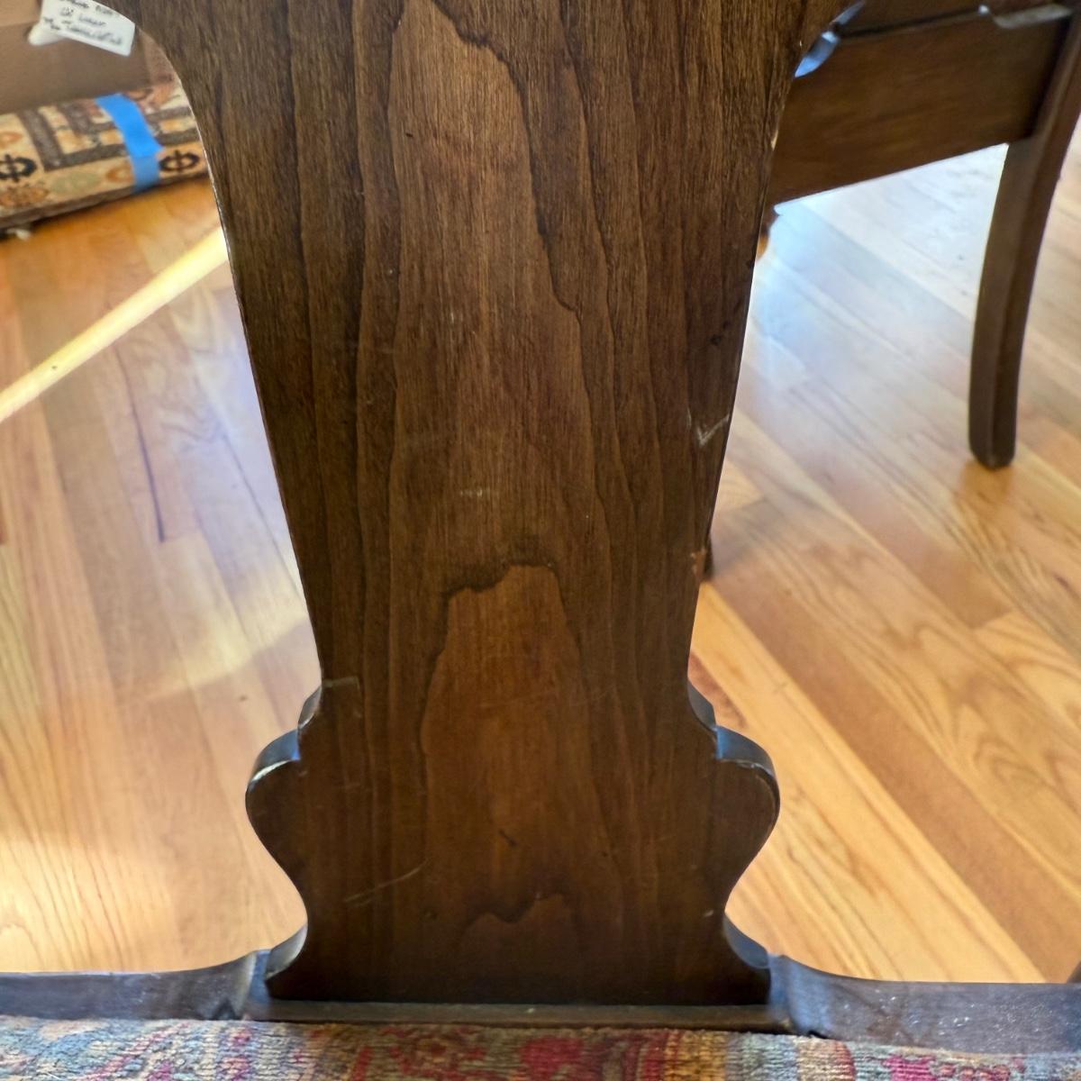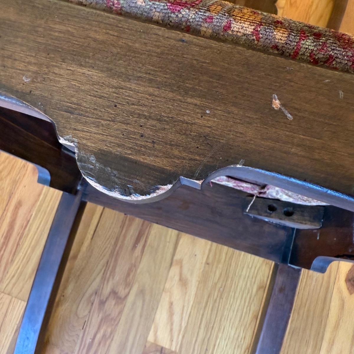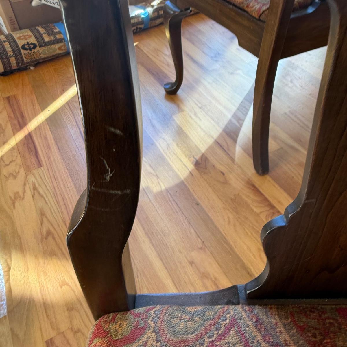 This lot contains three Georgian style Queen Anne dining room chairs. Each share a maroon paisley upholstery on their seat cushions. One chair is quite wobbly and has a loose leg. They each measure 20” x 18” x 40”H with a seat height of 17.5”H. There are some scrapes and scuffs on the legs of all three of these chairs and a couple scratches on the backseat of one, see pictures for details. Local pick up only.