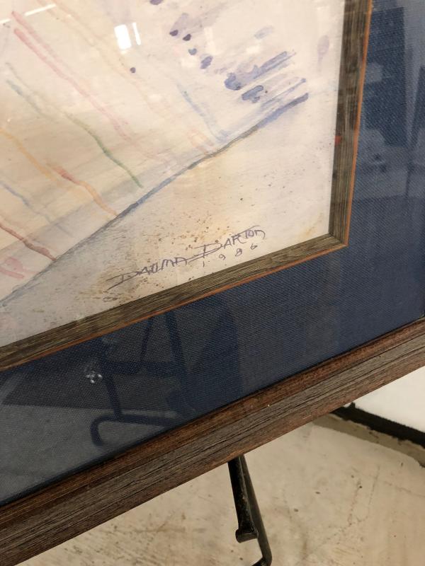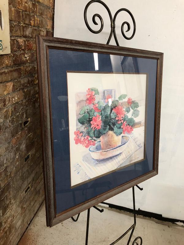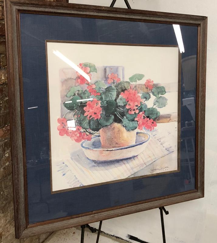 Excellent condition on this open edition print of a watercolor entitled "Geraniums" by artist Dawna Barton...Dated 1986...Framed and under glass...34 x 34" appriox dimensions...