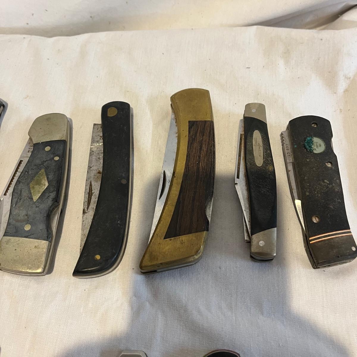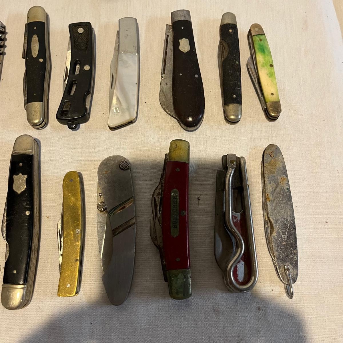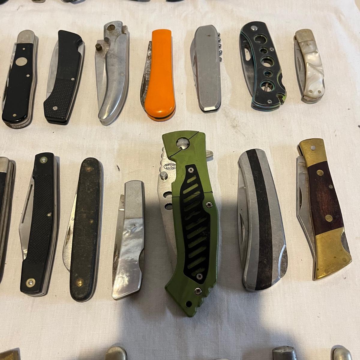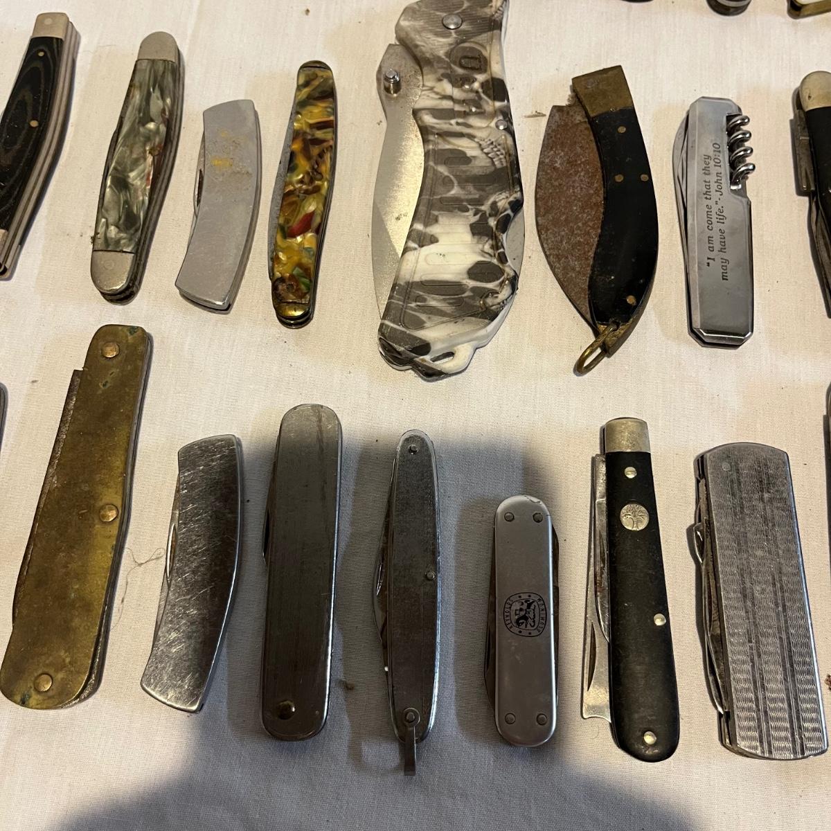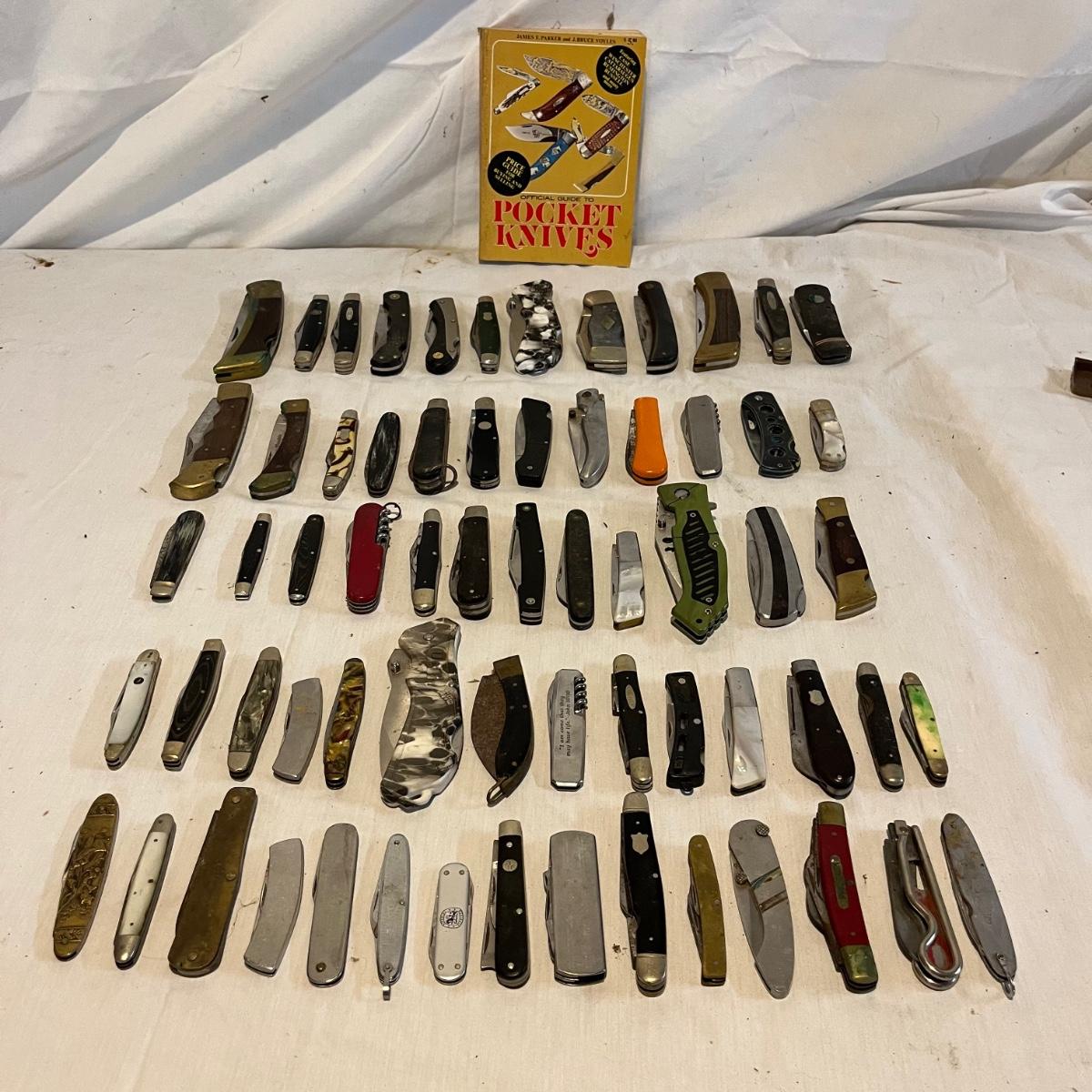 Lot contains Gerber, Böker, Case,Victornox, Buck Creek and more pocket knives. Over sixty knives included in this lot. Longest knife when open measures 8.5”. Lot includes a price guide for pocket knives