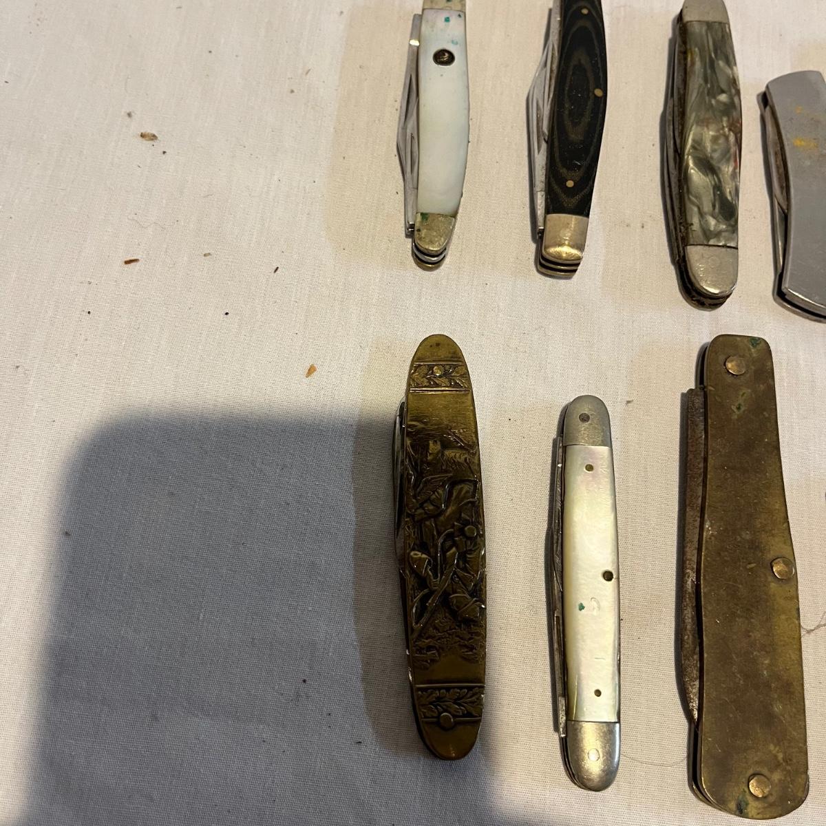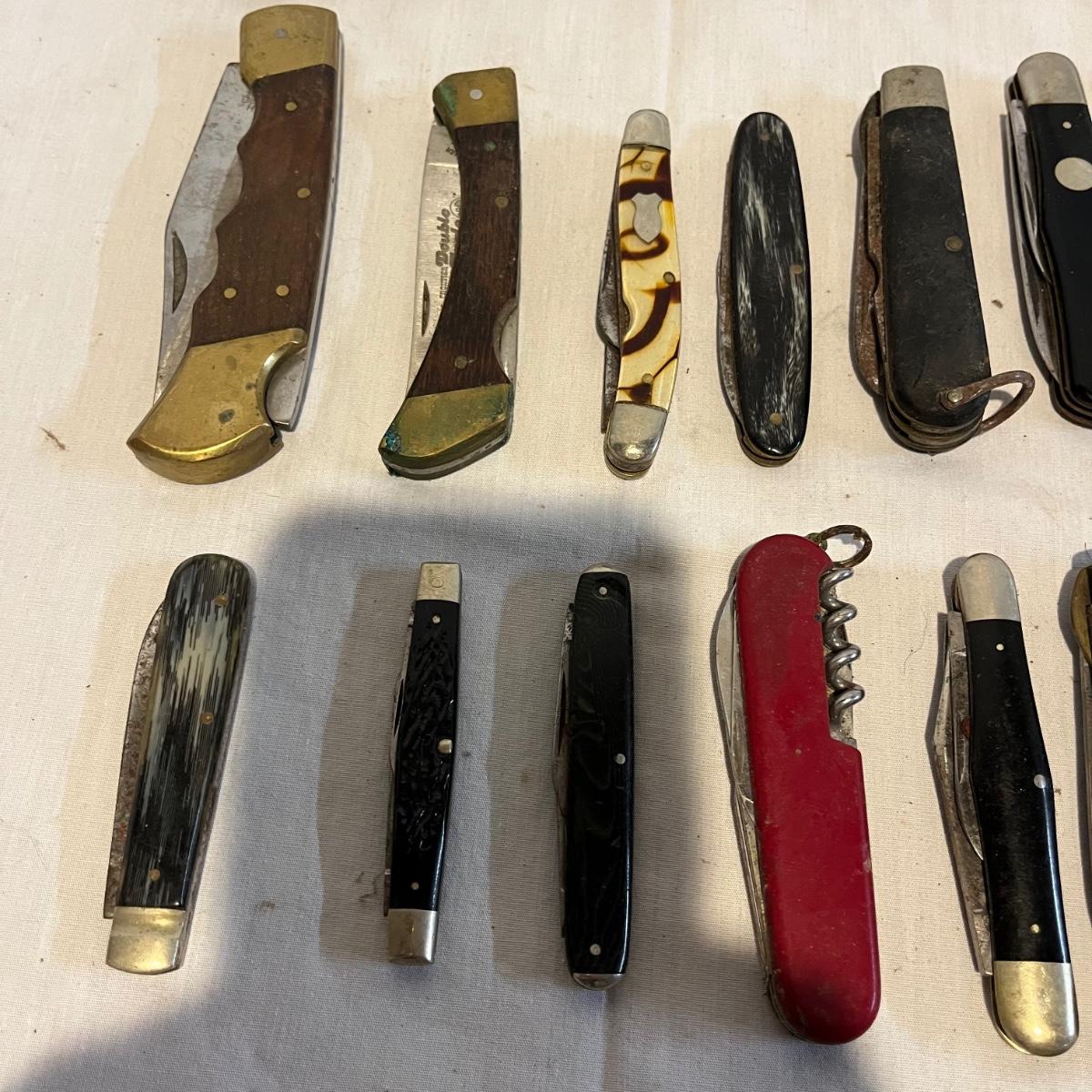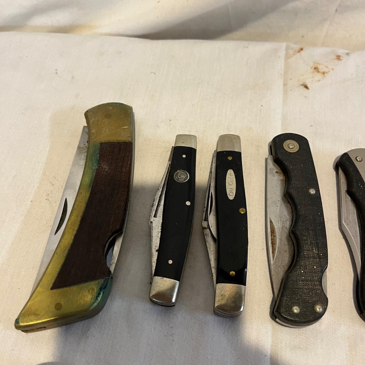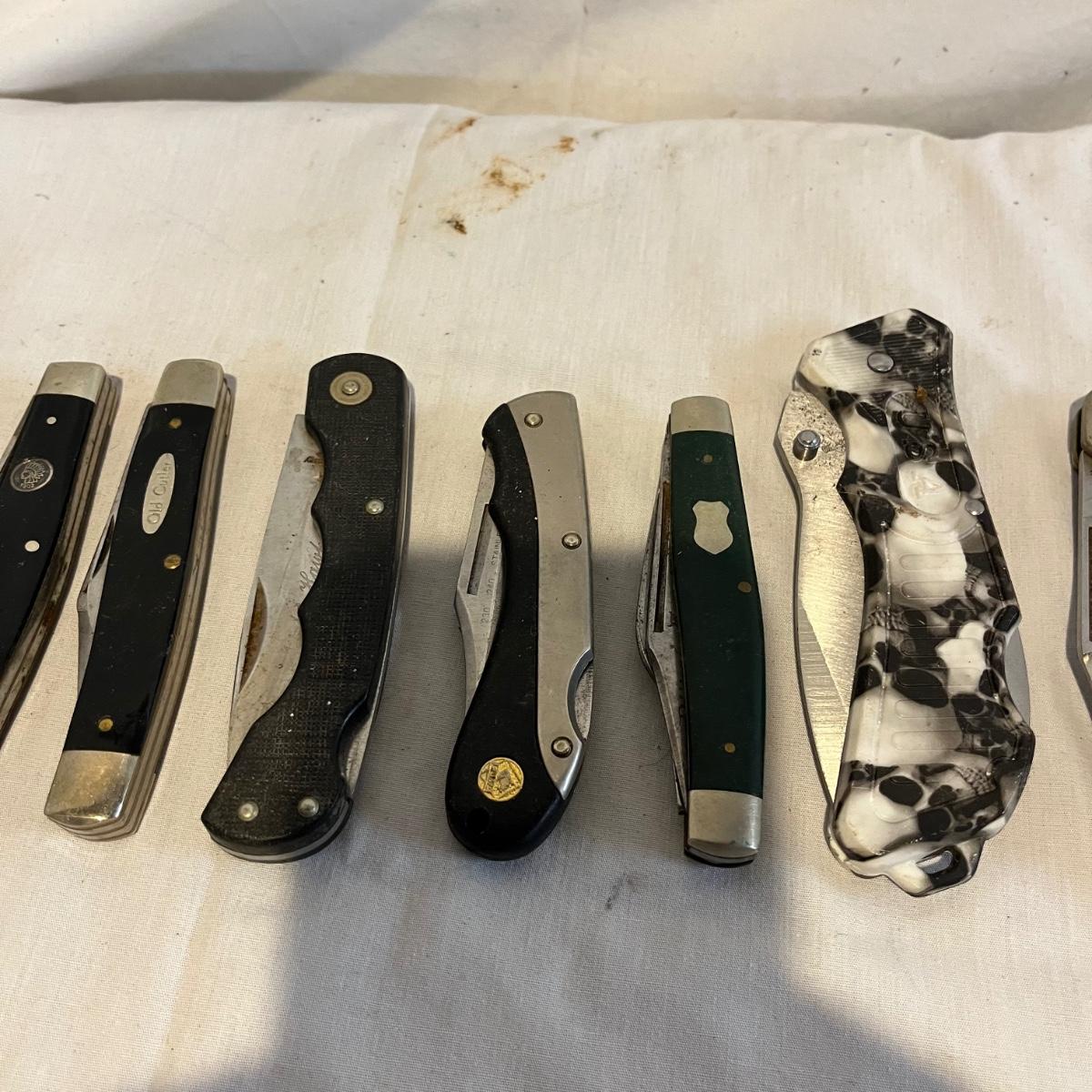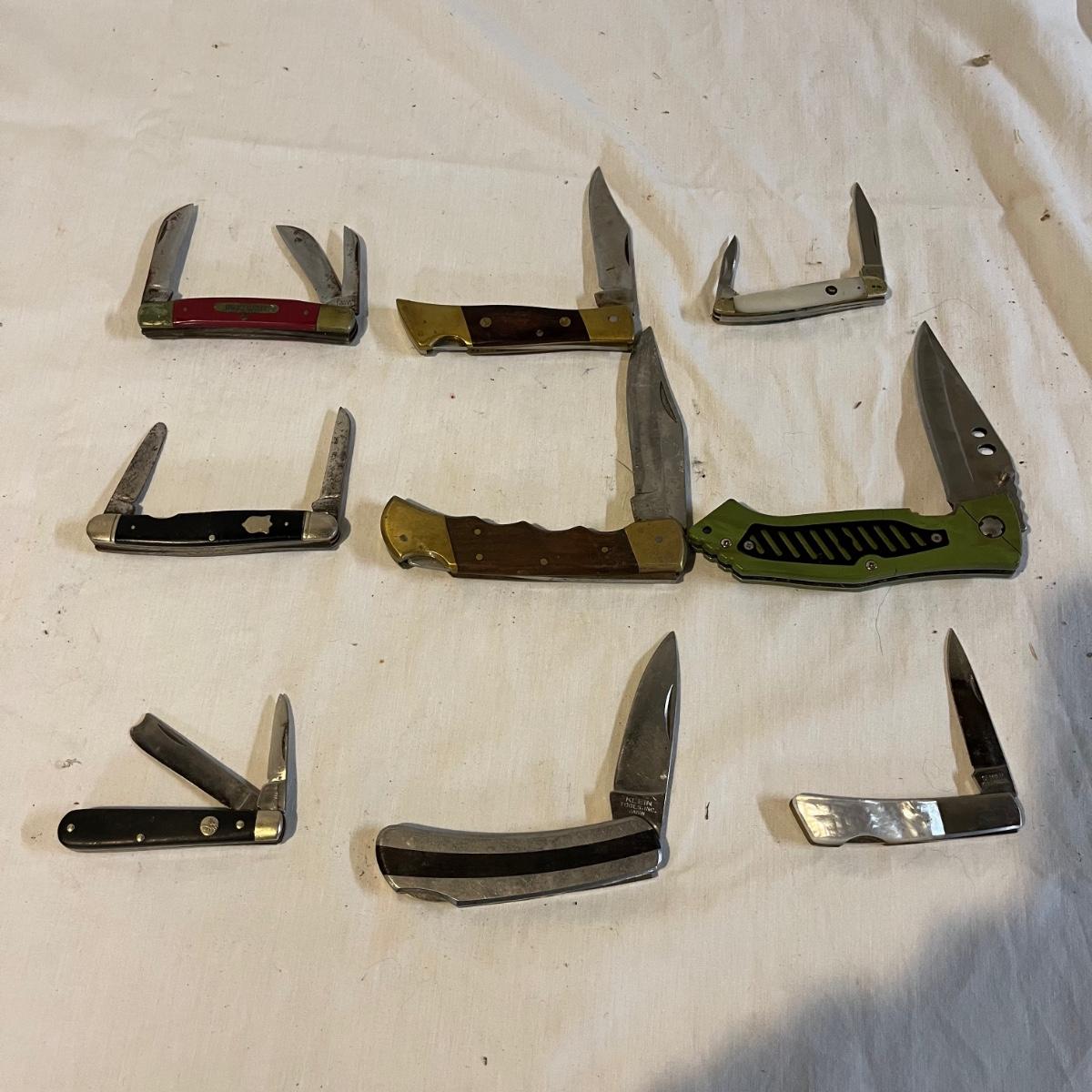 Lot contains Gerber, Böker, Case,Victornox, Buck Creek and more pocket knives. Over sixty knives included in this lot. Longest knife when open measures 8.5”. Lot includes a price guide for pocket knives