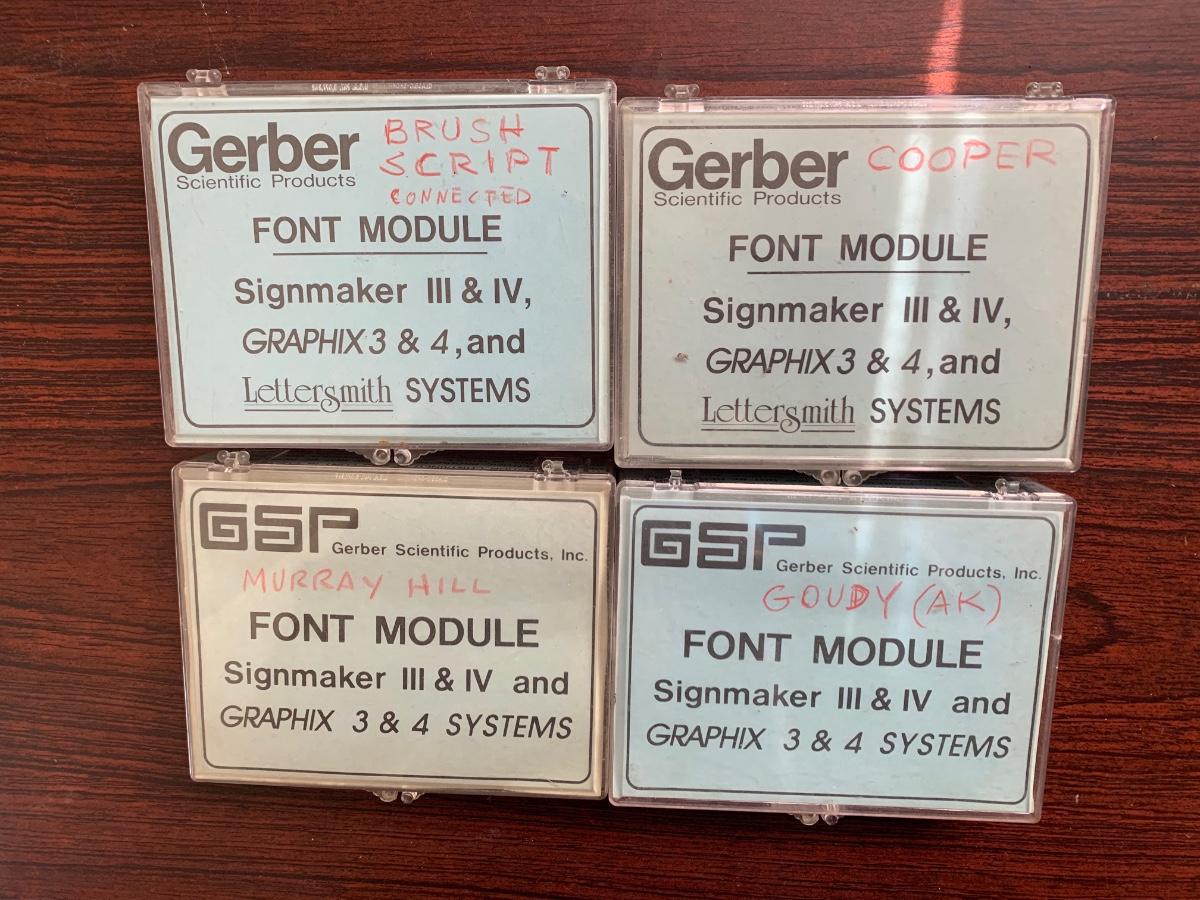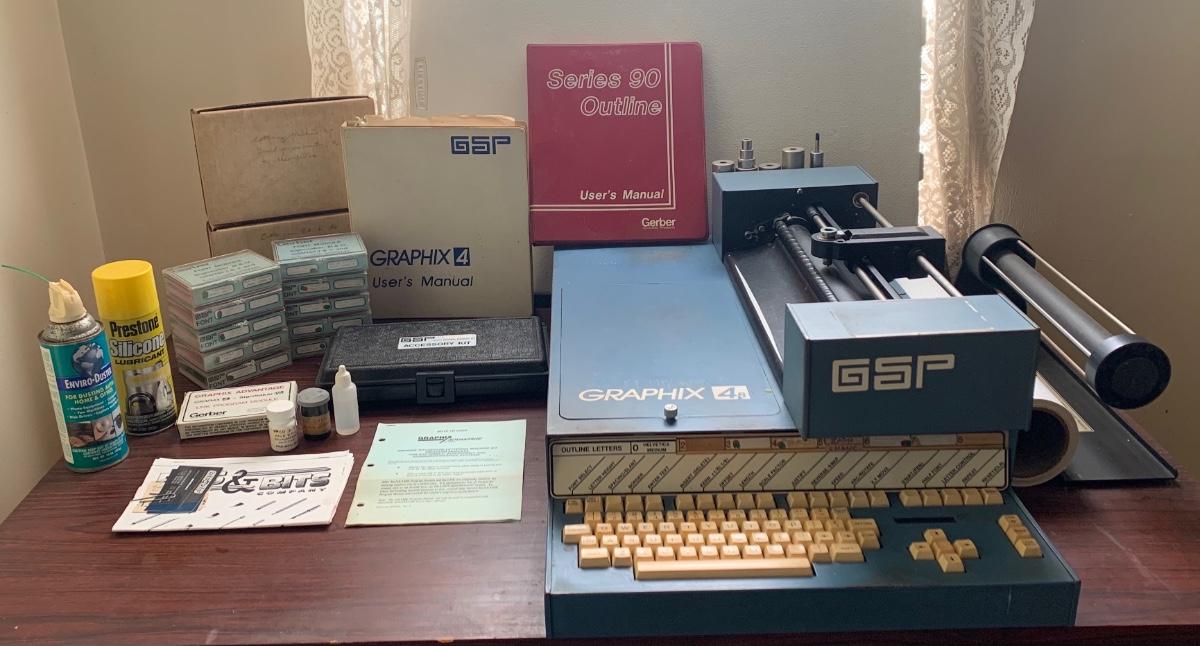 Gerber graphix-signmaker 4-B. Lots of parts, fonts, 2 user manuals. Comes with wooden desk.