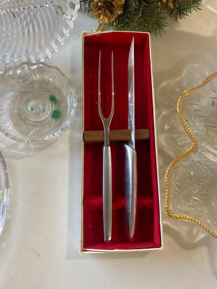 GERBER LEGENDARY CARVING KNIFE AND FORK WITH CHRISTMAS SERVING DISHES & HOLIDAY DECOR