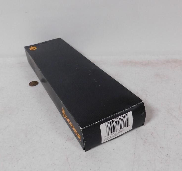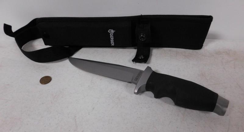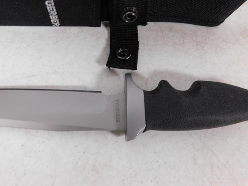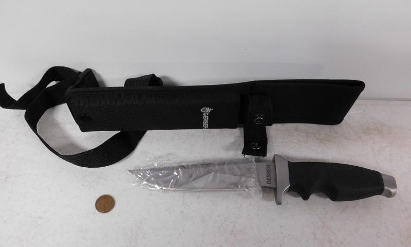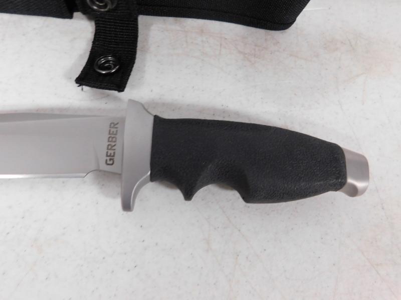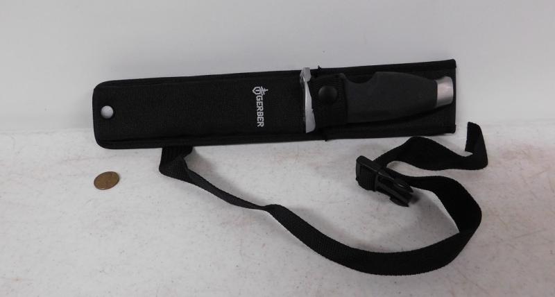 Gerber Steadfast Knife with Sheath is new in box.. Stationary blade. Sheath has boot strap.