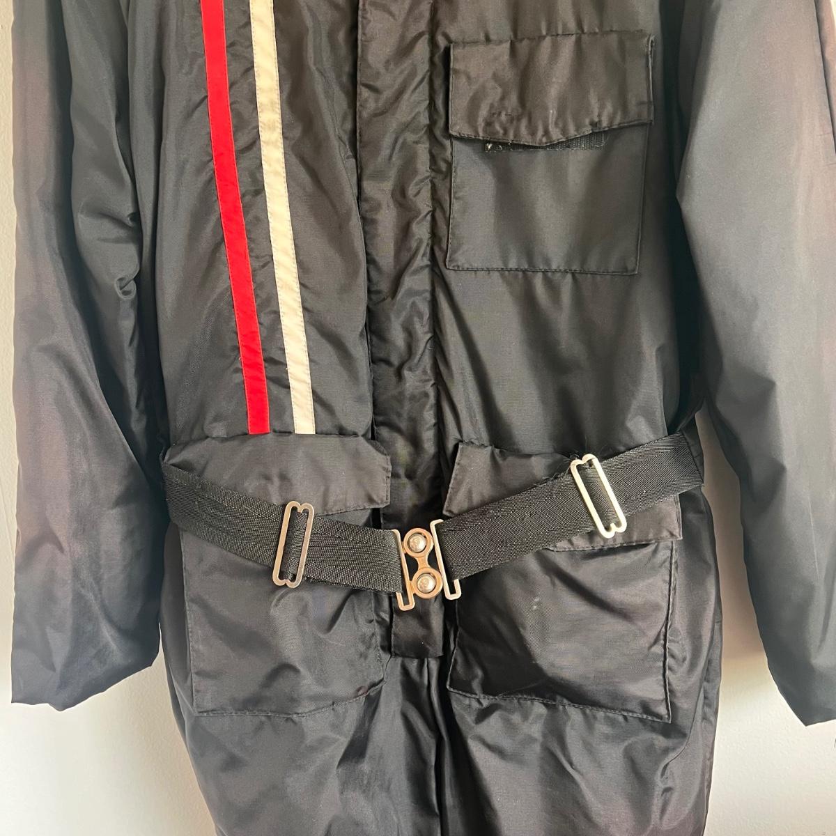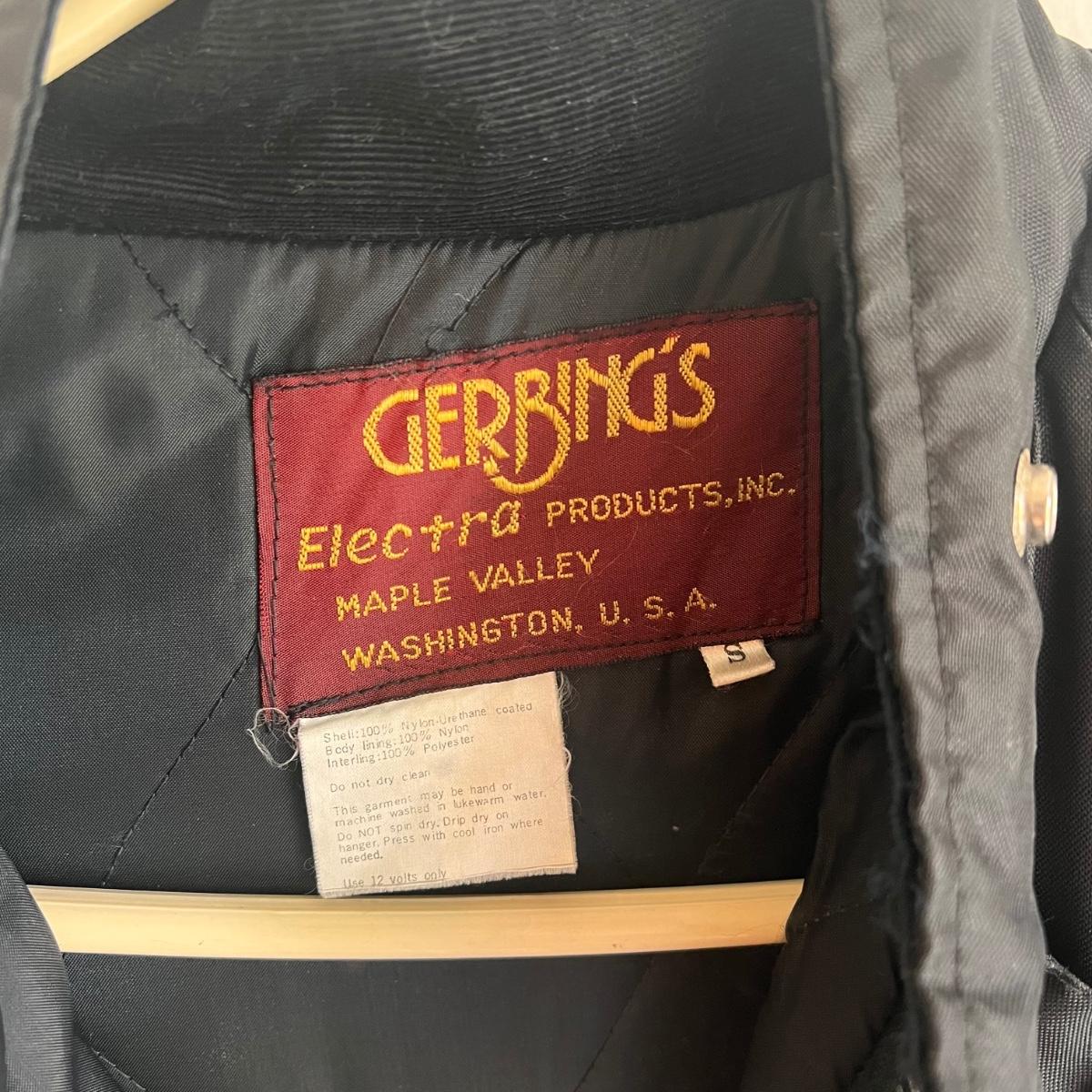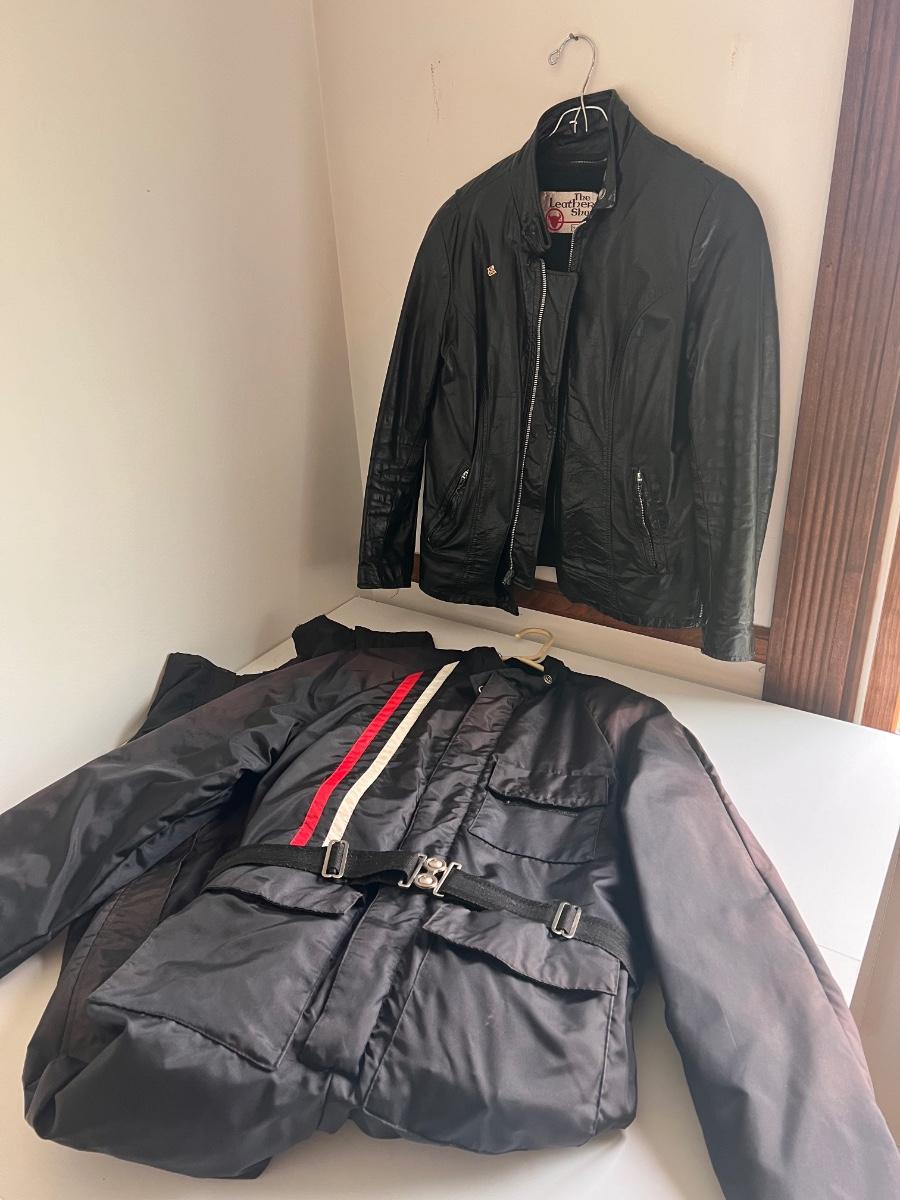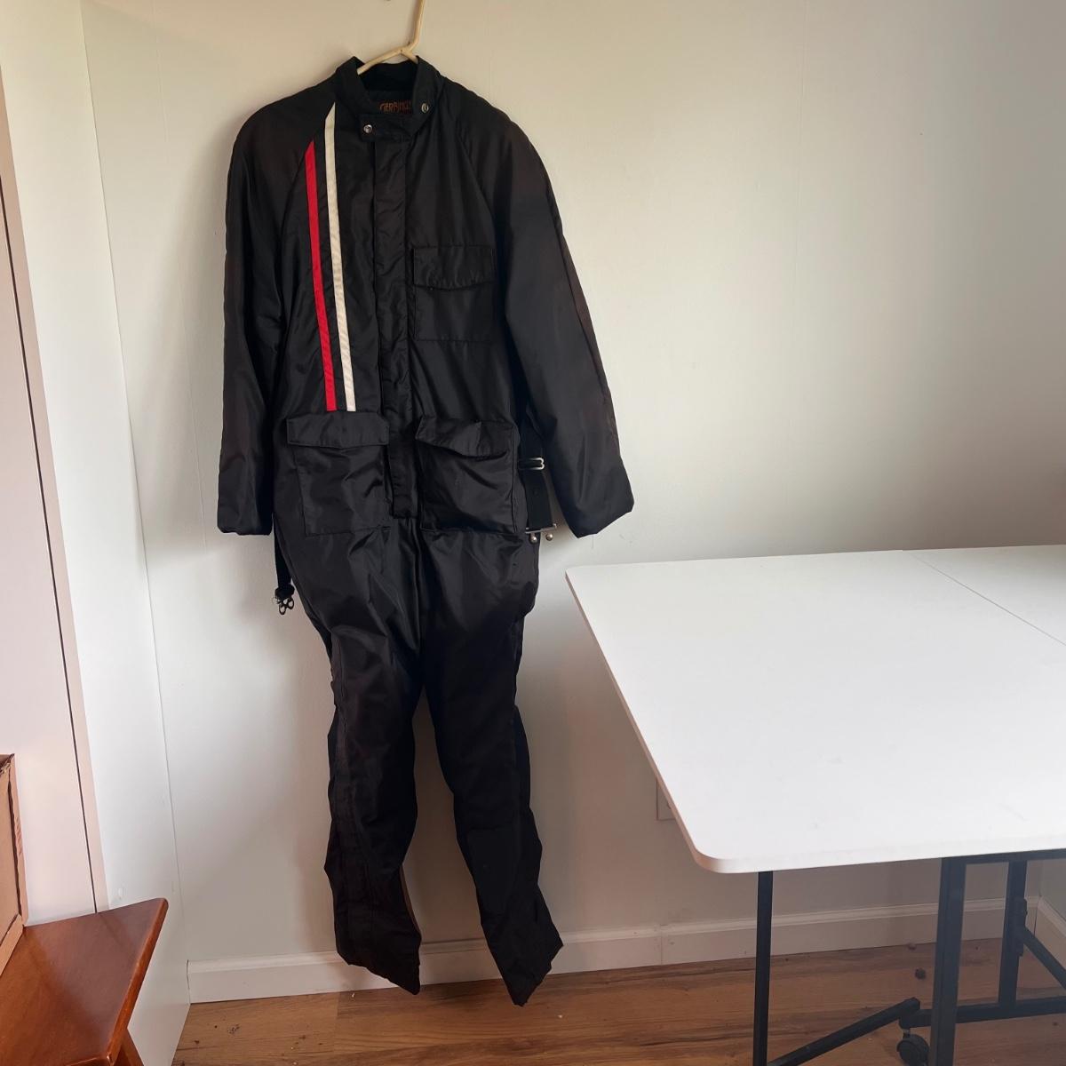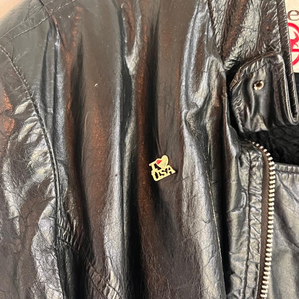 This lot includes a Gerbing’s Electra Products heated motorcycle riding jumpsuit, made in Washington, USA. The tag reads a size small. Plus a leather jacket from The Leather Shop with a small “I love USA” pin. The tag reads size 10. Shipping available.