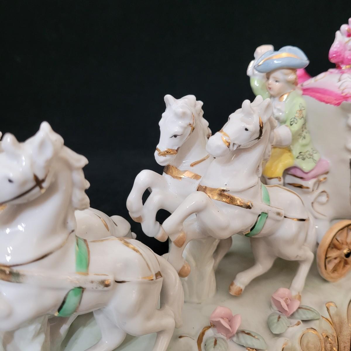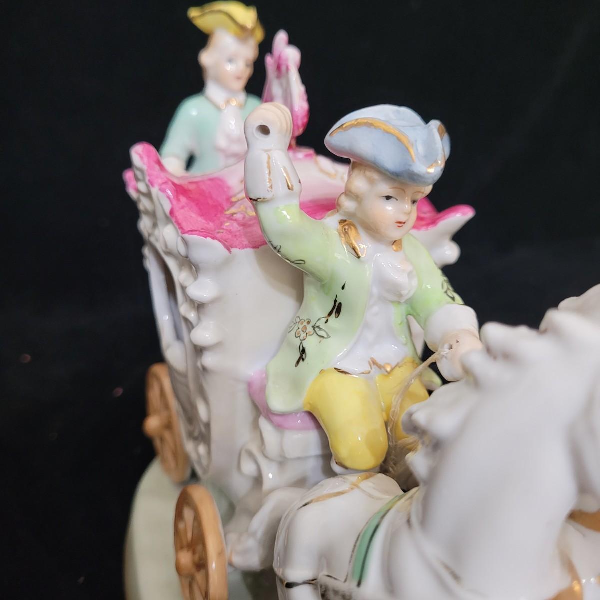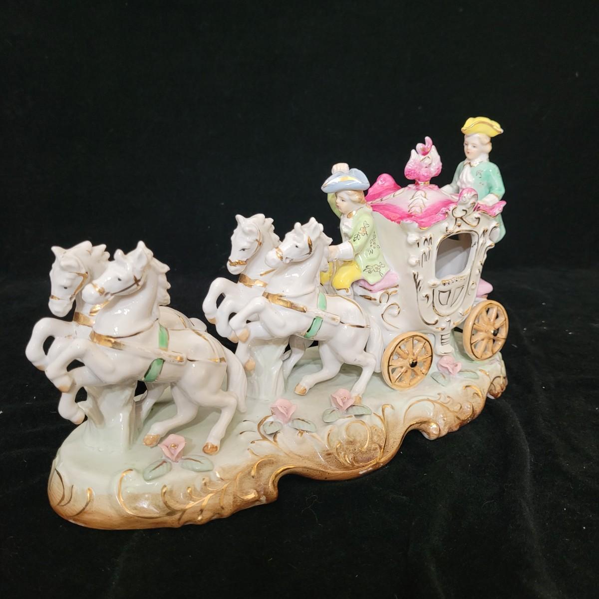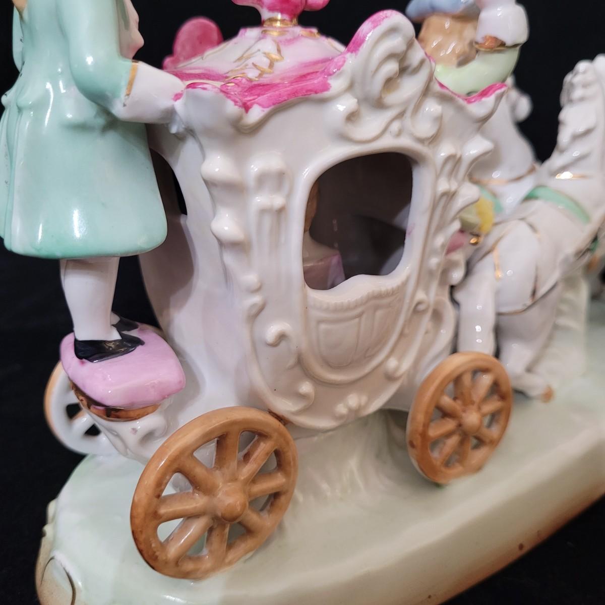 Collection of Baroque style figurines, including two children, an adult man and woman, and a horse drawn carriage holding a young woman. Items are in good condition with normal accumulation of dust that can be easily cleaned. No chipping noted when inspected, but fading of paint throughout (see photos). Carriage piece measures approximately 12"L x5"W x7"H. Shipping available.