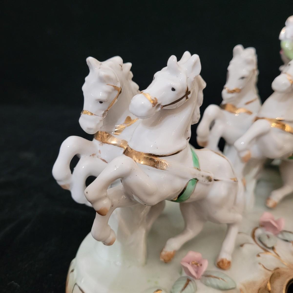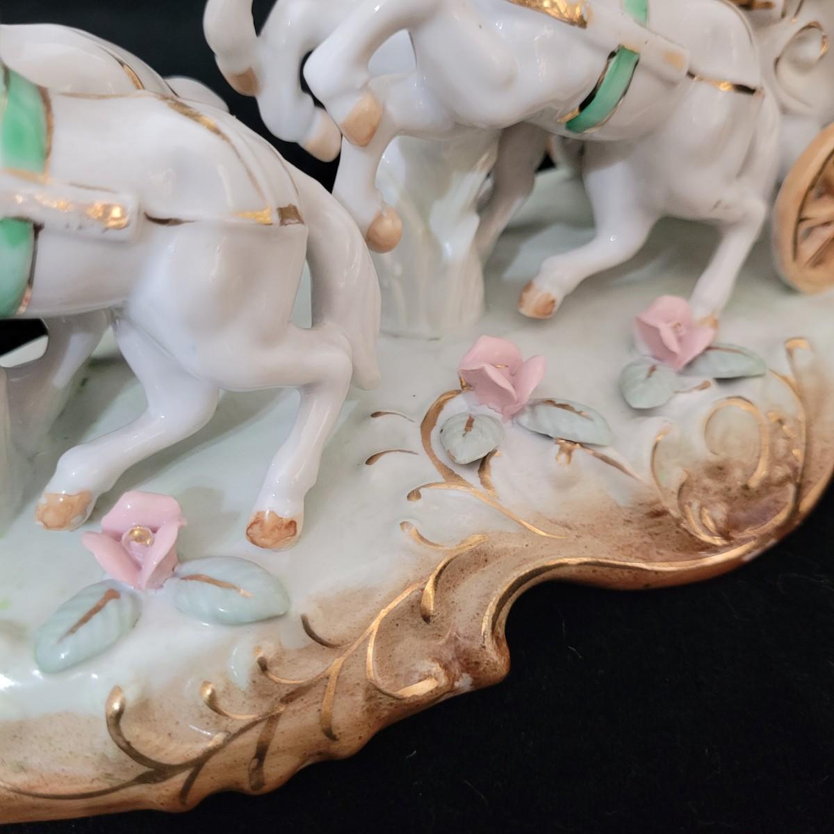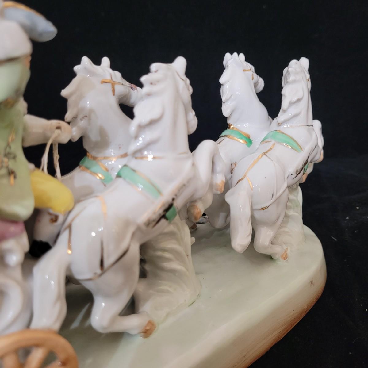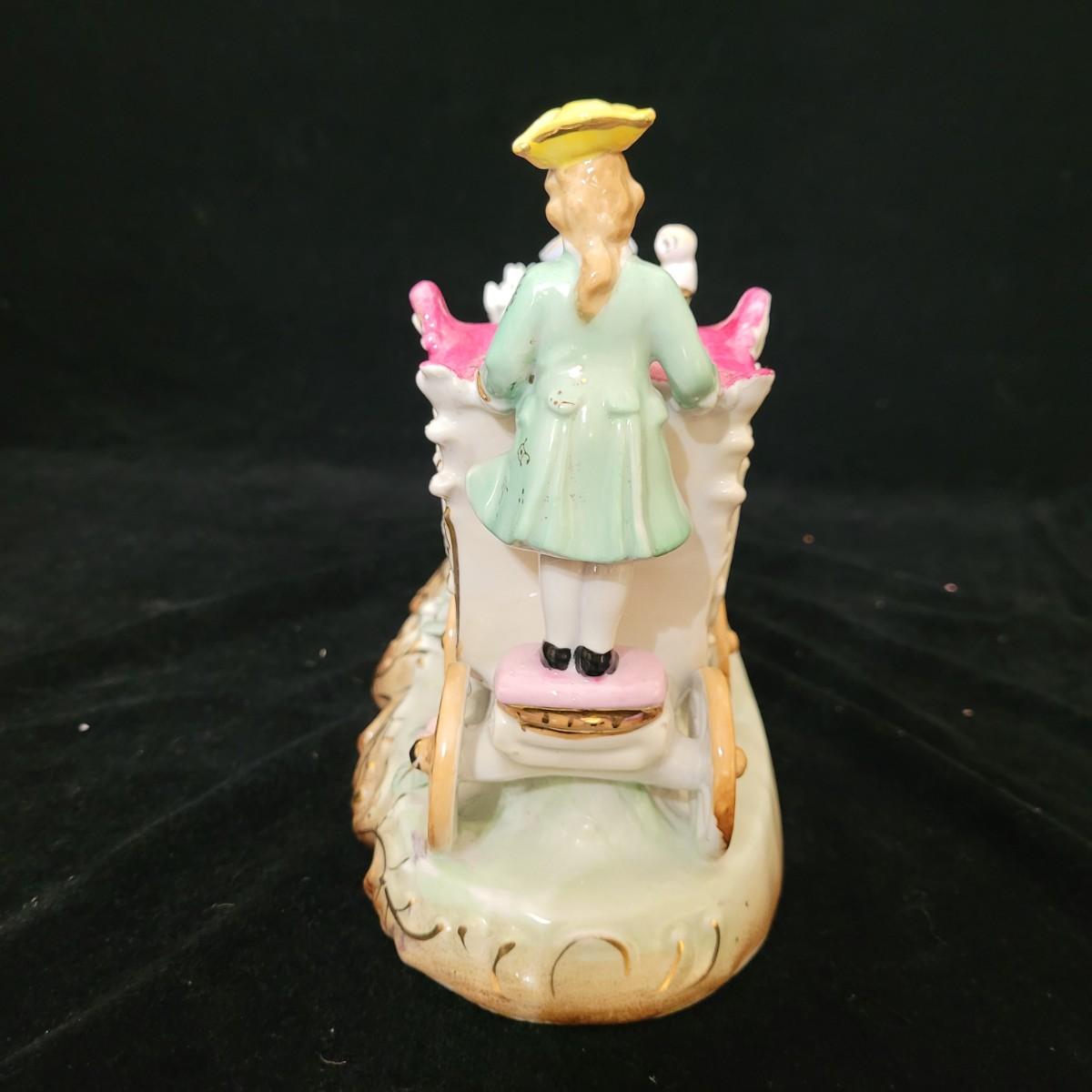 Collection of Baroque style figurines, including two children, an adult man and woman, and a horse drawn carriage holding a young woman. Items are in good condition with normal accumulation of dust that can be easily cleaned. No chipping noted when inspected, but fading of paint throughout (see photos). Carriage piece measures approximately 12"L x5"W x7"H. Shipping available.