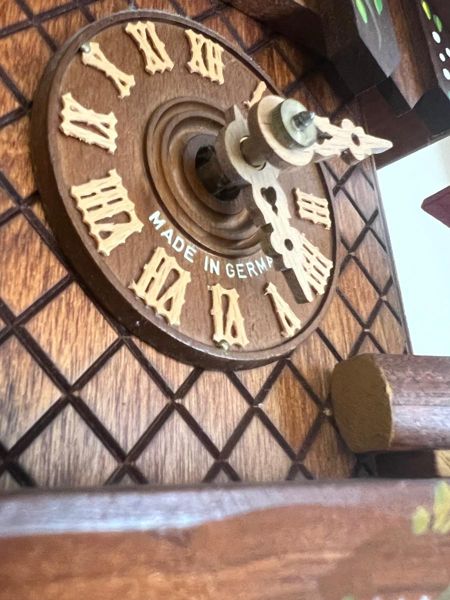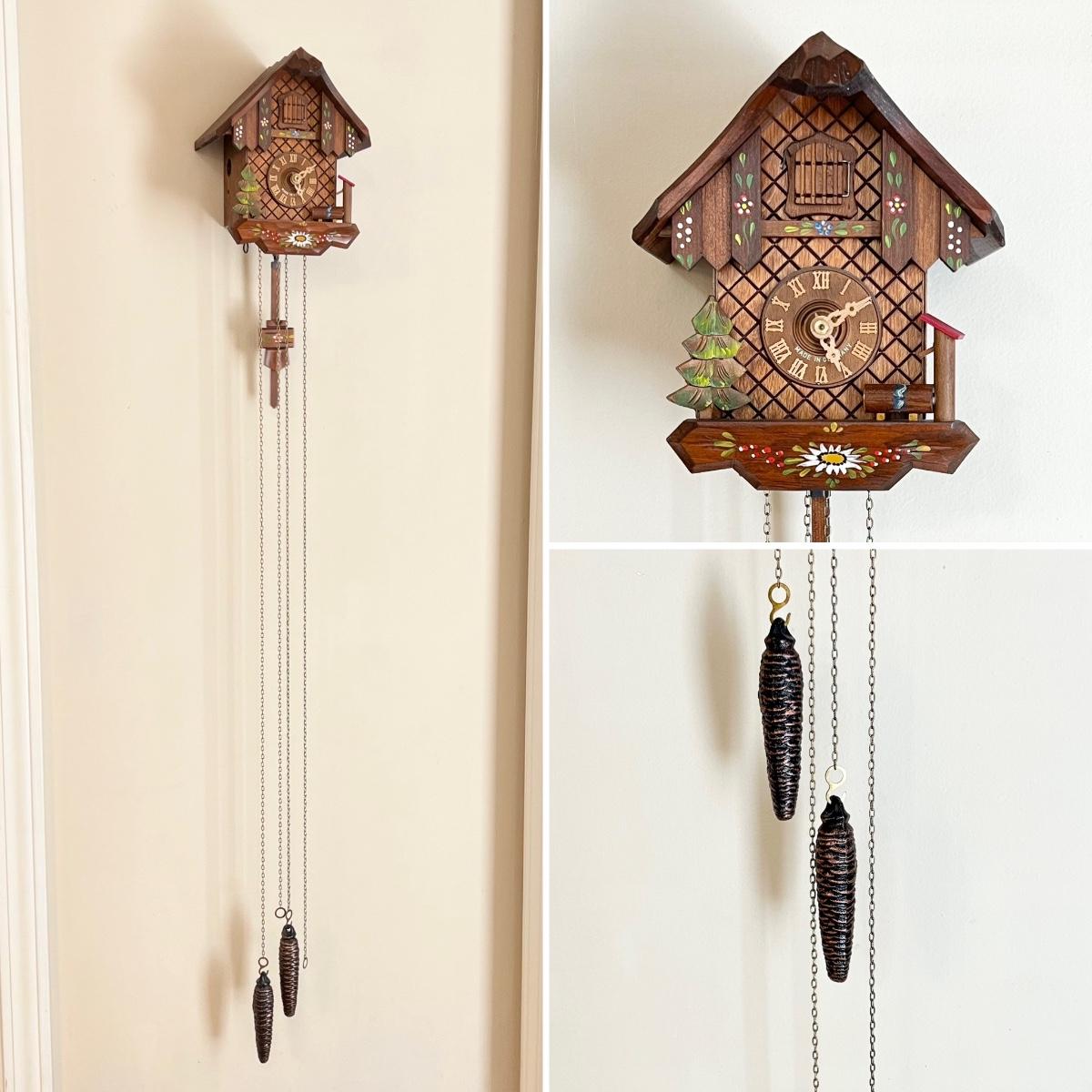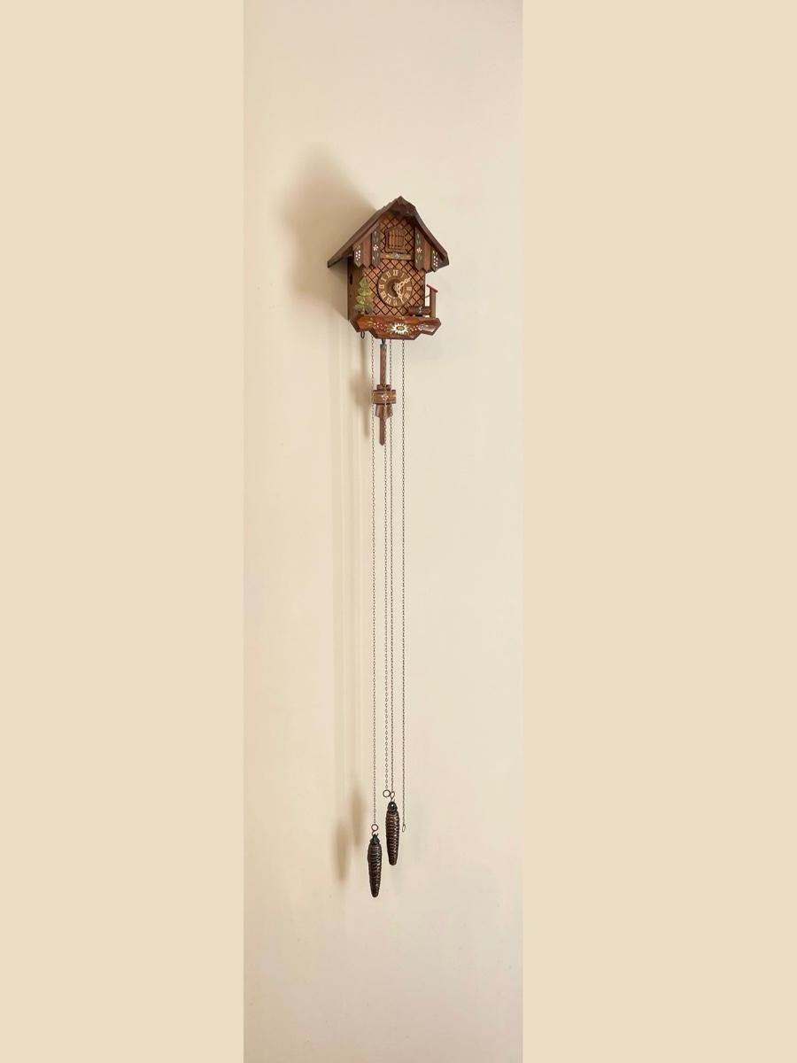 Keeps time & chimes with cuckoo bird coming out top door on the hour & half hour ~ No brand found ~ Entire item = 80" H x 7" W x 6.25" D ~ Just house = 9" H