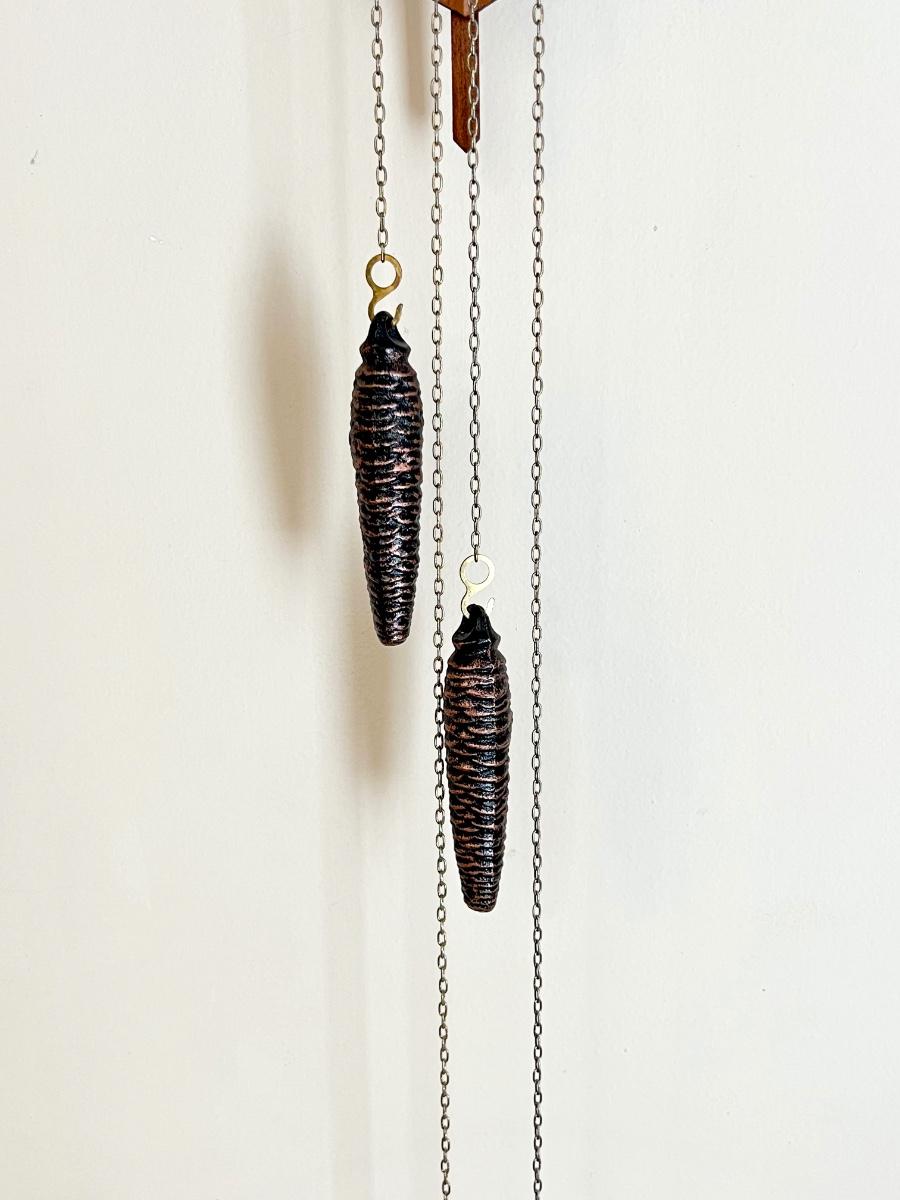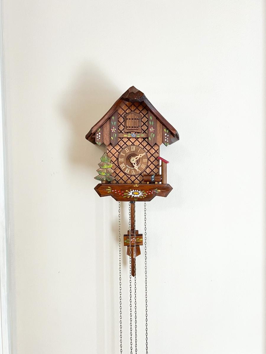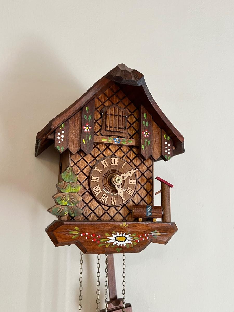 Keeps time & chimes with cuckoo bird coming out top door on the hour & half hour ~ No brand found ~ Entire item = 80" H x 7" W x 6.25" D ~ Just house = 9" H