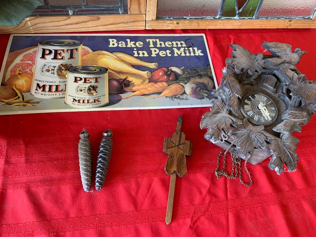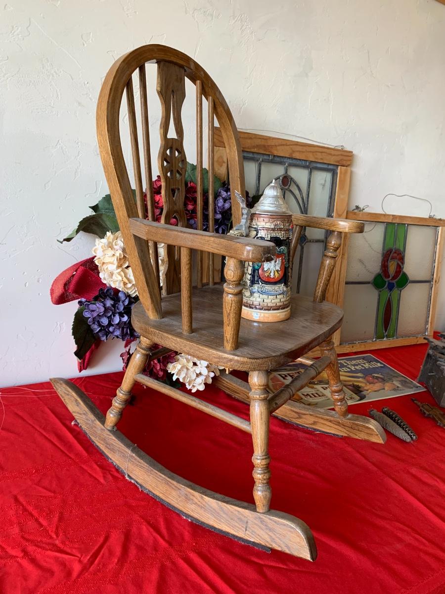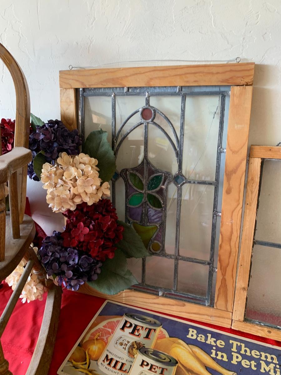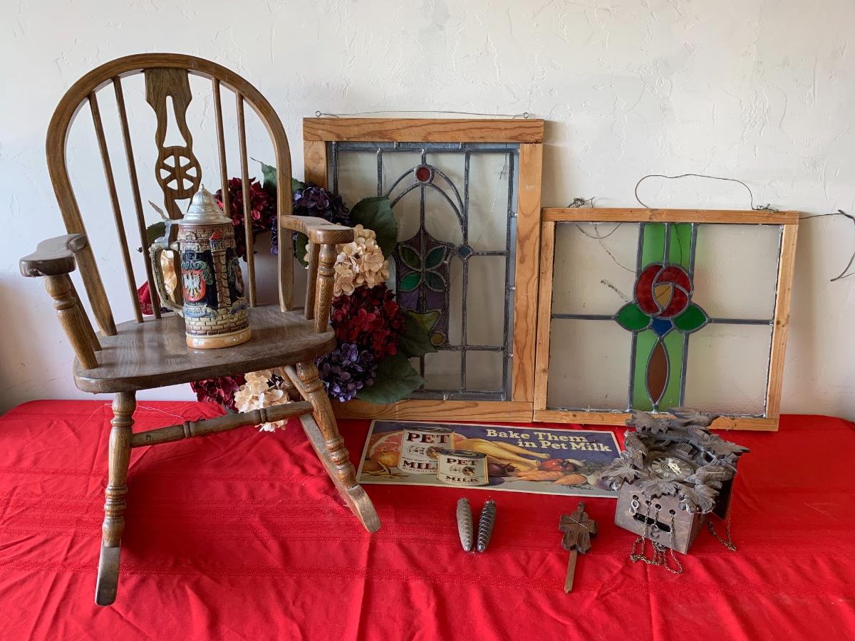 Country cottage inspired items including stained glass pieces, a coocoo clock, a rocking chair and more. Perfect for any cottage decor!
