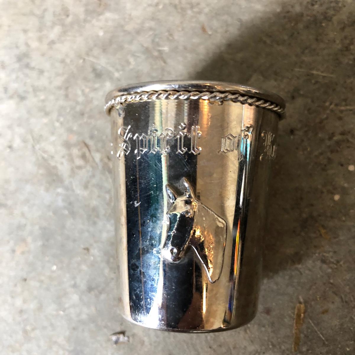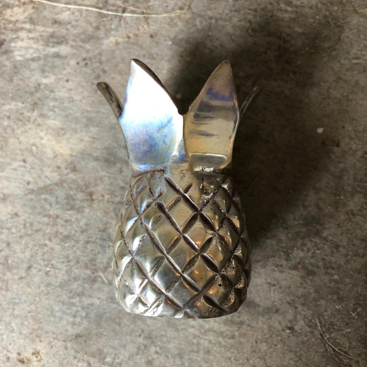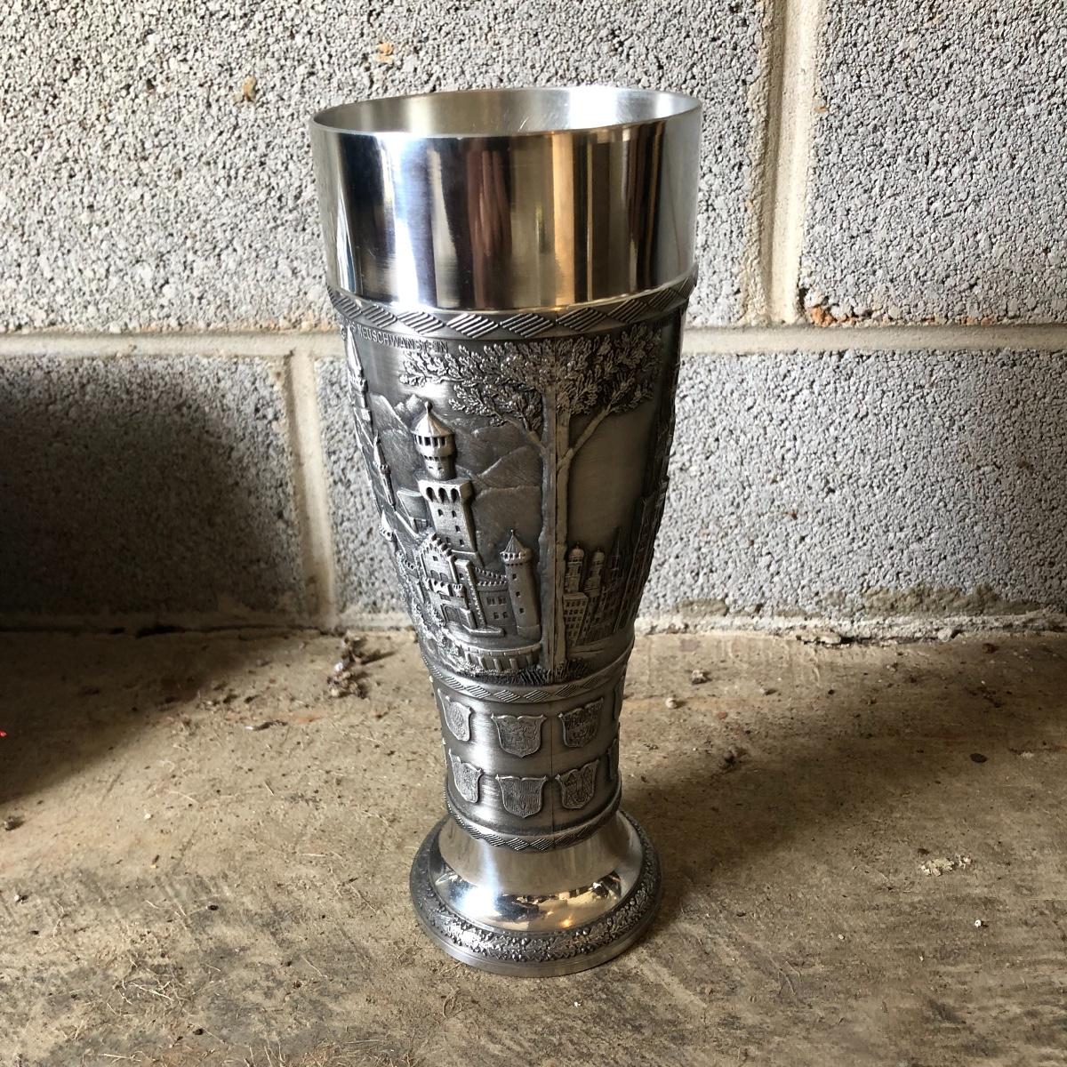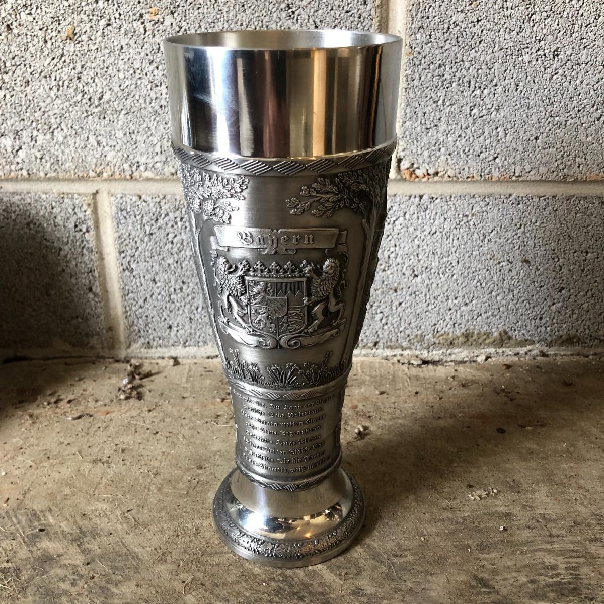 Lot includes a metal German cup, picture frame, shot glass, pineapple, Norwegian ornament and a bird ornament. Cup measures 3.5”D x 9” tall.