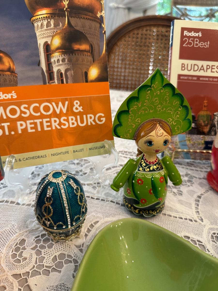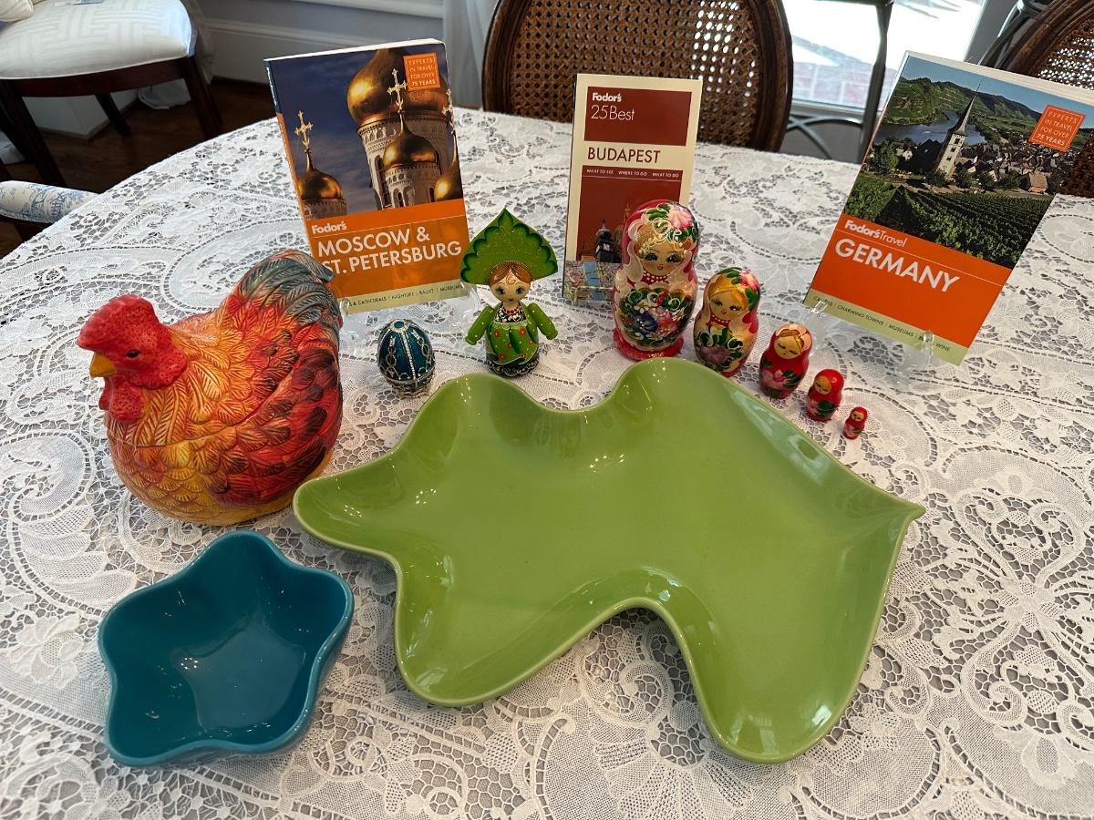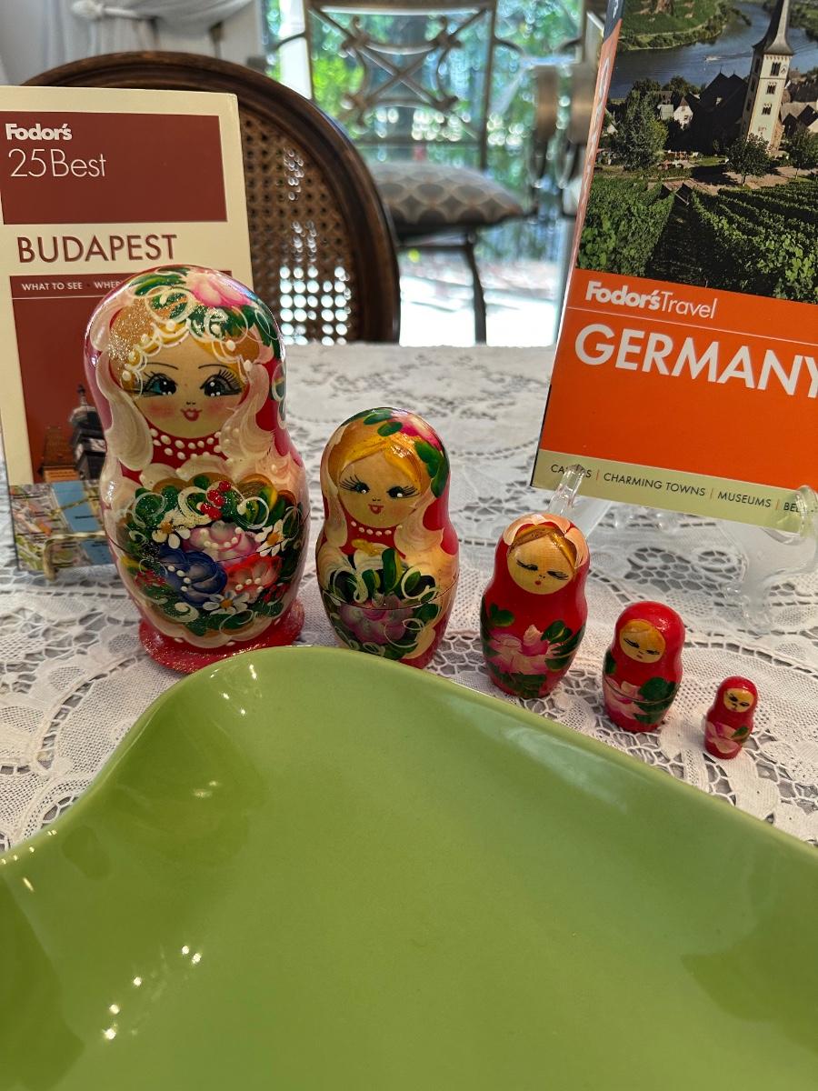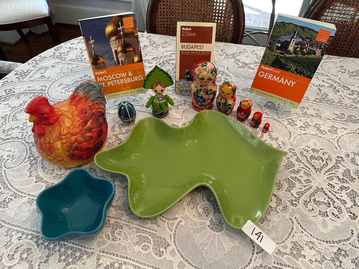 GERMAN NESTING DOLL, TRAVEL BOOKS, MISC HOME DECRO AS PICTURED