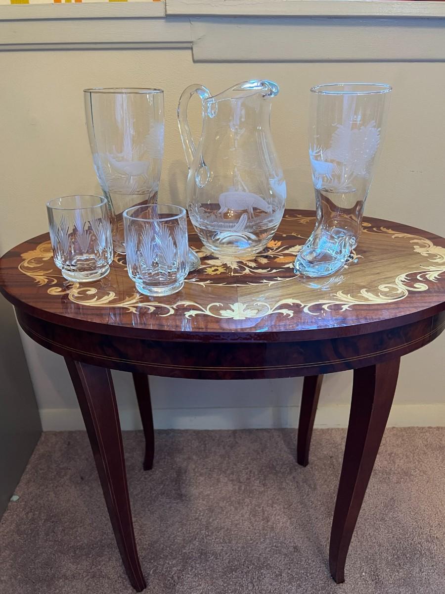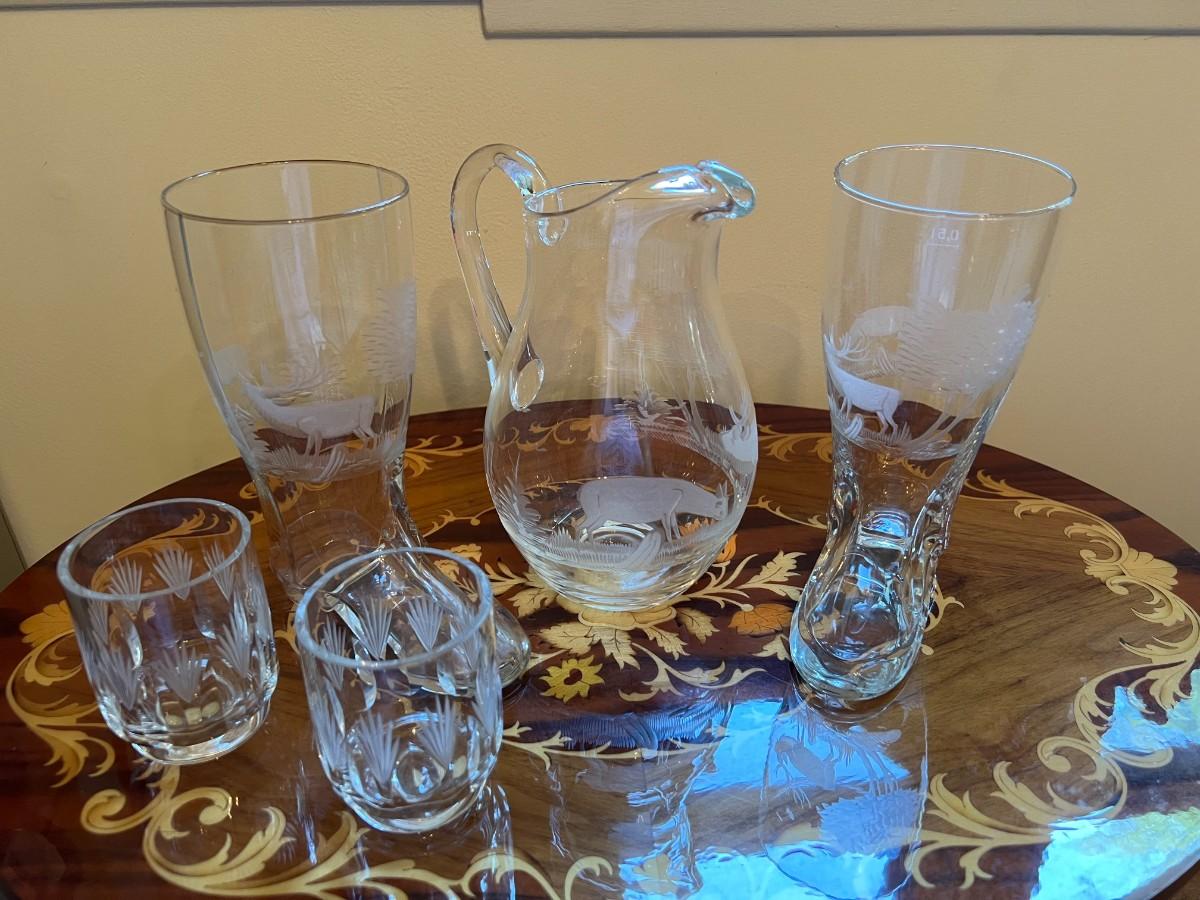 German Etched Beer Pitcher and Boot Glasses Lot- *Table Sold Separately*
