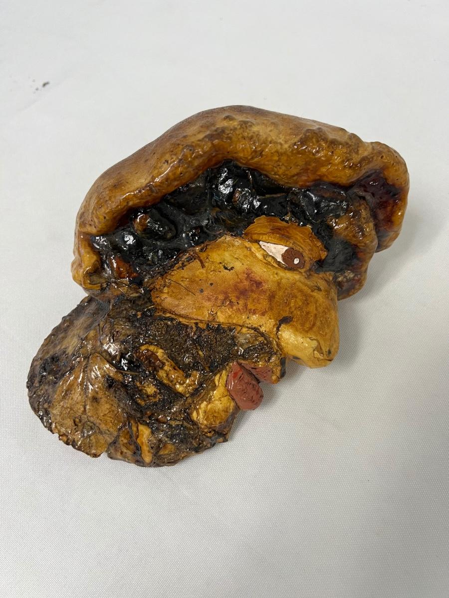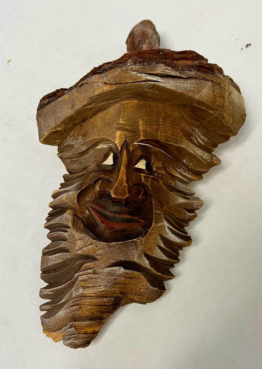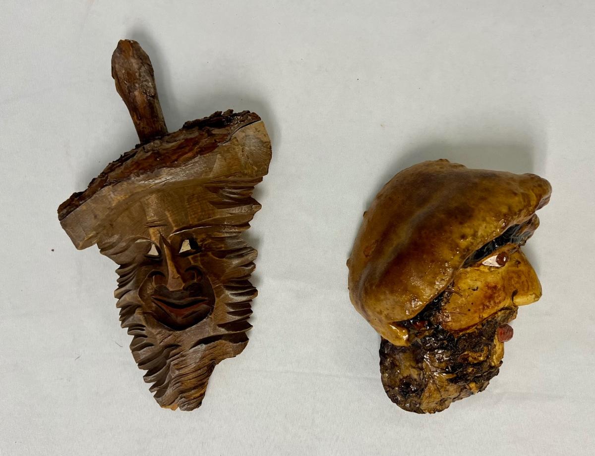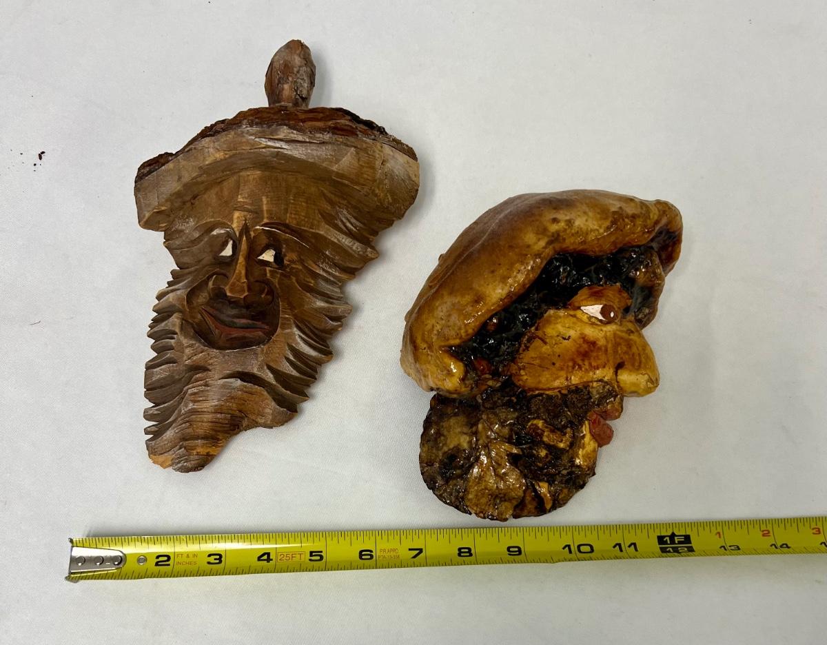 Two pieces. One is carved live-edge pine, and the other is believed to be fungus. Both are hand painted. Measurement of largest: 11"L. [ML]