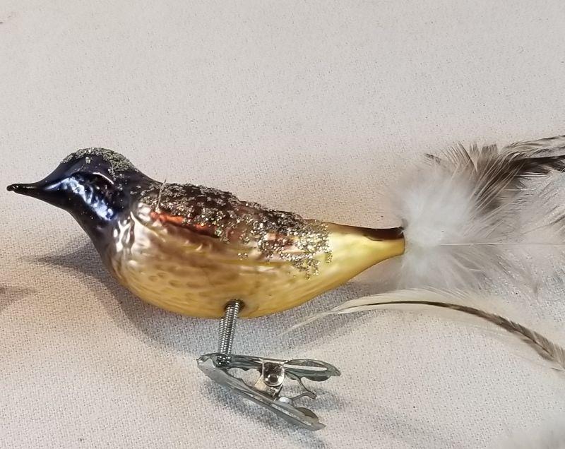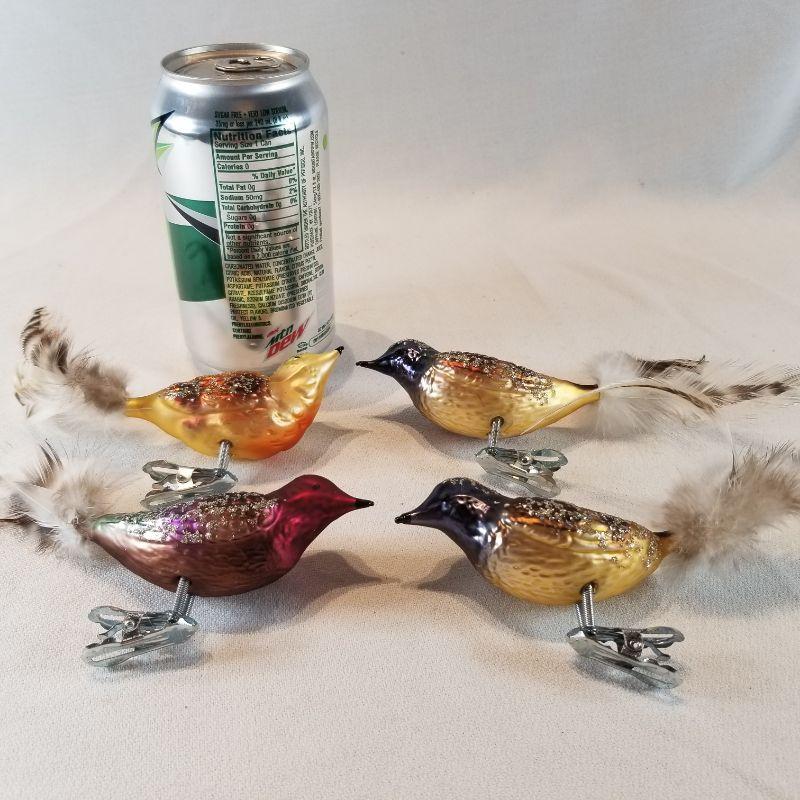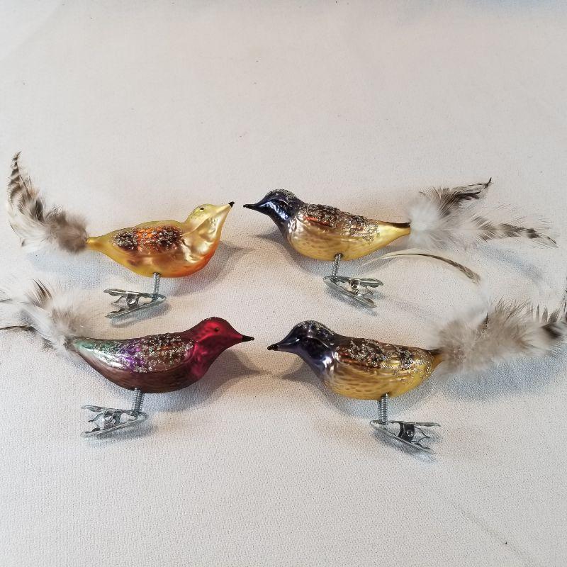 Set of 4 hand-blown glass bird ornaments with real feathers. Made in Germany. The bird ornaments clip onto your tree. Very whimsical. In very good condition, no cracks or chips.