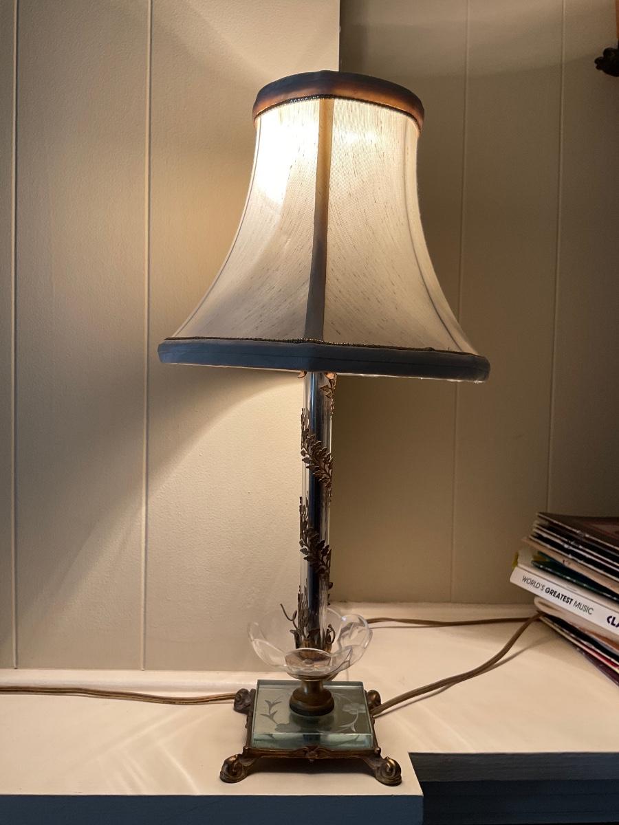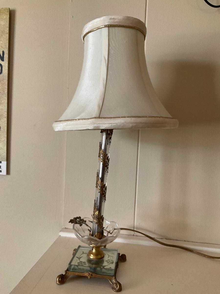 Set of 2 German made table lamps with gold leaf decoration and glass bottom with cream shades.