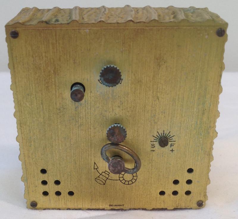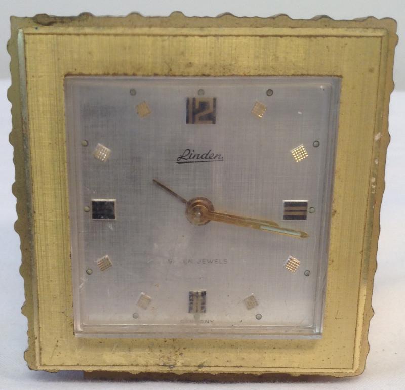 German Linden Seven Jewel Wind table clock. Material: Gilt coated metal. Measurement approximate: 3 x 3 Inches. Shipping cost: $18.00 excluding Hawaii, Alaska & California