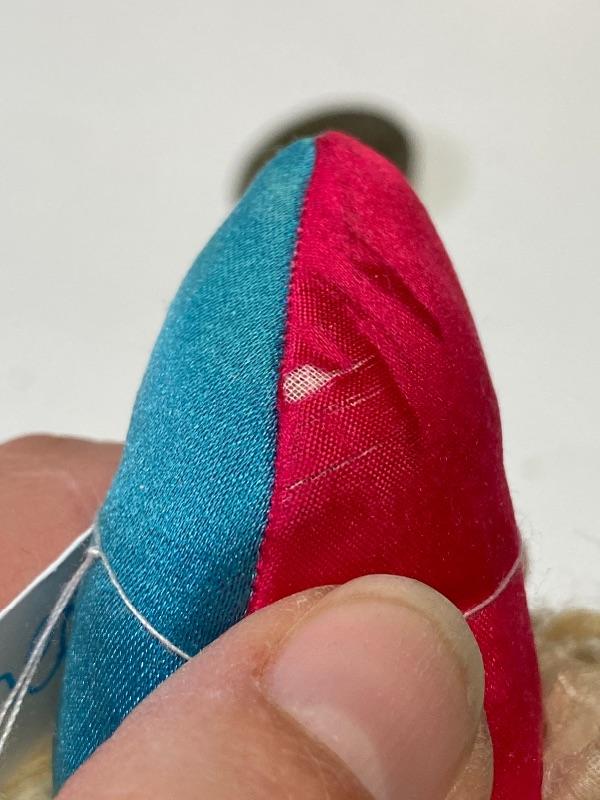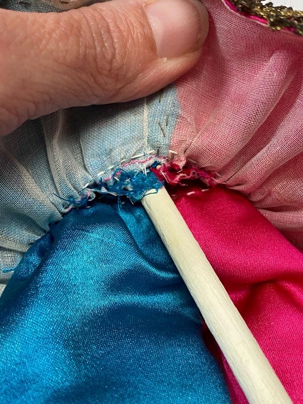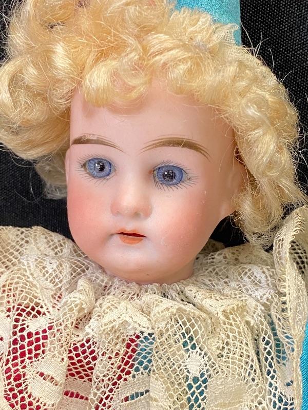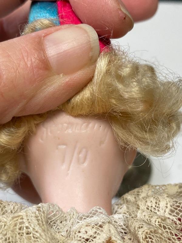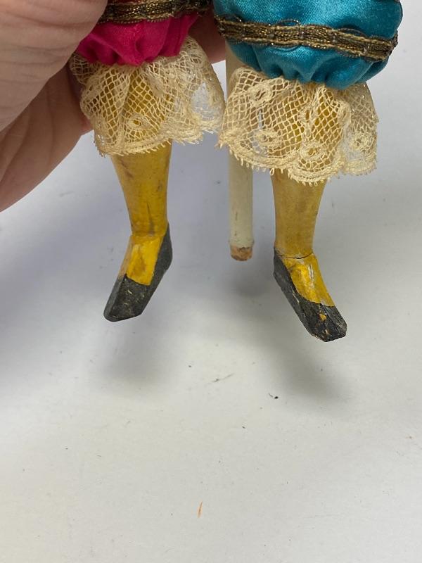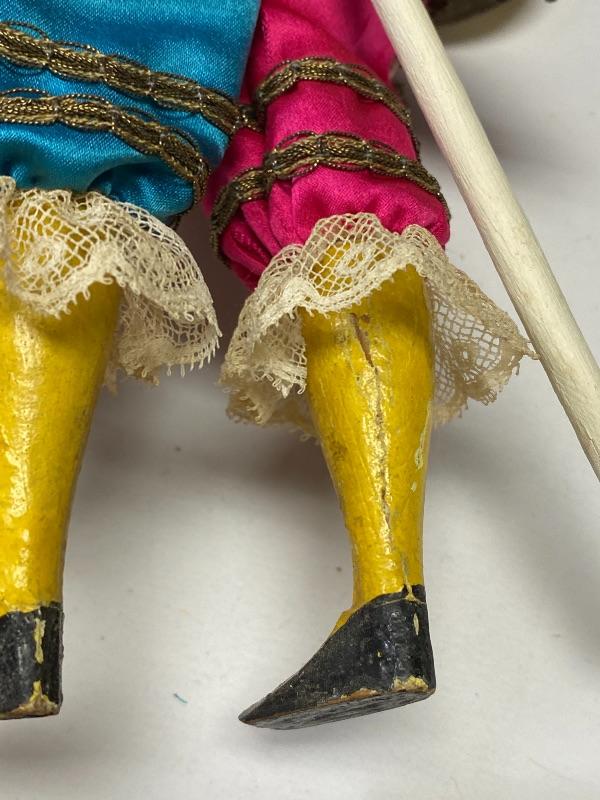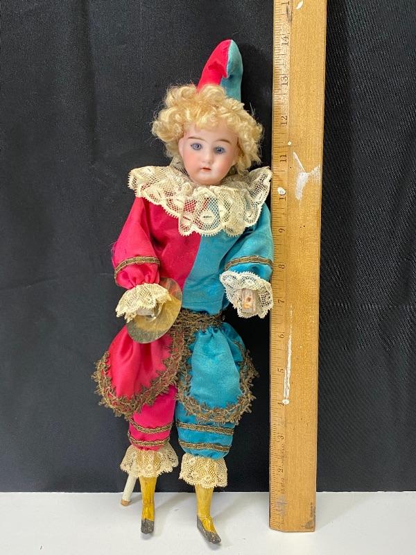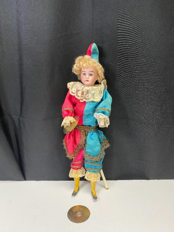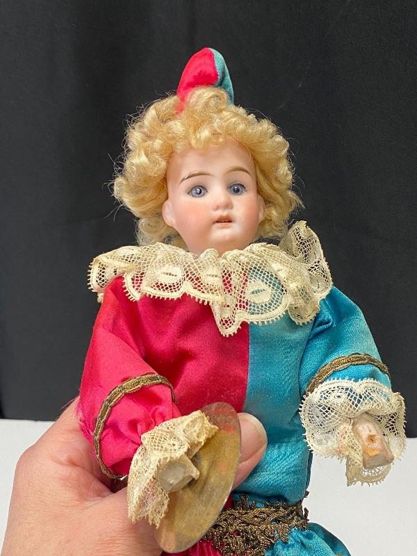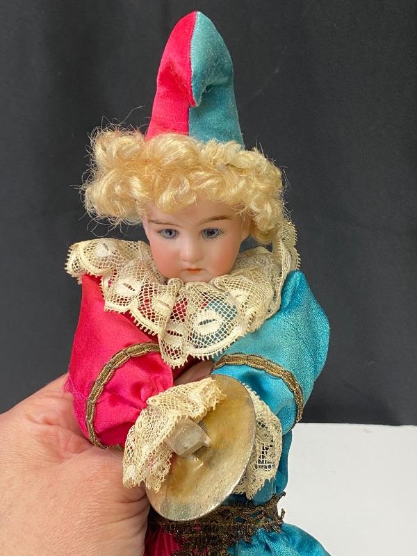 Mechanical jester clown doll. Squeeze his body and he plays the cymbals and bends forward. Marked porcelain head "Made in Germany 7/0". Glass eyes are fixed. Has a stick attached to his back, believe it is part of a stand or added, not original, it seems to be glued on to clothes. One cymbal needs to be reattached. About 14" tall. There is a small tear in back of hat.