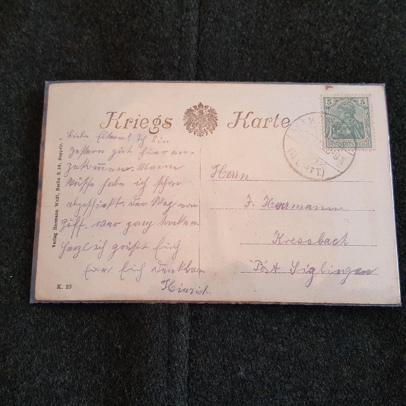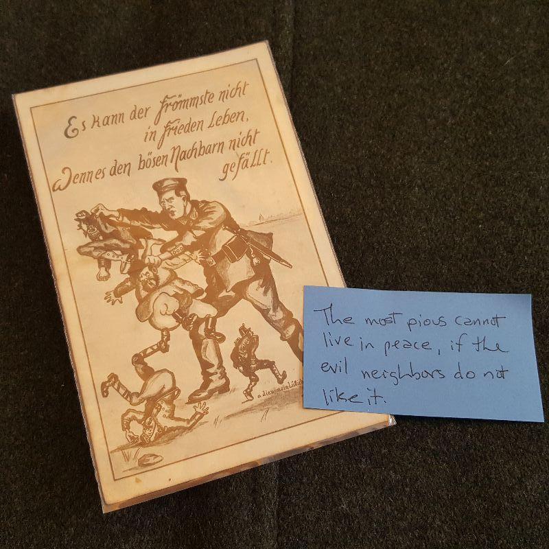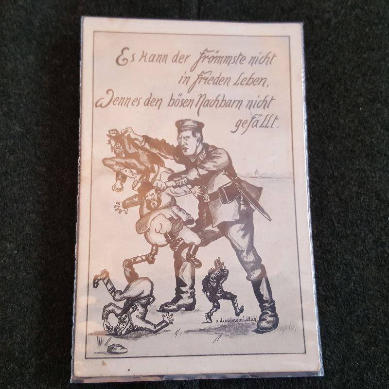 The auction lot is for a German Nazi WW2 Propaganda Postcard. The card translates to: The most pious cannot live in peace, if the evil neighbors do not like it. This card is written upon and postmarked but we can decipher the German city, it appears to have been mailed in 1940. The card is in good condition for its age and service.