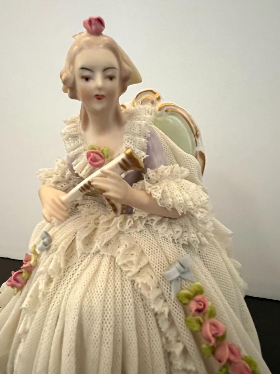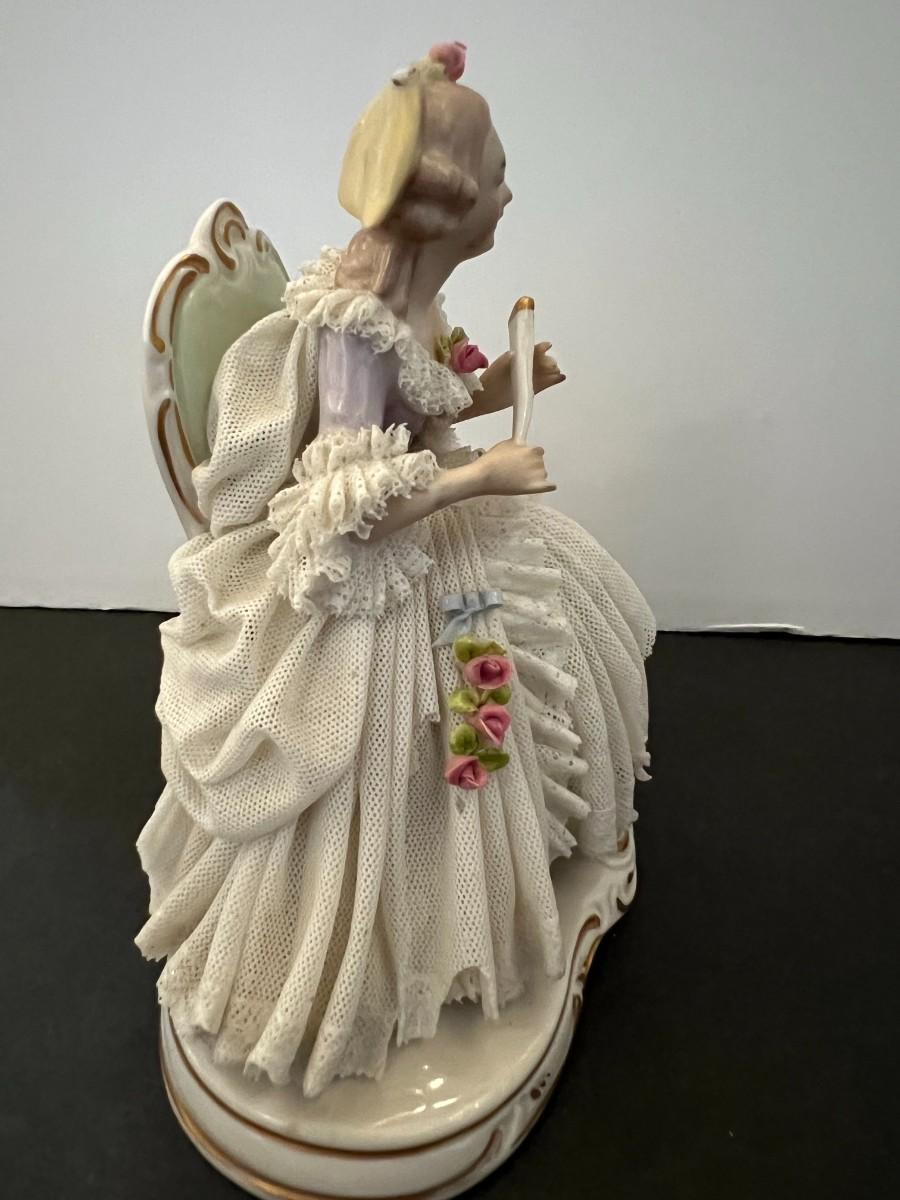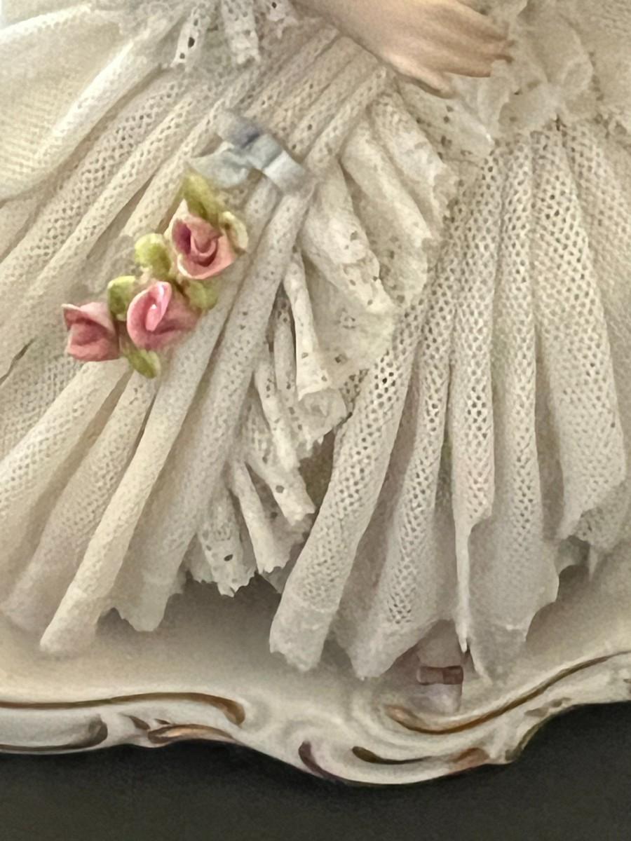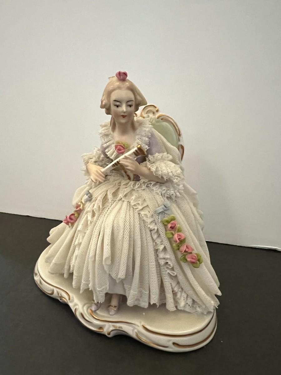 Made in Germany porcelain lady with layers of intricate and delicate porcelain lace. Marked. 7" tall x 6" wide