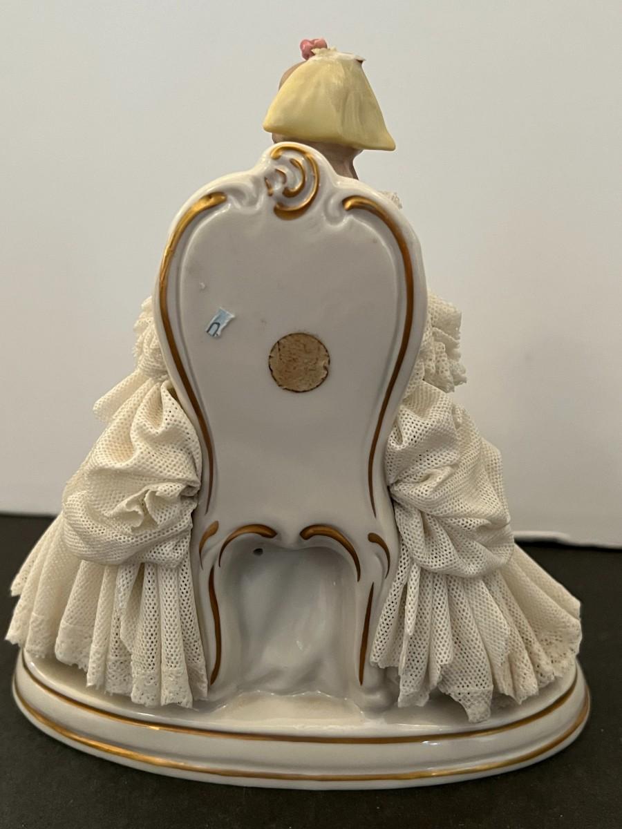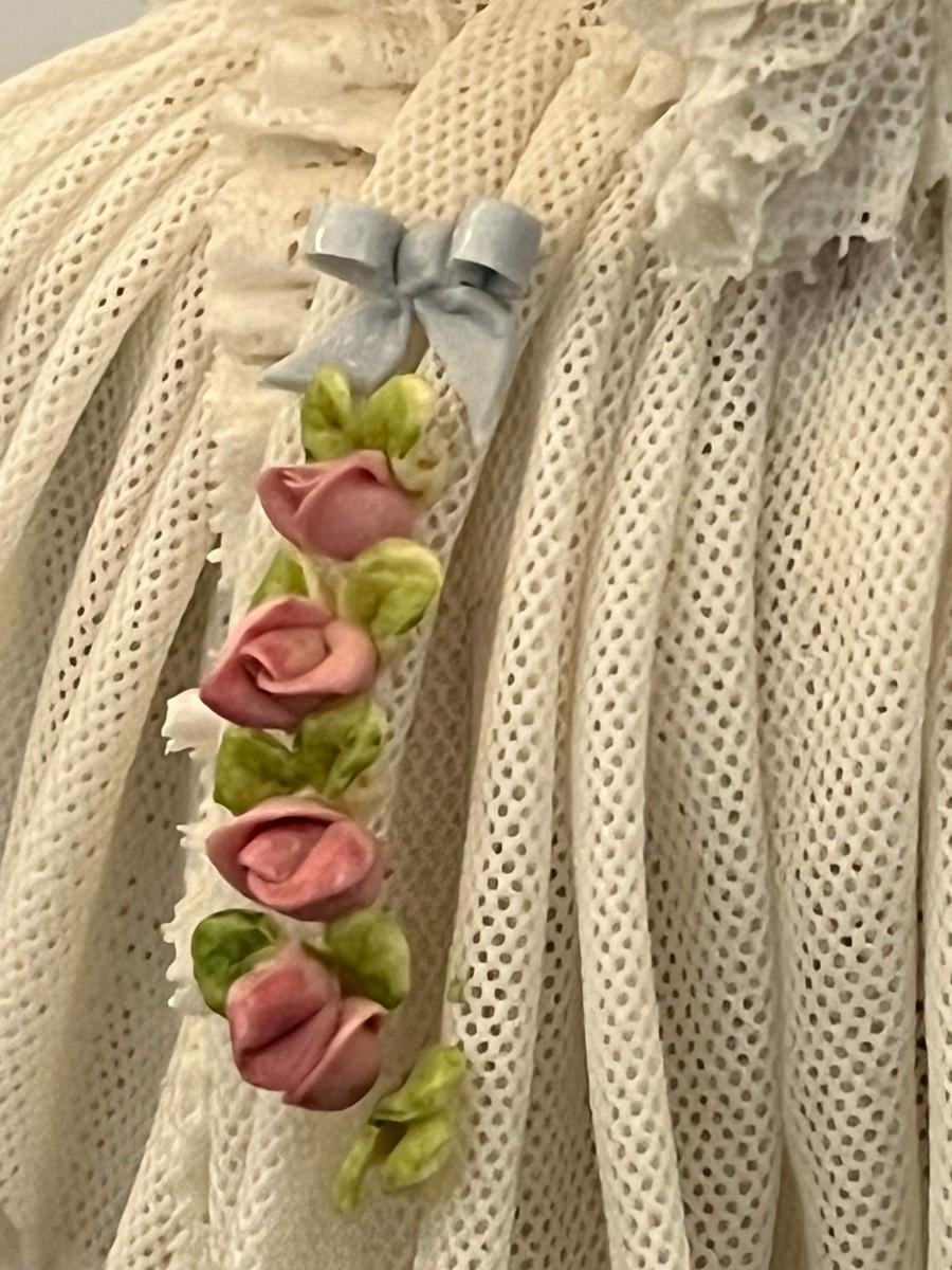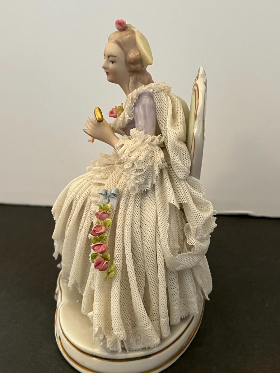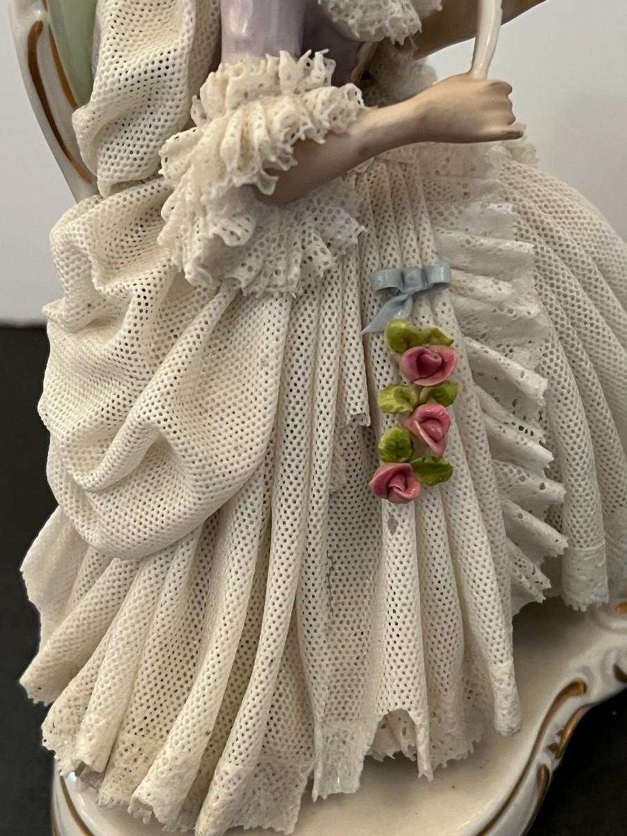 Made in Germany porcelain lady with layers of intricate and delicate porcelain lace. Marked. 7" tall x 6" wide