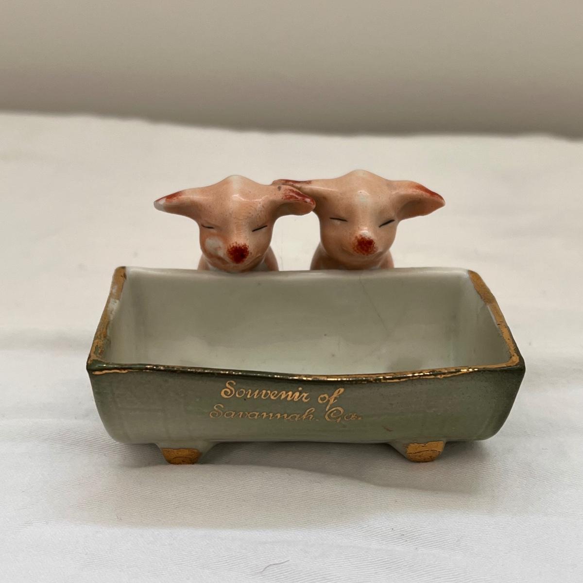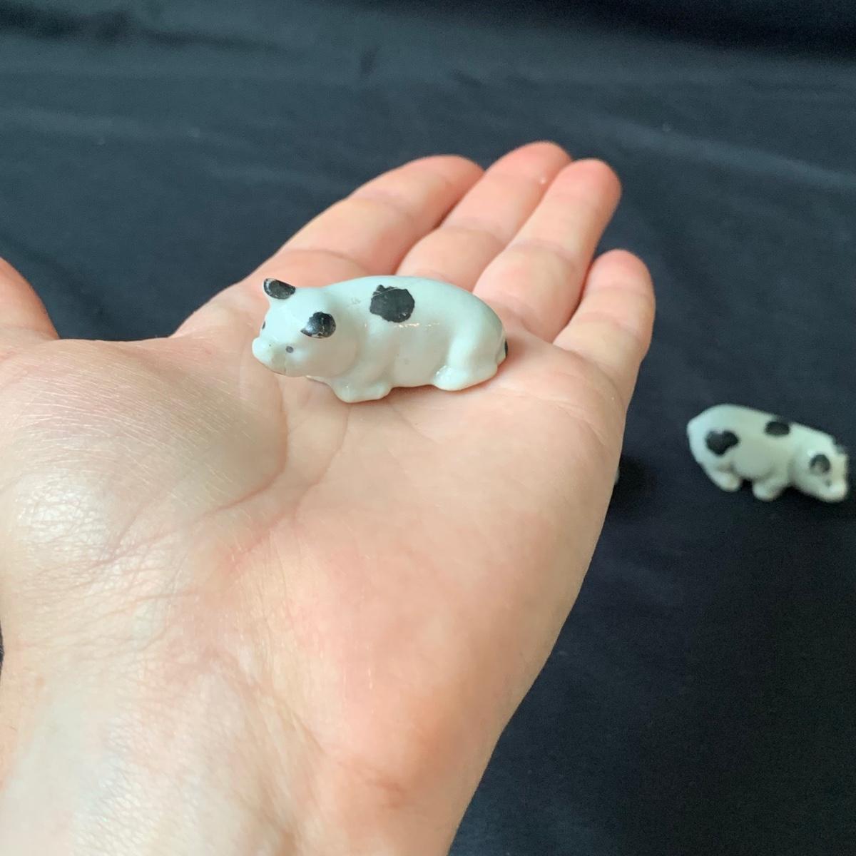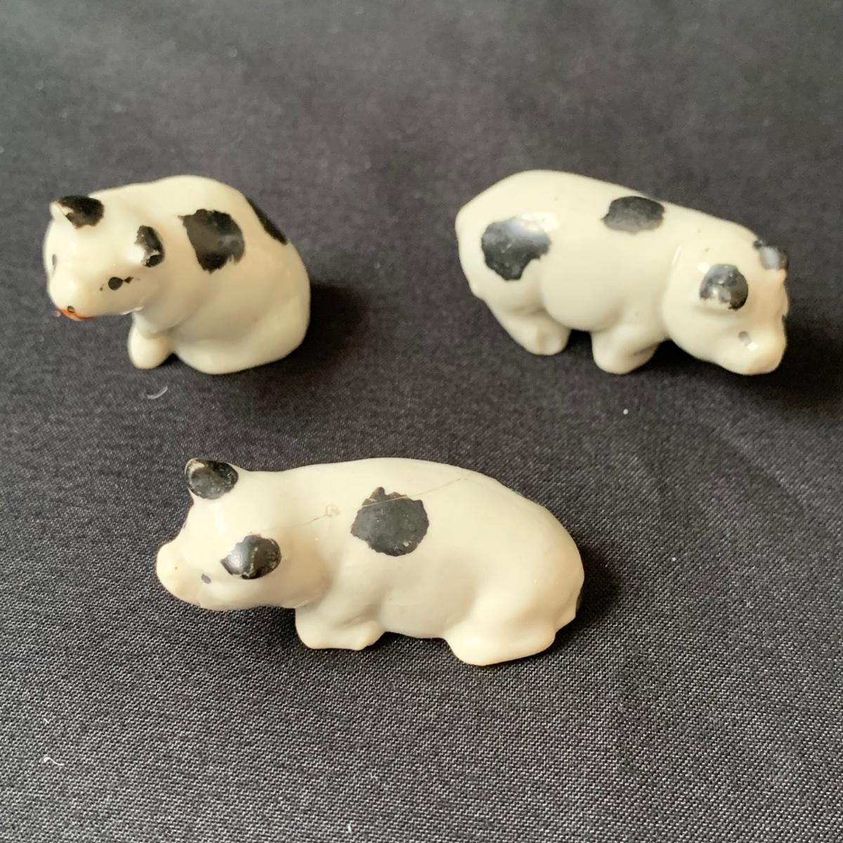 This lot includes six porcelain pig figurine collectibles. The larger three pieces appear to be made in Germany. The largest piece is "The Heavenly Twins," measuring 4" x 3.5"H. Three small black and white pigs are included as well. One has a small crack on its back. Shipping available.